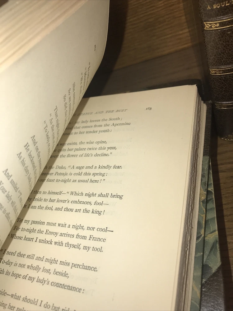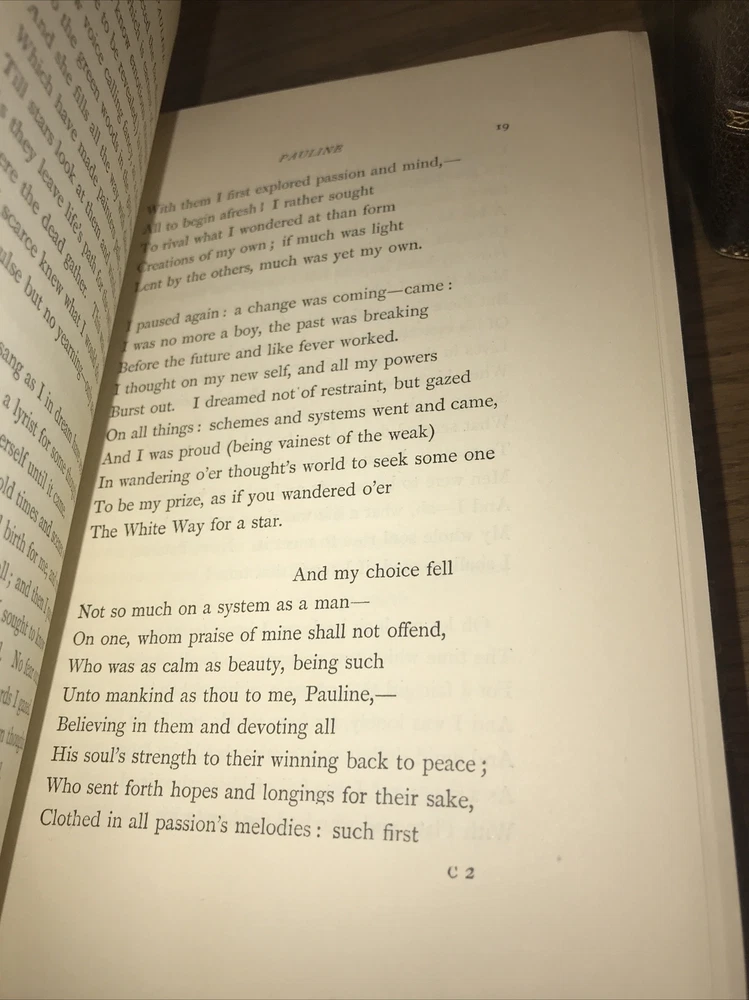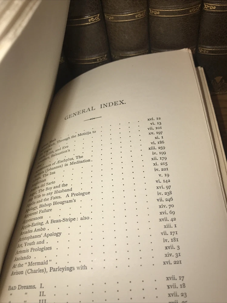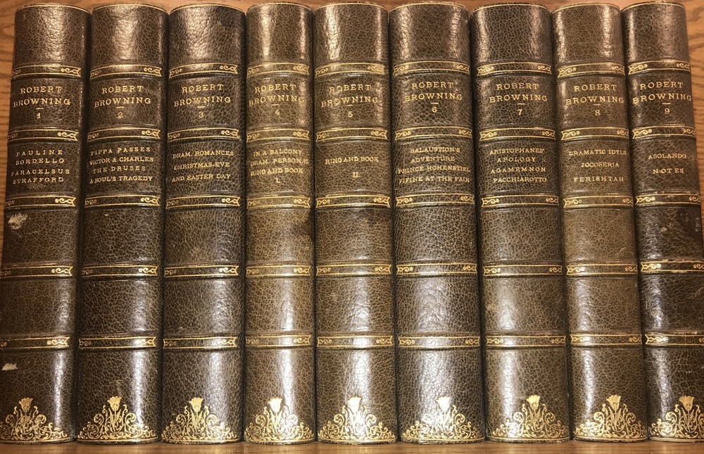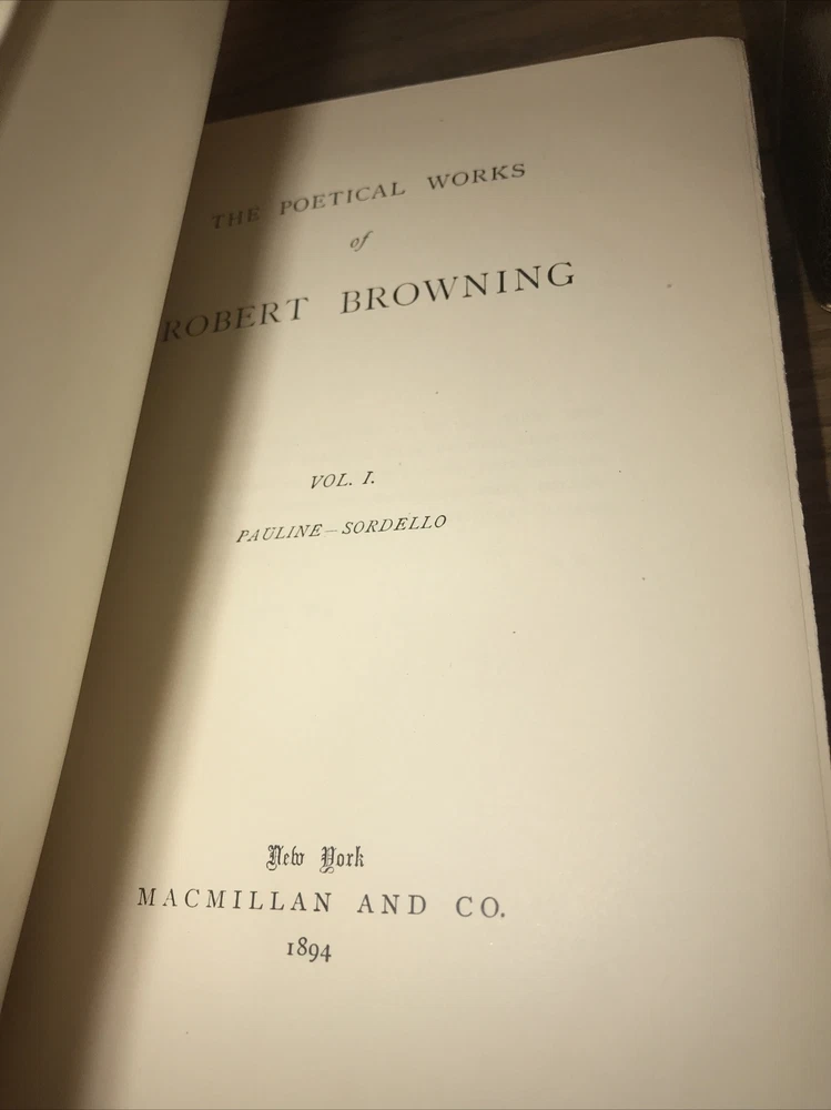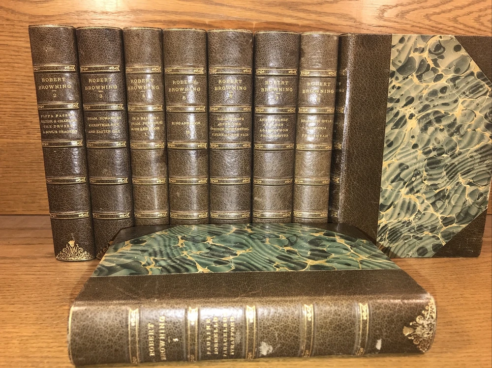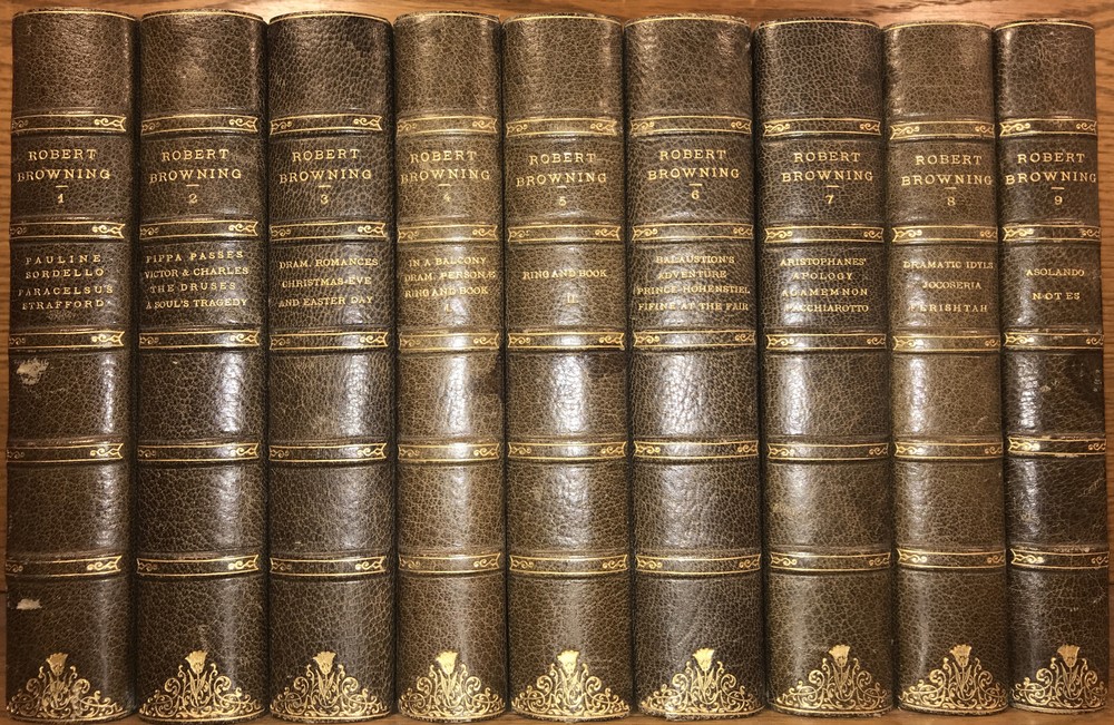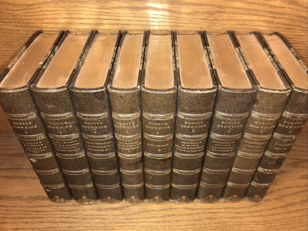 The complete works of Robert Browning. This set is complete in 9 volumes. Index in volume 9. The bindings are original. Printed in 1894. These are the highest grade leather. Top edges gilded. Raised hubs. Quality paper. This is an exceptional set, remarkably fresh and well preserved. This set is highly worthy of gifting. Printed in 1894. Set is over 125 years old. Looks new internally. No writing inside, aside from old inscription on second blank end paper. Some light external wear as shown in the pictures. All hinges fresh and sound. Leather is supple despite the sheer age. A gorgeous set worthy of gifting. Approximately 7 inches tall. Each book will be individually wrapped and well protected for shipping.
