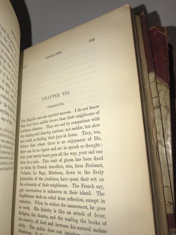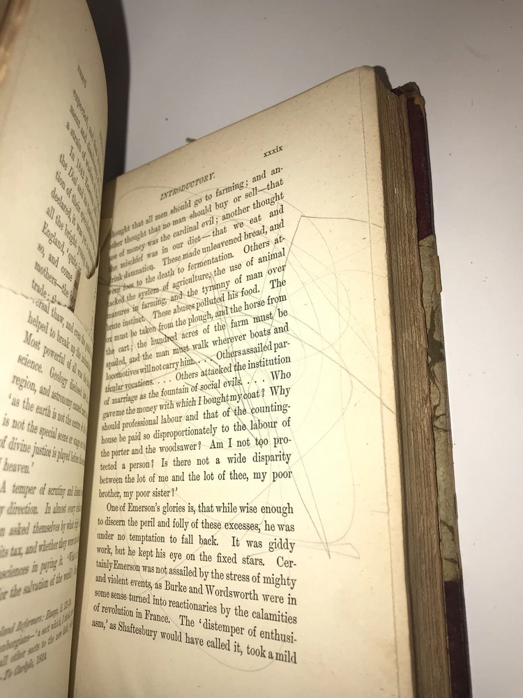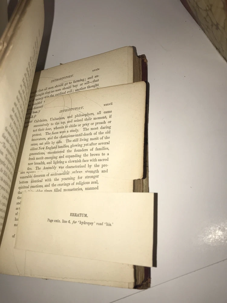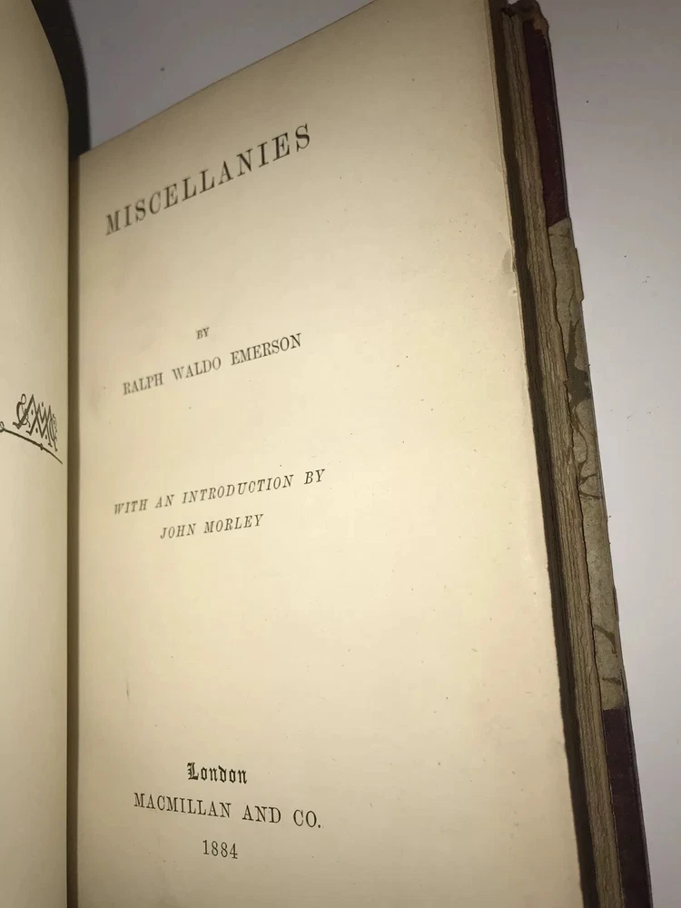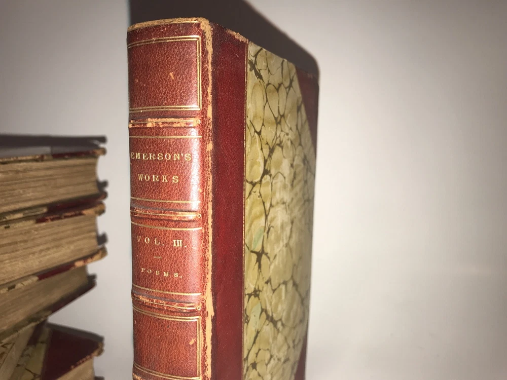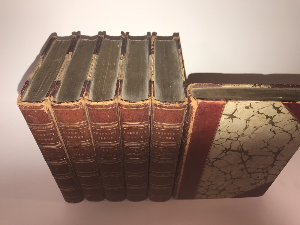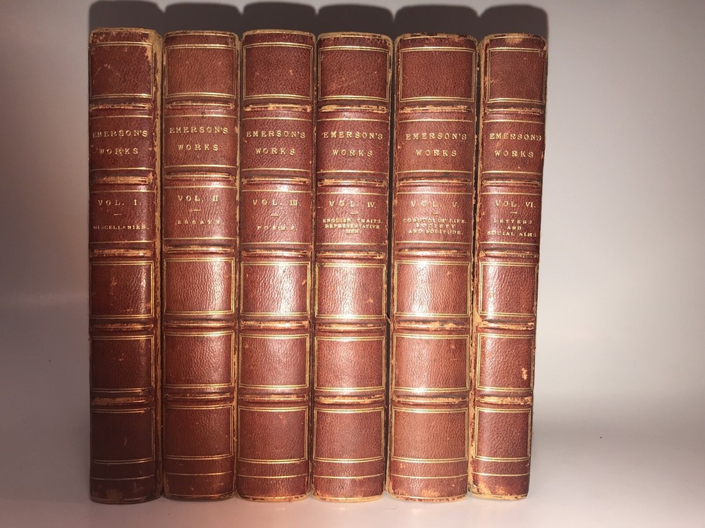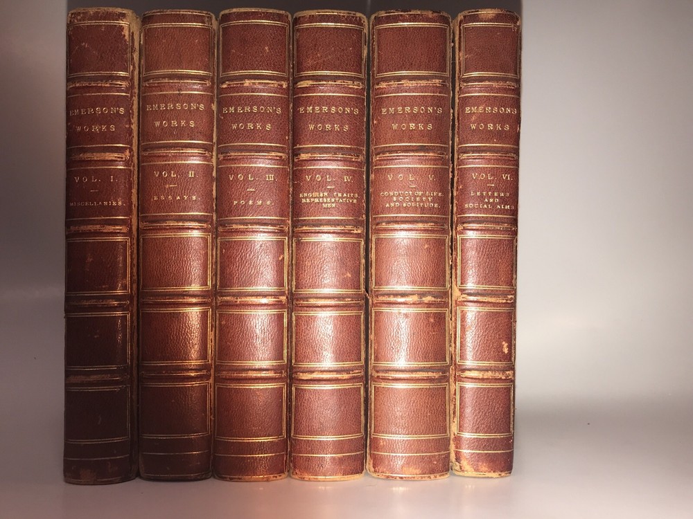 Complete in 6 volumes with all of Emerson’s works. Printed in London in 1883 -1884. This is an extremely early set of Emerson. These are the original bindings. Printed on quality paper that is very clean. Set has some condition issues. Some pencil scribbling. A torn page that is still present. Some hinges starting, all are rubbed. Still an extremely attractive and exceedingly early set of Emerson, difficult to obtain. Each book will be individually wrapped and well protected for shipping via Priority Mail.