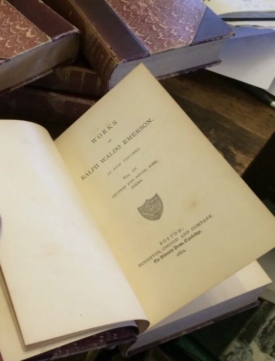 THE WORKS OF RALPH WALDO EMERSON. Complete in 5 volumes. Printed in 1880. In the publisher’s original bindings. Bound in leather. Leather supple. All hinges sound. Boston, Osgood & Company. 1880. 1880 is very early for Emerson. Printed in quality paper. Approximately 8 inches tall. This will be well protected for shipping via Priority Mail. Please see my other listings for similar books. 24.08
