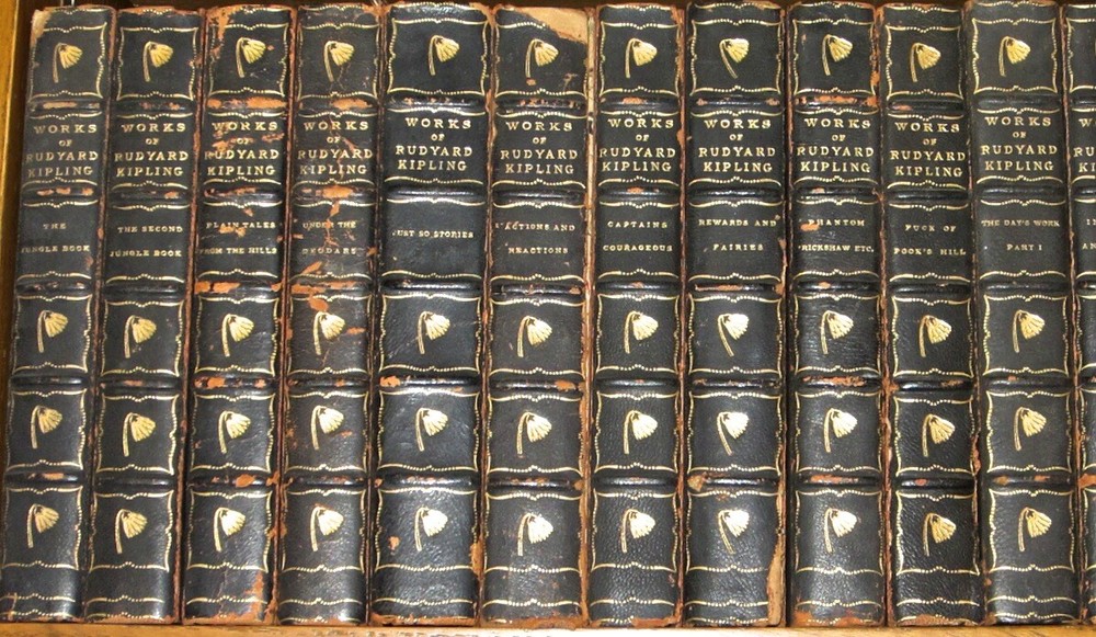 Poor condition only. MANY COVERS ARE DETACHED. I have all 25 volumes. The covers are detached. They’re present, but not attached. This set is printed on high quality paper. The main condition issue is to the bindings. This set has heavy external damage. Quality paper. Worthy of rebinding or being read. The bindings are damaged chipping and detached. THE COMPLETE WORKS OF RUDYARD KIPLING Complete in 25 volumes. Printed in 1909. In poor external condition. With extensive age related wear and damage. Internally very nice and printed on quality paper. Complete but in very poor and broken condition. Complete in 25 books total, despite only showing 23 in the pictures. I have all 25. This set has extensive damage, broken bindings, temporary repairs, and chipping. Loose leather pieces. Loose spines. Cracked hinges. Splits. Detached covers are possible. Internally it is quite nice, so perhaps a nice rustic antiquarian display set where condition isn't critical. Set is complete. MANY COVERS ARE DETACHED. MANY COVERS ARE DETACHED. MANY COVERS ARE DETACHED. If you care about condition you should not purchase this set. This set has obvious wear and damage. This set is in exceptionally damaged and broken condition. Including chipping, broken covers and hinges. Complete but in very poor and broken condition. This set has extensive damage, broken bindings, temporary repairs, and chipping. Internally it is quite nice. Set needs to be rebound. Possibly still useful as a good reading set it rustic damaged display set. 2183 OOTREV Rudyard KiplingFrom Wikipedia, the free encyclopediaJump to navigationJump to search"Kipling" redirects here. For other uses, see Kipling (disambiguation).Rudyard KiplingKipling in 1895BornJoseph Rudyard Kipling 30 December 1865 Bombay, Bombay Presidency, British IndiaDied18 January 1936 (aged 70) London, England, United KingdomResting placePoets' Corner, Westminster Abbey, LondonOccupationShort-story writer, novelist, poet, journalistNationalityBritishGenreShort story, novel, children's literature, poetry, travel literature, science fictionNotable worksThe Jungle Book Just So Stories Kim Captains Courageous "If—" "Gunga Din" "The White Man's Burden"Notable awardsNobel Prize in Literature 1907 SpouseCaroline Starr Balestier (m. 1892)Children3, including Elsie Bambridge and John KiplingSignature Joseph Rudyard Kipling ( / ˈ r ʌ djərd/ RUD -yərd; 30 December 1865 – 18 January 1936)[1] was an English journalist, short-story writer, poet, and novelist. He was born in India, which inspired much of his work. Kipling's works of fiction include The Jungle Book (1894), Kim (1901), and many short stories, including "The Man Who Would Be King" (1888).[2] His poems include "Mandalay" (1890), "Gunga Din" (1890), "The Gods of the Copybook Headings" (1919), "The White Man's Burden" (1899), and "If—" (1910). He is seen as an innovator in the art of the short story.[3] His children's books are classics; one critic noted "a versatile and luminous narrative gift".[4][5] Kipling in the late 19th and early 20th centuries was among the United Kingdom's most popular writers[3] Henry Jamessaid, "Kipling strikes me personally as the most complete man of genius, as distinct from fine intelligence, that I have ever known."[3] In 1907, he was awarded the Nobel Prize in Literature, as the first English-language writer to receive the prize, and at 41, its youngest recipient to date.[6] He was also sounded for the British Poet Laureateship and several times for a knighthood, but declined both.[7] Kipling's subsequent reputation has changed with the political and social climate of the age.[8][9] The contrasting views of him continued for much of the 20th century.[10][11] George Orwell saw Kipling as "a jingo imperialist", who was "morally insensitive and aesthetically disgusting".[12] Literary critic Douglas Kerr wrote: "[Kipling] is still an author who can inspire passionate disagreement and his place in literary and cultural history is far from settled. But as the age of the European empires recedes, he is recognised as an incomparable, if controversial, interpreter of how empire was experienced. That, and an increasing recognition of his extraordinary narrative gifts, make him a force to be reckoned with."[13] Contents 1 Childhood (1865–1882) 1.1 Education in Britain 1.2 Return to India 2 Early adult life (1882–1914) 2.1 Return to London 2.2 London 2.3 United States 2.3.1 Life in New England 2.4 Devon 2.5 Visits to South Africa 2.6 Sussex 2.6.1 Speculative fiction 2.6.2 Nobel laureate and beyond 2.7 Freemasonry 3 First World War (1914–18) 3.1 Death of John Kipling 4 After the war (1918–1936) 5 Death 5.1 Legacy 5.2 Links with camping and scouting 5.3 Kipling's Burwash home 5.4 Reputation in India 6 Bibliography 7 See also 8 References 9 Cited sources 10 Further reading 11 External links 11.1 Other information Malabar Point, Bombay, 1865.Rudyard Kipling was born on 30 December 1865 in Bombay, in the Bombay Presidency of British India, to Alice Kipling(née MacDonald) and John Lockwood Kipling.[14] Alice (one of the four noted MacDonald sisters)[15] was a vivacious woman,[16] of whom Lord Dufferin would say, "Dullness and Mrs Kipling cannot exist in the same room."[3][17][18]Lockwood Kipling, a sculptor and pottery designer, was the Principal and Professor of Architectural Sculpture at the newly founded Sir Jamsetjee Jeejebhoy School of Art in Bombay.[16] John Lockwood and Alice had met in 1863 and courted at Rudyard Lake in Rudyard, Staffordshire, England. They married and moved to India in 1865. They had been so moved by the beauty of the Rudyard Lake area that they named their first child after it. Two of Alice's sisters were married artists: Georgiana to the painter Edward Burne-Jones, and her sister Agnes to Edward Poynter. Kipling's most prominent relative was his first cousin, Stanley Baldwin, who was Conservative Prime Minister three times in the 1920s and 1930s.[19] Kipling's birth h