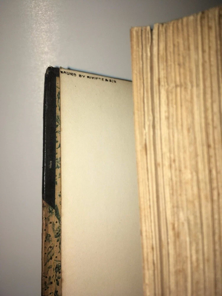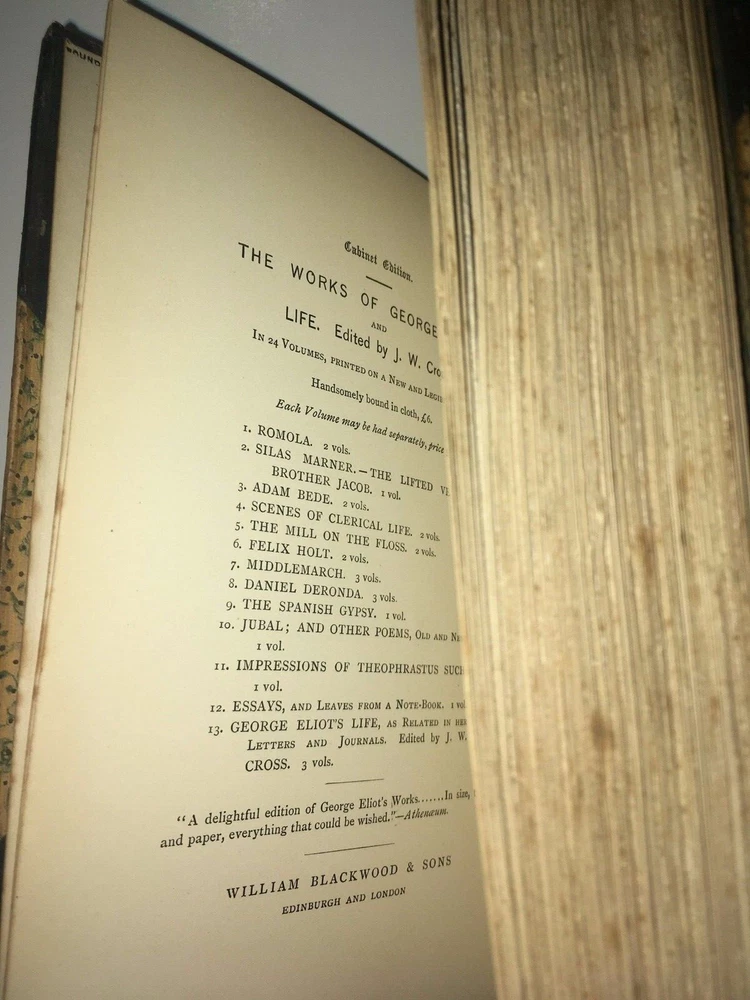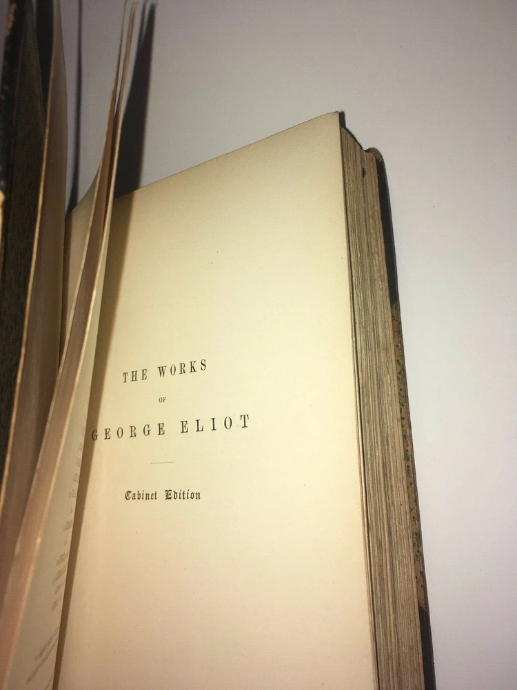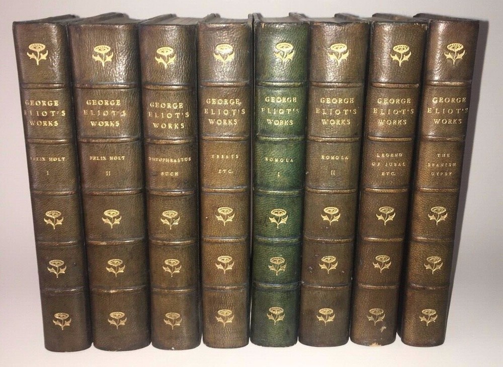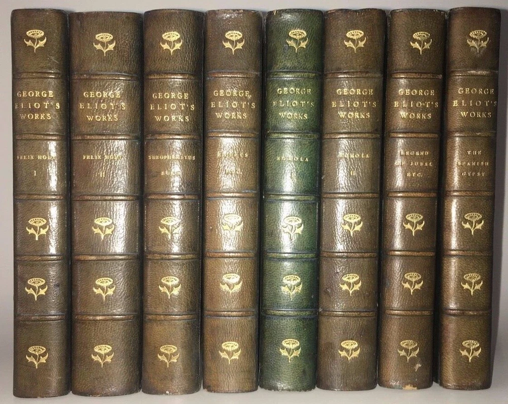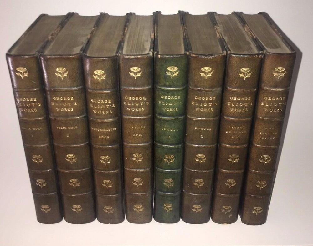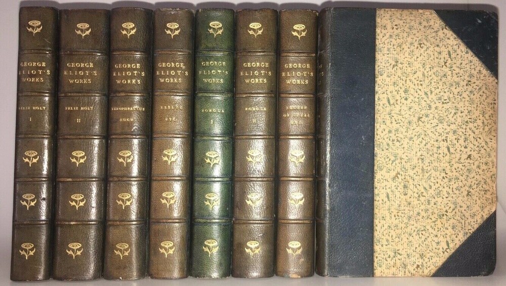 The Works of GEORGE ELIOT! 8-volumes. Not complete. Each title is complete by itself, but the whole set would have been 24 volumes. The advertisement says that there were 24 volumes that could be had separately. Each title is complete unto itself. The set is not complete. The whole set cost 6 Pounds Sterling in the 1800's. This was an expensive set. This is a gorgeous antiquarian set of George Eliot. Bound by the prestigious Riviere Bindery, in the 1800's, And signed by them. Printed during the Victorian Era, late 1800's. No date was printed on the title pages. Bound in genuine leather bindings. The spines have raised hubs. The top edge are gilded. Bound by the prestigious Riviere Bindery, in the 1800's. CONDITION: In remarkable condition. The leather is still supple. All hinges are strong and sound. Some general shelf abrasions. Each title is complete by itself, from a larger collection that could be had individually. These 8 selected volume were apparently collected and bound by Riviere in the 1800's. The advertisement says that there were 24 volumes that could be had separately. Each title is complete unto itself. The set is not complete. The whole set cost 6 Pounds Sterling in the 1800's. This was an expensive set. This is a gorgeous antiquarian set of George Eliot. This is a gorgeous set, and displays beautifully! 8 volumes of George Eliot bound by the prestigious Riviere Bindery in the 1800's. Each title is complete by itself. The half title page states this to be the Cabinet Edition and that each volume may be had by itself. The whole set would have been 25, but apparently only these 8 were purchased, or the rest were lost to time. Only these 8 volumes. This would make an excellent gift and/or addition to any fine library. Antiquarian books make a great investment, are only going up in value, and are sure to increase the aura of any room or office! I will pack very securely to ensure safe arrival at your doorstep. All books are individually wrapped and professionally padded. My goal is complete customer satisfaction. 1828 George EliotFrom Wikipedia, the free encyclopediaFor other people with the same name, see George Elliot (disambiguation)."Mary Ann Evans" redirects here. For the wife of Benjamin Disraeli, see Mary Anne Disraeli.George EliotAged 30 by the Swiss artist Alexandre Louis François d'Albert Durade (1804–86)BornMary Anne Evans 22 November 1819 Nuneaton, Warwickshire, EnglandDied22 December 1880 (aged 61) Chelsea, Middlesex, EnglandResting placeHighgate Cemetery (East), Highgate, LondonPen nameGeorge EliotOccupationNovelistPeriodVictorianNotable works The Mill on the Floss (1860), Silas Marner (1861), Middlemarch (1871–72), Daniel Deronda (1876)SpouseJohn Cross (1880; her death)PartnerGeorge Henry Lewes (1854–78) (his death)RelativesRobert Evans and Christiana Pearson (parents); Christiana, Isaac, Robert, and Fanny (siblings) Mary Anne Evans (22 November 1819 – 22 December 1880; alternatively "Mary Ann" or "Marian"), known by her pen name George Eliot , was an English novelist, poet, journalist, translator and one of the leading writers of the Victorian era. She is the author of seven novels, including Adam Bede (1859), The Mill on the Floss (1860), Silas Marner (1861), Middlemarch (1871–72), and Daniel Deronda (1876), most of which are set in provincial England and known for their realism and psychological insight. She used a male pen name, she said, to ensure that her works would be taken seriously. Female authors were published under their own names during Eliot's life, but she wanted to escape the stereotype of women writing only lighthearted romances. She also wished to have her fiction judged separately from her already extensive and widely known work as an editor and critic. An additional factor in her use of a pen name may have been a desire to shield her private life from public scrutiny and to prevent scandals attending her relationship with the married George Henry Lewes, with whom she lived for over 20 years.[1] Eliot's Middlemarch has been described by Martin Amis[2] and Julian Barnes[3] as the greatest novel in the English language. Contents [hide] 1Life 1.1Early life and education 1.2Move to Coventry 1.3Move to London and editorship of the Westminster Review 1.4Relationship with George Lewes 1.5First publication 1.6Marriage to John Cross and death 2Literary assessment 3Works 3.1Novels 3.2Poetry 3.3Other 4Notes 5Further reading 5.1Context and background 5.2Critical studies 6External links Life[edit]Early life and education[edit] Mary Ann Evans was born in Nuneaton, Warwickshire, England. She was the second child of Robert Evans (1773–1849) and Christiana Evans ( née Pearson, 1788–1836), the daughter of a local mill-owner. Mary Ann's name was sometimes shortened to Marian.[4] Her full siblings were Christiana, known as Chrissey (1814–59), Isaac (1816–1890), and twin brothers who survived a few days in March 1821. She also had a half-brother, Robert (1802–64), and half-sister, Fanny (1805–82), from her father's previous marriage to Harriet Poynton (?1780–1809). Robert Evans, of Welsh ancestry, was the manager of the Arbury Hall Estate for the Newdigate familyin Warwickshire, and Mary Ann was born on the estate at South Farm. In early 1820 the family moved to a house named Griff House, between Nuneaton and Bedworth. The young Evans was obviously intelligent, a voracious reader. Because she was not considered physically beautiful, Evans was thus not thought to have much chance of marriage, and because of her intelligence, her father invested in an education not often afforded women.[5] From ages five to nine, she boarded with her sister Chrissey at Miss Latham's school in Attleborough, from ages nine to thirteen at Mrs. Wallington's school in Nuneaton, and from ages thirteen to sixteen at Miss Franklin's school in Coventry. At Mrs. Wallington's school, she was taught by the evangelical Maria Lewis — to whom her earliest surviving let