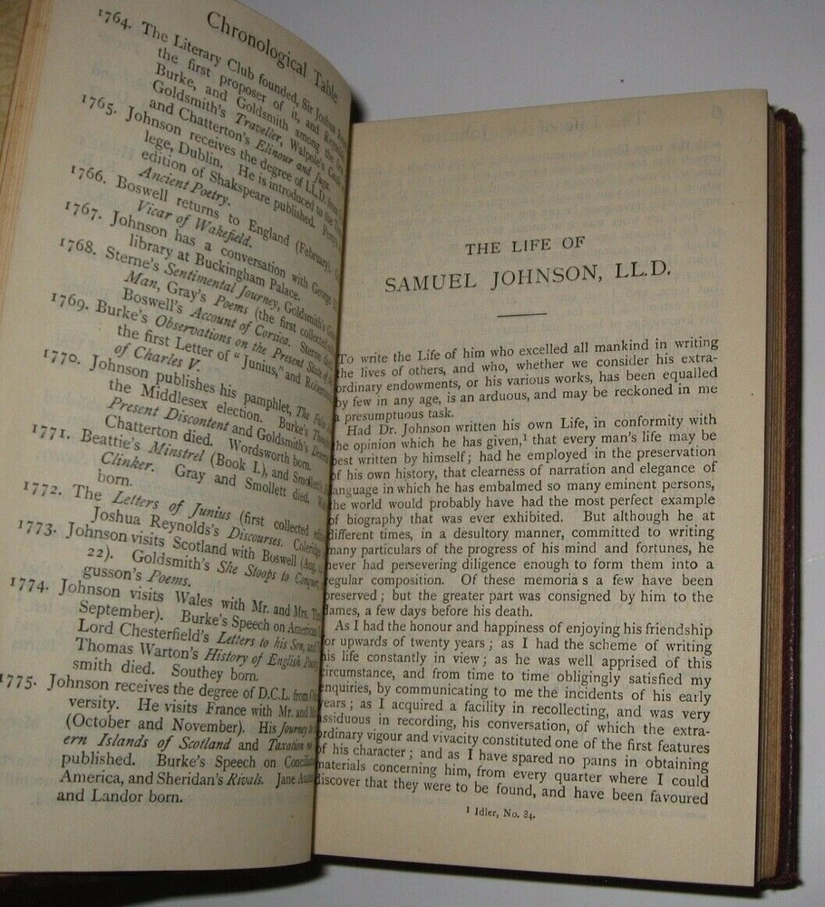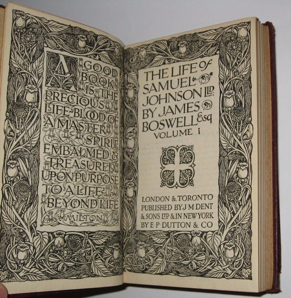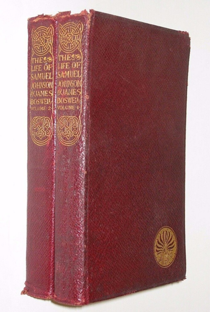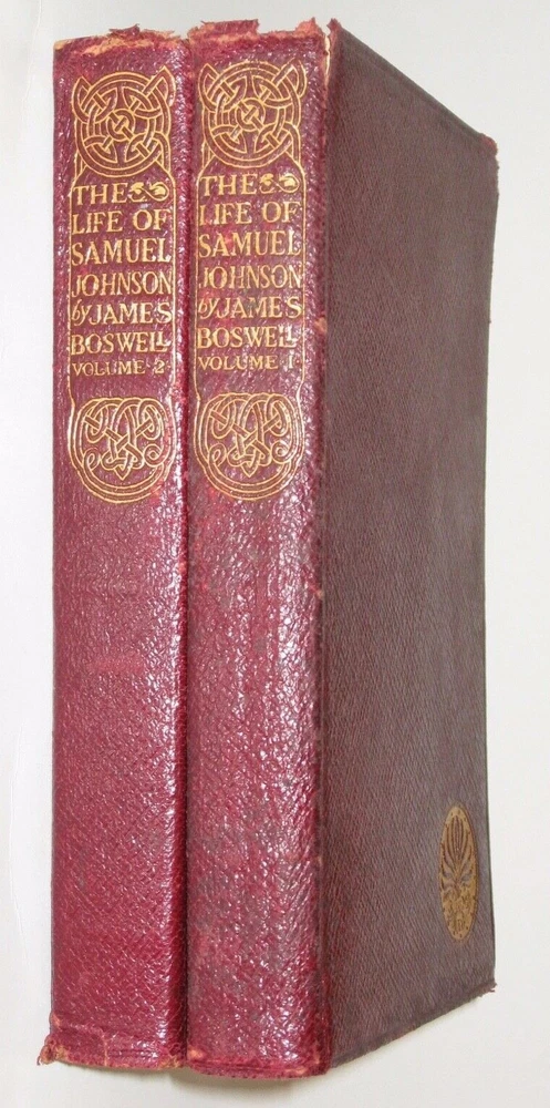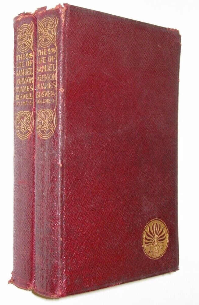 BOSWELL'S LIFE OF SAMUEL JOHNSON! Complete in 2 volumes. Printed in 1920. "Boswell's Life of Samuel Johnson is the best [biography] in the language." [DNB] This set is 100 years old! Bound in full leather bindings. Full leather bindings are more expensive to produce and are highly desirable. These are the original bindings. Bound in limp leather bindings that are softer than hardcovers. Gilded lettering on spine. Gilt embossed crest on cover. Ornately illustrated title page. Top edge gilded. These books measure 6.75 inches tall. Complete two volume set. Intricate title page motif. Everyman's Library. J.M. Dent & Sons Ltd., London. Printed in 1920. CONDITION: Complete in 2 volumes. Very Good condition overall, exceptionally fresh and well preserved internally, with some wear to the bindings. Hinges strongly attached, with extremity starting. Some general external rubbing and micro chipping to the extremities as visible in the pictures, still a nice antiquarian set. These bindings are 100 years old. Clean interior. Appears free of any trace of foxing. These are limp leather bindings, meaning that the covers are softer. Printed on thin India style paper that is fresh, supple, and well preserved. No writing or signs of previous ownership. A gorgeous set. A particularly nice set of the most celebrated biography in English literature. Each book will be individually wrapped and well protected for shipping. #3409 Life of Samuel Johnson From Wikipedia, the free encyclopedia Jump to navigation Jump to search This article is about the book written by James Boswell. For the work written by John Hawkins, see Life of Samuel Johnson (1787) . Life of Samuel Johnson Author James Boswell Original title The Life of Samuel Johnson, LL.D. Country United Kingdom Language English Subject Samuel Johnson Genre Biography Publication date 1791 The Life of Samuel Johnson, LL.D. (1791) by James Boswell is a biography of English writer Dr. Samuel Johnson . The work was from the beginning a critical and popular success, and represents a landmark in the development of the modern genre of biography. It is notable for its extensive reports of Johnson's conversation. Many have claimed it as the greatest biography written in English, but some modern critics object that the work cannot be considered a proper biography. Boswell's personal acquaintance with his subject began in 1763, when Johnson was 54 years old, and Boswell covered the entirety of Johnson's life by means of additional research. The biography takes many critical liberties with Johnson's life, as Boswell makes various changes to Johnson's quotations and even censors many comments. Nonetheless, the book is valued as both an important source of information on Johnson and his times, as well as an important work of literature. Contents 1 Background 2 Biography 3 Critical response 4 Notable Editions 5 References 6 Further reading 7 External links James Boswell at 25, by George Willison On 16 May 1763, as a 22-year-old Scot visiting London, Boswell first met Johnson in the book shop of Johnson's friend, Tom Davies. [1] They quickly became friends, although Boswell would for many years only see Johnson when he visited London in the intervals of his law practice in Scotland. [1] From the age of 20, Boswell kept a series of journals thoroughly detailing his day to day experience. [1] This journal, when published in the 20th century, filled eighteen volumes, and it was from this large collection of detailed notes that Boswell would base his works on Johnson's life. [1] Johnson, in commenting on Boswell's excessive note taking playfully wrote to Hester Thrale , "One would think the man had been hired to spy upon me". [2] On 6 August 1773, eleven years after first meeting Boswell, Johnson set out to visit his friend in Scotland, to begin "a journey to the western islands of Scotland", as Johnson's 1775 account of their travels would put it. [3] Boswell's account, The Journal of a Tour to the Hebrides (1786), which was not published until after Johnson's death, was a trial of his biographical method before commencing his Life of Johnson . [4] With the success of that work, Boswell started working on the "vast treasure of his conversations at different times" that he recorded in his journals. [5] His goal was to recreate Johnson's "life in scenes". [5] Because Johnson was 53 when Boswell first met him, the last 20 years of his life occupy four fifths of the book. [6] Furthermore, as literary critic Donald Greene has pointed out, Boswell's works only describe 250 days that Boswell could have actually been present with Johnson, the rest of the information having to come from either Johnson himself or from secondary sources recounting various incidents. [7] Before Boswell could publish his biography of Johnson, there were many other friends of Johnson's who published or were in the middle of publishing their own biographies or collections or anecdotes on Johnson: John Hawkins , Thrale, Frances Burney , Anna Seward , Elizabeth Montagu , Hannah More , and Horace Walpole among many. [8] The last edition Boswell worked on was the third, published after his death, in 1799. [9] Samuel Johnson in his later years There are many biographies and biographers of Samuel Johnson, but James Boswell's Life of Samuel Johnson is the one best known to the general reader. [10] Since first publication it has passed through literally hundreds of editions, as well as (on account of its great length) many selections and abridgements. Yet opinion among 20th-century Johnson scholars such as Edmund Wilson and Donald Greene is that Boswell's Life "can hardly be termed a biography at all", being merely "a collection of those entries in Boswell's diaries dealing with the occasions during the last twenty-two years of Johnson's life on which they met ... strung together with only a perfunctory effort to fill the gaps". [10] Furthermore, Greene claims that the work "began with a well-organized press campaign