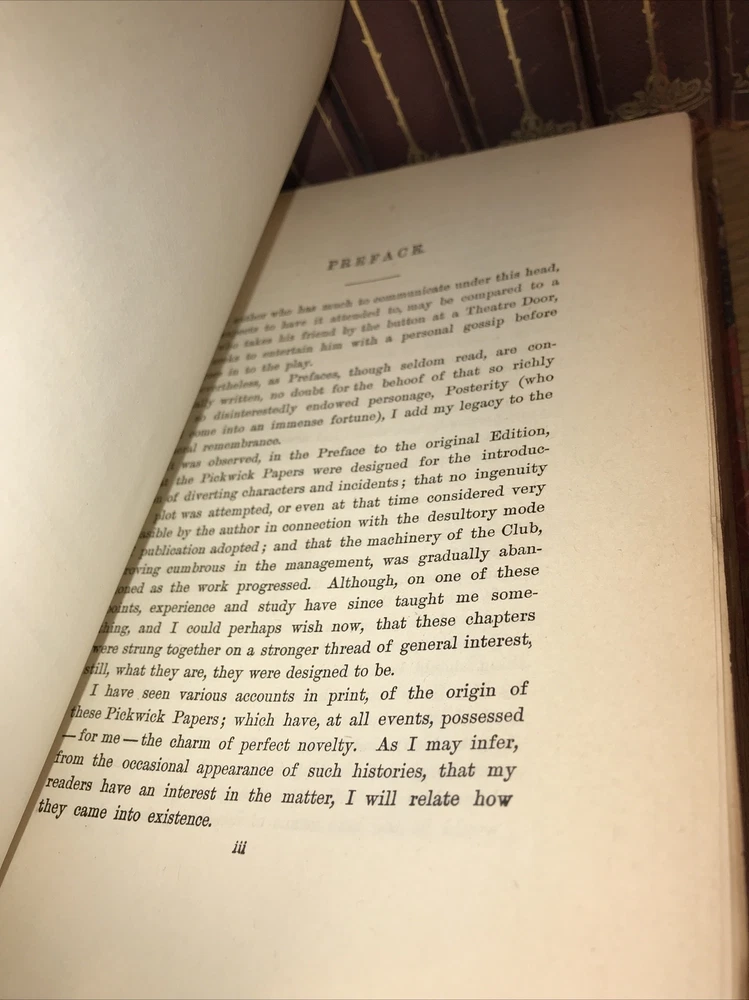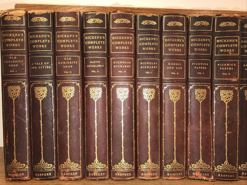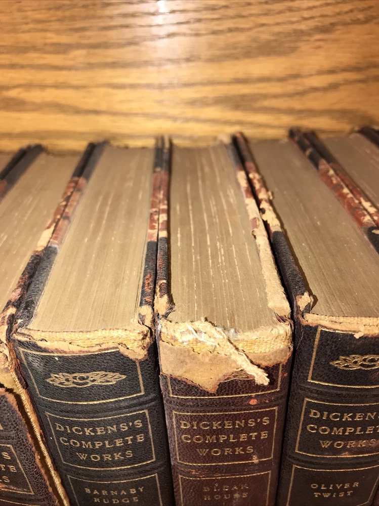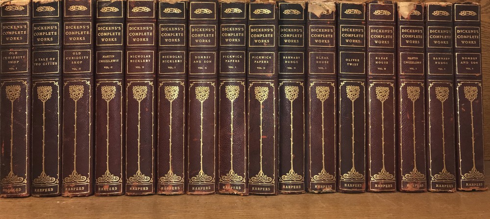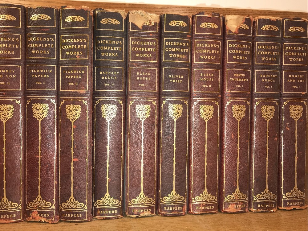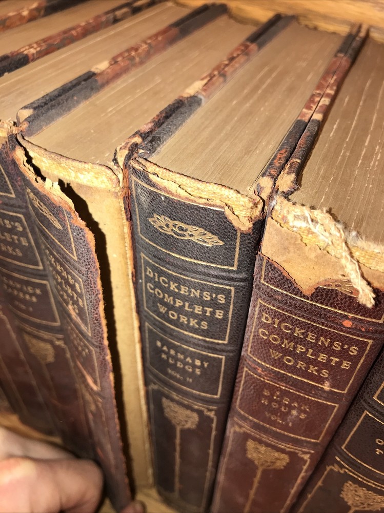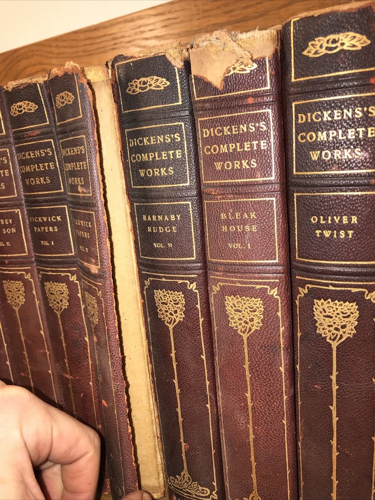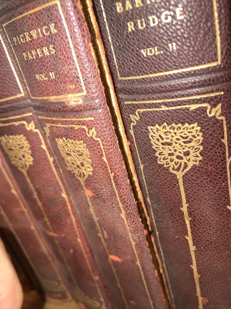 Bound in the original leather bindings. This is a nice rustic antiquarian set. Genuine leather bindings. 16 volumes only. Not complete. All covers attached. Set has wear as shown, abrasions, chipping, starting. P ickwick volume two has spine split open as shown in the pictures. Still an attractive rustic looking set. Very fresh clean and well preserved internally. External chipping and splitting as shown in the pictures. Each book will be individually wrapped and well protected for shipping.