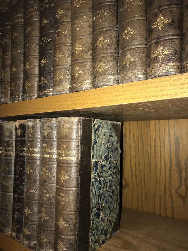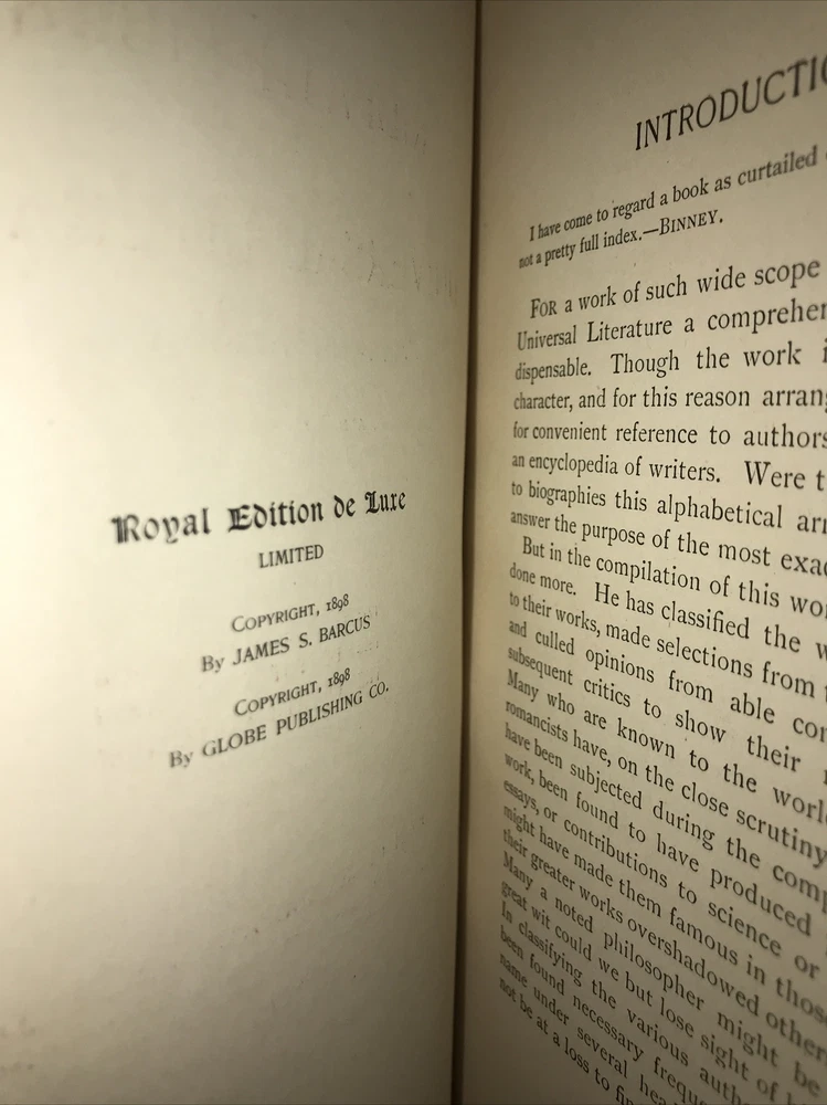 Bound in genuine leather. Complete in 25 volumes. Printed in 1899. Royal Edition. Limited edition. Bound in the original leather. Set is only in good condition for the age. A lot of generalized usage and shelf wear. A lot of looseness. Set has a lot of generalized wear. Some looseness. Some of the internal hinges are broken open and split so the covers feel loose. This may be bothersome. Please be comfortable with the condition before purchasing this set. Set has some damage. Set still manages to look good on the shelf. If condition is important please do not buy this set. Spines are heavily scuffed. Some dirt, some staining, some bowing to some covers. Still an attractive rustic set where condition is not critical. If you care about condition please do not buy this set. It is intended as an old rustic antiquarian display set. Perhaps more worthy than a britannica. This is not a reference encyclopedia. This is a literature anthology. This set was printed in the 19th century. Printed in 1899. Each book will be individually wrapped and well protected for shipping. Will require multiple boxes. International shipping in 5 boxes will cost $520. 4.2.21