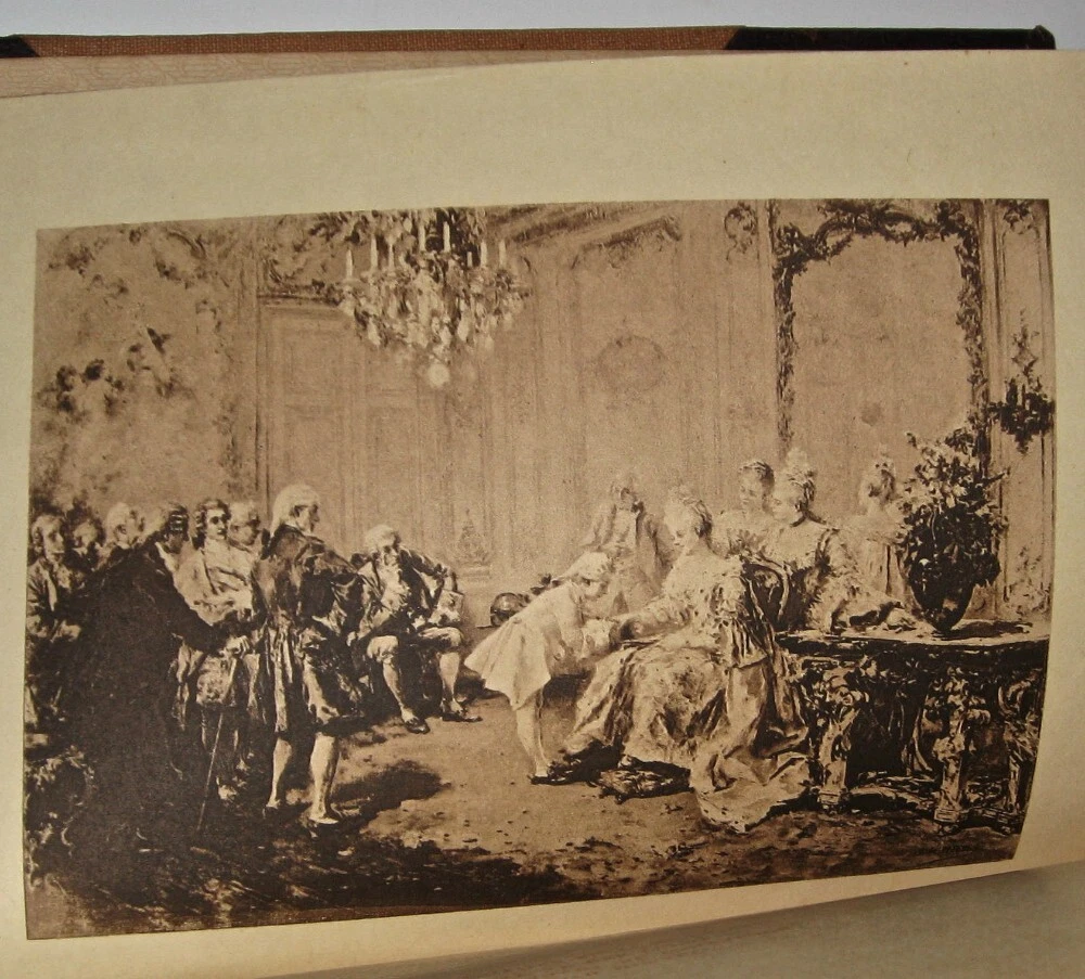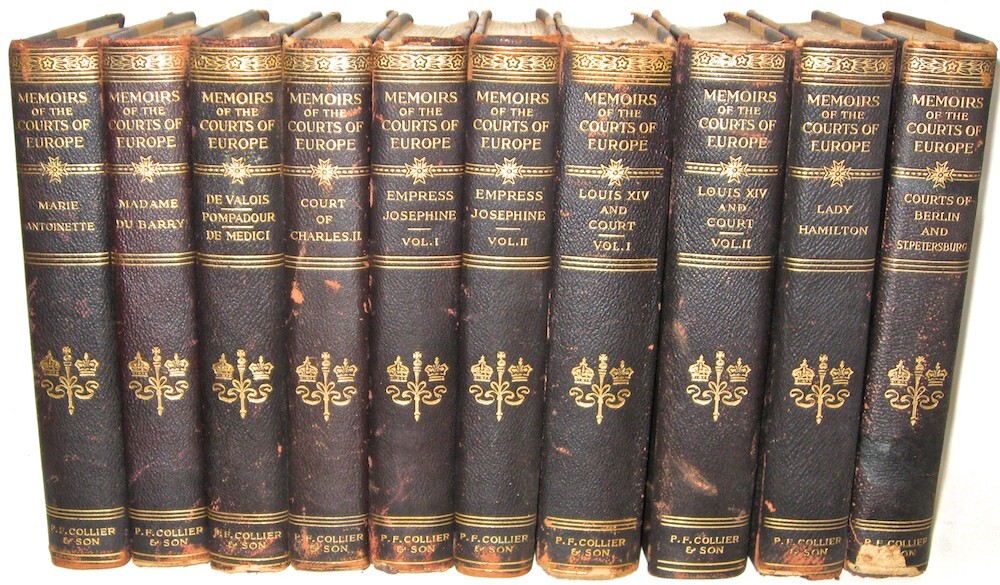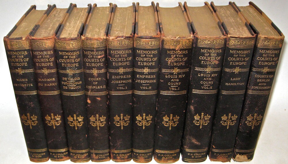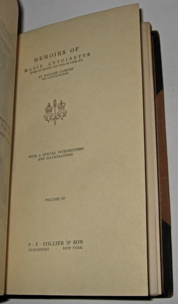 This set is damaged. Set is fragile. This set has additional damage to the spines since the pictures were taken. It has more chipping than is visible in the pictures. Poor rustic condition only. If condition matters please do not buy this. Low grade leather is chipping. Damaged. Chipping. Low grade leather. Marie Antoinette with deep gnawing along the edges of the cover that may be bothersome. Chipping. Fragile. Poor condition. MEMOIRS OF THE COURTS OF EUROPE! Complete in 10-volumes.Printed in English. Printed in 1910. The title page is not dated; the copyright page is 1910. This set is well over 100 years old. Set is complete in 10 volumes.Each title is complete by itself. MARIE ANTOINETTE MADAME DU BARRY COURTS OF BERLIN AND ST. PETERSBURG DE VALOIS, POMPADOUR, DE MEDICI, COURT OF CHARLES II EMPRESS JOSEPHINE IN TWO VOLUMES LOUIS XIV AND HIS COURT IN TWO VOLUMES LADY HAMILTON Damaged. Chipping. Low grade leather. Marie Antoinette with deep gnawing along the edges of the cover that may be bothersome. Bound in genuine leather bindings, these display beautifully! ILLUSTRATED with full page plates. Frontisplate protected in tissue. These measure 8 inches tall. P.F. Collier & Son, NY. The title page is not dated; the copyright page is 1910. In excellent condition for being 100 years old; all hinges are strongly attached, some have rubs/abrasion. There is some external rubs/wear, a chip on one volume, as visible in the pictures, the leather is somewhat fragile and there are chips. Externally this set is fragile. Internally FINE/MINT+ & Unread, no foxing except for tissue paper, which is present. The top gilding is abraded. Overall these are very well-preserved for their age and display beautifully! No previous signs of ownership. Very tightly bound; these books try to close when opened. These take up 13 inches shelf space. Damaged. Chipping. Low grade leather. Marie Antoinette with deep gnawing along the edges of the cover that may be bothersome. 1847 Marie AntoinetteFrom Wikipedia, the free encyclopediaJump to navigationJump to searchFor other uses, see Marie Antoinette (disambiguation).Marie AntoinettePortrait by Élisabeth Vigée Le Brun, 1778Queen consort of FranceTenure10 May 1774 – 21 September 1792Born2 November 1755 Hofburg Palace, Vienna, Archduchy of Austria, Holy Roman EmpireDied16 October 1793 (aged 37) Place de la Révolution, Paris, French First RepublicBurial21 January 1815 Basilica of St DenisSpouseLouis XVI of France (m. 1770; died 1793)Issue Marie Thérèse, Queen of France Louis Joseph, Dauphin of France Louis XVII of France Princess Sophie Full nameMaria Antonia Josefa JohannaHouseHabsburg-LorraineFatherFrancis I, Holy Roman EmperorMotherMaria Theresa of AustriaReligionRoman CatholicismSignature Coat of arms of Marie Antoinette of Austria Marie Antoinette (/ˌæntwəˈnɛt, ˌɒ̃twə-/;[1] French: [maʁi ɑ̃twanɛt]; born Maria Antonia Josepha Johanna; 2 November 1755 – 16 October 1793) was the last Queen of France before the French Revolution. She was born an Archduchess of Austria and was the penultimate child and youngest daughter of Empress Maria Theresa and Francis I, Holy Roman Emperor. She became Dauphine of France in May 1770 at age 14 upon her marriage to Louis-Auguste, heir apparent to the French throne. On 10 May 1774, her husband ascended the throne as Louis XVI and she assumed the title Queen of France and Navarre, which she held until September 1791, when she became Queen of the French as the French Revolution proceeded, a title that she held until 21 September 1792. After eight years of marriage, Marie Antoinette gave birth to Marie Thérèse, the first of her four children. A growing percentage of the population came to dislike her, accusing her of being profligate and promiscuous and of harboring sympathies for France's enemies, particularly her native Austria. The Affair of the Diamond Necklace damaged her reputation further. During the Revolution, she became known as Madame Déficit because the country's financial crisis was blamed on her lavish spending and her opposition to the social and financial reforms of Turgot and Necker. Several events were linked to Marie Antoinette during the Revolution after the government had placed the royal family under house arrest in the Tuileries Palace in October 1789. The June 1791 attempted flight to Varennes and her role in the War of the First Coalition had disastrous effects on French popular opinion. On 10 August 1792, the attack on the Tuileries forced the royal family to take refuge at the Assembly, and they were imprisoned in the Temple Prison on 13 August. On 21 September 1792, the monarchy was abolished. Her trial began on 14 October 1793, and two days later Marie Antoinette was convicted by the Revolutionary Tribunal of high treason and executed by guillotine on the Place de la Révolution. Contents 1Early life (1755–70) 2Dauphine of France (1770–74) 3Queen of France and Navarre (1774–91) 3.1Early years (1774–78) 3.2Motherhood, changes at court, intervention in politics (1778–81) 3.3Declining popularity (1782–85) 3.4Prelude to the Revolution: scandals and the failure of reforms (1786–89) 3.4.1Diamond necklace scandal 3.4.2Failure of political and financial reforms 4French Revolution before Varennes (1789–91) 4.1Mirabeau 4.2Civil Constitution of the Clergy 5Flight, arrest at Varennes and return to Paris (21–25 June 1791) 6Radicalization of the Revolution after Varennes (1791–92) 7Events leading to the abolition of the monarchy on 10 August 1792 7.1Louis XVI's trial and execution 8Marie Antoinette in the Temple 8.1Conciergerie 9Trial and execution (14–16 October 1793) 10Legacy 11In popular culture 12Ancestry 13Children 14See also 15References 15.1Notes 15.2Bibliography 16Further reading 17External links Archduchesses Maria Antonia in a pink dress and Maria Carolina in blue (watercolor on ivory by Antonio Pencini, 1764)Archduchess Maria Antonia (watercolor by Jean-Étienne Liotard,