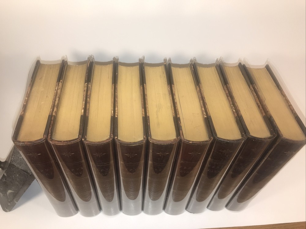 Complete in 9 volumes. Index and appendices in volume 9. Bound in fine leather. These are the original bindings. Printed on quality rag paper. Illustrated with plates. Printed in 1902. Some generalized shelf wear as shown. Spines are supple, and have been recently treated with book oil so are ready for the next 100 years. All hinges strongly attached. These come with removable a rchival protective clear Mylar sleeves, as shown in pictures 2 and 3. Each book will be individually wrapped and well protected for shipping.
