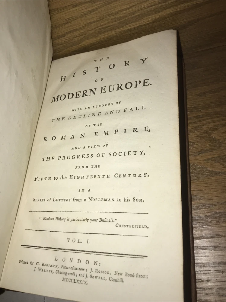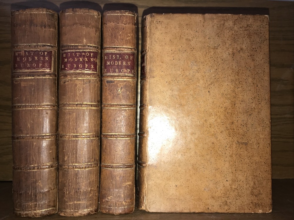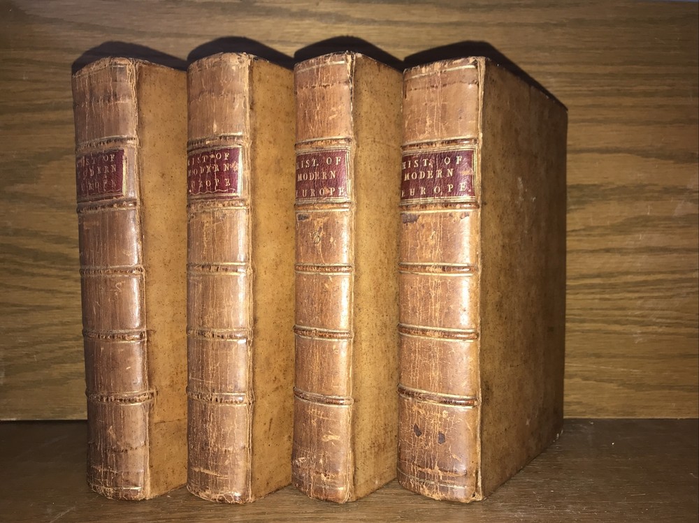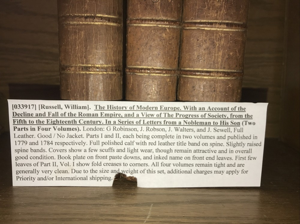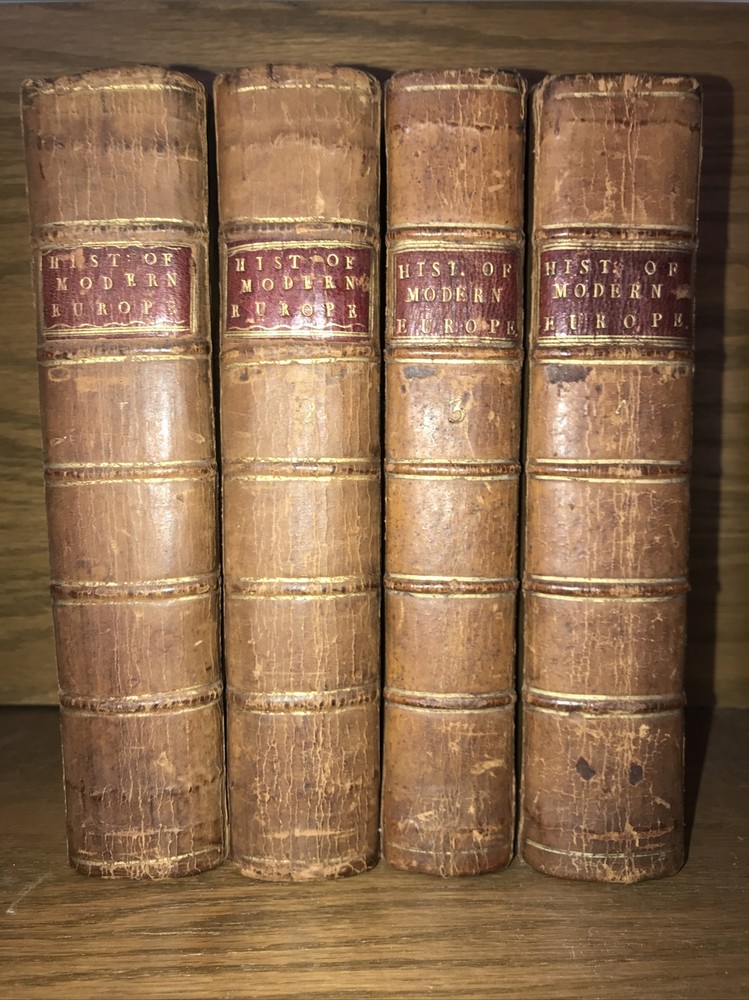 The History Of Modern Europe. With An Account Of The Decline And Fall Of The Roman Empire, And A View Of The Progress Of Society, From The Fifth To The Eighteenth Century. In A Series Of Letters From A Nobleman To His Son (Two Parts In Four Volumes) By [Russell, William] Complete in 4 volumes. In the original bindings. First Edition/First Printing. Printed 1779 and 1784. This is a high quality set. Printed on quality rag paper. The bindings are original. Set is complete. 9 inches tall. These are large books. The History Of Modern Europe. With An Account Of The Decline And Fall Of The Roman Empire, And A View Of The Progress Of Society, From The Fifth To The Eighteenth Century. In A Series Of Letters From A Nobleman To His Son (Two Parts In Four Volumes) By [Russell, William] London: G Robinson, J. Robson, J. Walters, and J. Sewell. Full Leather. Very Good. Parts I and II, each being complete in two volumes and published in 1779 and 1784 respectively. Full polished calf with red leather title band on spine. Slightly raised spine bands. Covers show a few scuffs and light wear, though remain very attractive and in overall very good condition. Book plate on front paste downs, and inked name on front end leaves. First few leaves of Part II, Vol. I show fold creases to corners. All four volumes remain tight and are generally very clean. This is not Gibbon’s Rome. The bindings are original. The condition is remarkable. Each book will be individually wrapped and well protected for shipping via Priority Mail. 2022.02.17