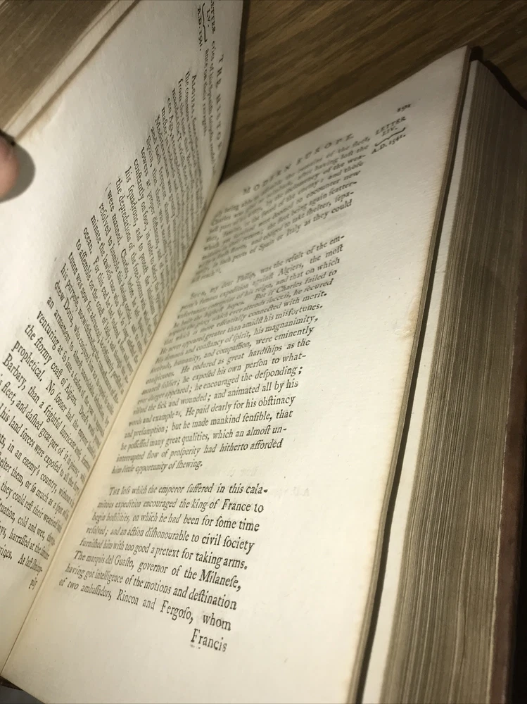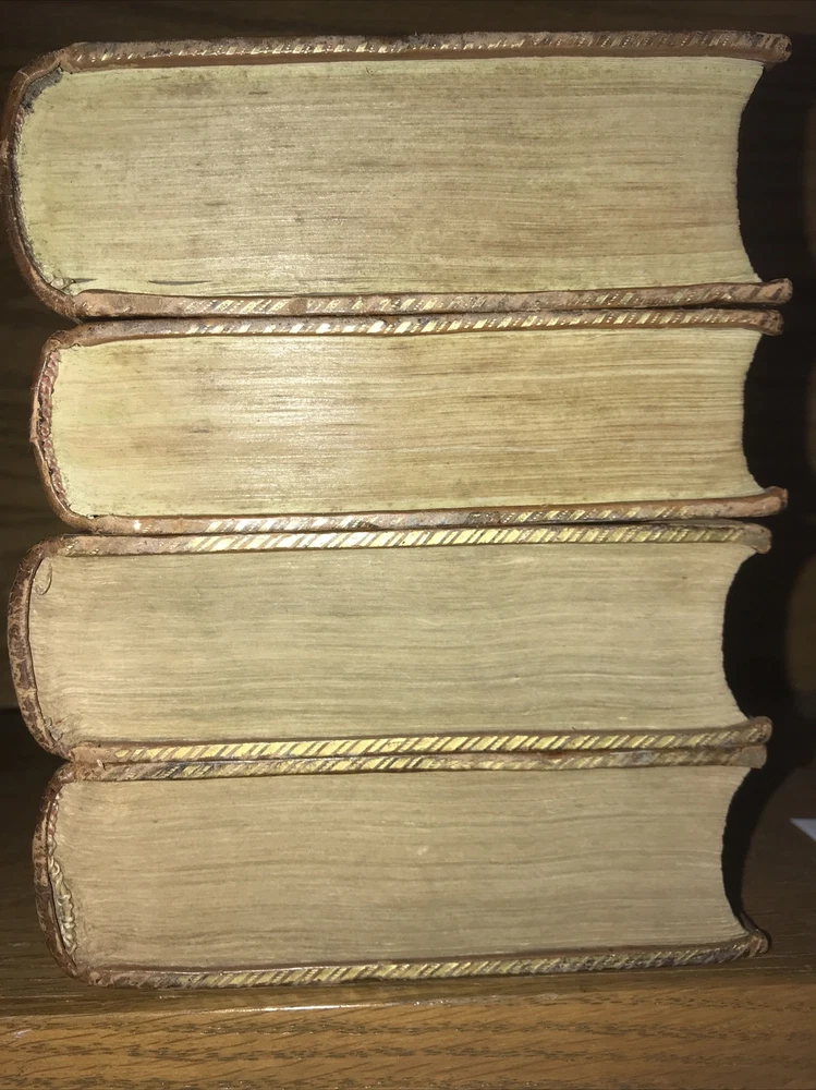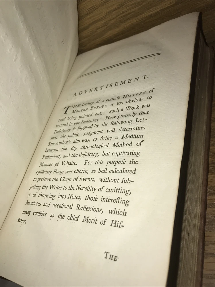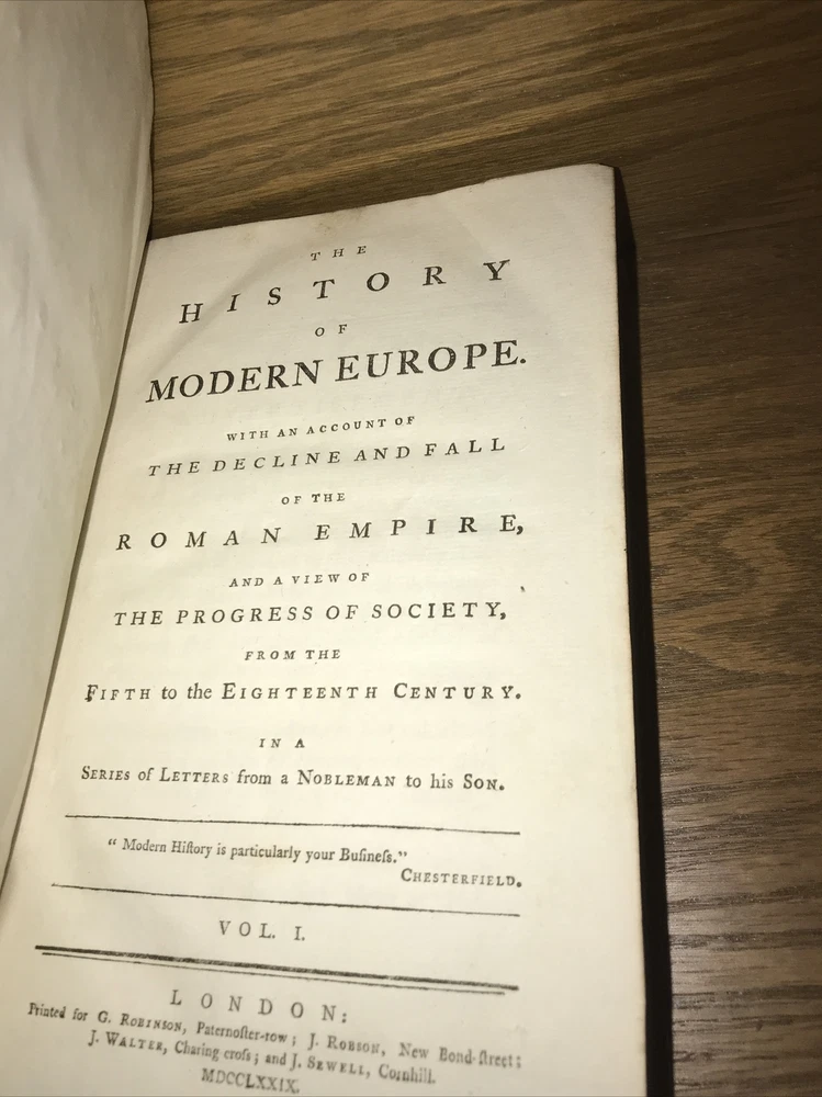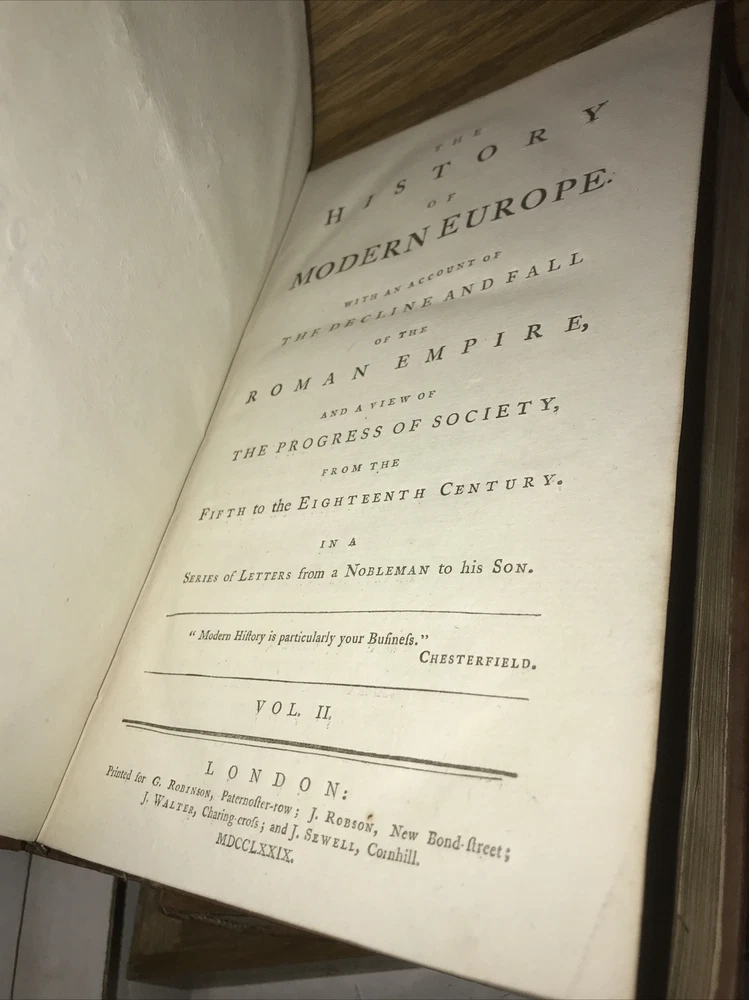 The History Of Modern Europe. With An Account Of The Decline And Fall Of The Roman Empire, And A View Of The Progress Of Society, From The Fifth To The Eighteenth Century. In A Series Of Letters From A Nobleman To His Son (Two Parts In Four Volumes) By [Russell, William] Complete in 4 volumes. In the original bindings. First Edition/First Printing. Printed 1779 and 1784. This is a high quality set. Printed on quality rag paper. The bindings are original. Set is complete. 9 inches tall. These are large books. The History Of Modern Europe. With An Account Of The Decline And Fall Of The Roman Empire, And A View Of The Progress Of Society, From The Fifth To The Eighteenth Century. In A Series Of Letters From A Nobleman To His Son (Two Parts In Four Volumes) By [Russell, William] London: G Robinson, J. Robson, J. Walters, and J. Sewell. Full Leather. Very Good. Parts I and II, each being complete in two volumes and published in 1779 and 1784 respectively. Full polished calf with red leather title band on spine. Slightly raised spine bands. Covers show a few scuffs and light wear, though remain very attractive and in overall very good condition. Book plate on front paste downs, and inked name on front end leaves. First few leaves of Part II, Vol. I show fold creases to corners. All four volumes remain tight and are generally very clean. This is not Gibbon’s Rome. The bindings are original. The condition is remarkable. Each book will be individually wrapped and well protected for shipping via Priority Mail. 2022.02.17