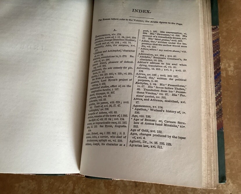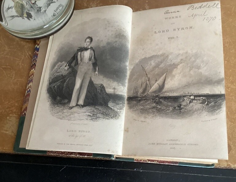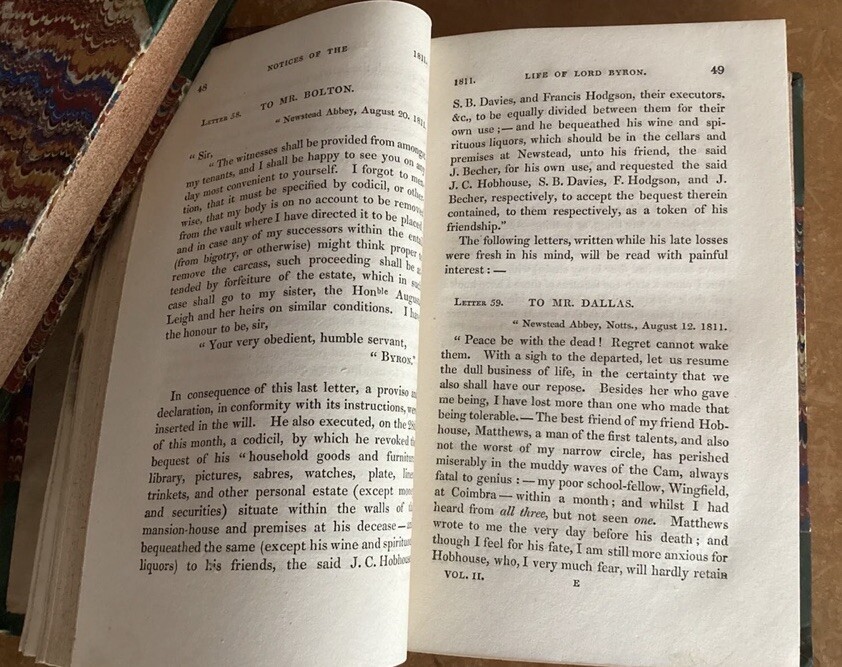 The works of LORD BYRON with his letters and journals and his life by Thomas Moore. LORD BYRON’S COMPLETE WORKS AND LETTERS. First Collected Edition. Printed in 1832. Complete in 17 volumes, which is standard. The bindings are original. Leather supple. All hinges sound. The works of LORD BYRON with his letters and journals and his life by Thomas Moore. London John Murray Albermarle Street. Published 1832-1833. Leather bound spines and corners. 17 volumes. Size H 17cm W 11cm. Smaller sized volumes under7 inches tall. Inscription in pencil in each. Some foxing and age markings appropriate, given their age. Generally all in very good condition. Leather supple. Hinges sound. An exceptional set. This will be well protected for shipping via Priority Mail. Please see my other listings for similar books. 24.08