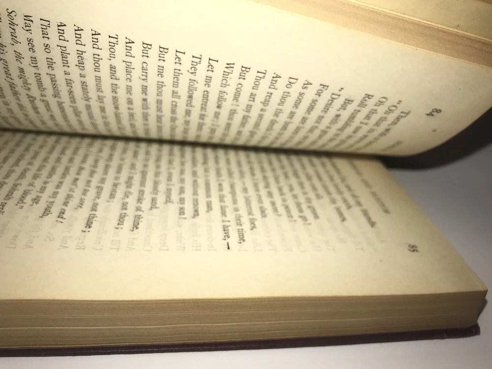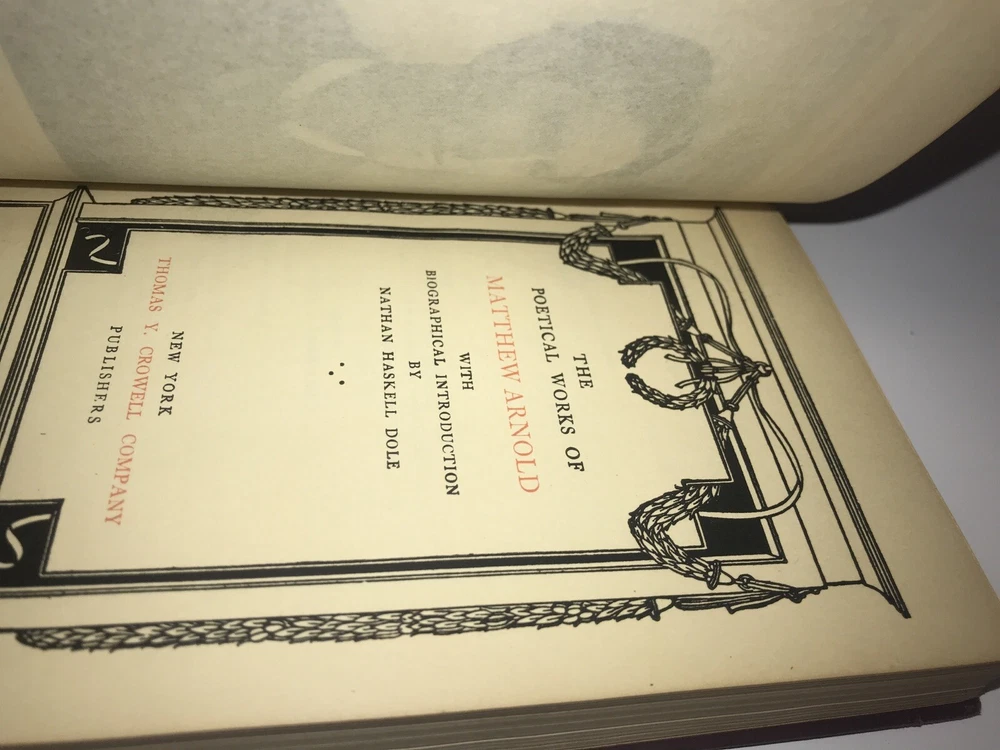 T he complete works of Matthew Arnold. I n mint and unread condition. L eather supple. B ooks unread and tries to close. L ight shelf rubs. Copyright 1897. Frontisplate. Genuine leather. Original binding. Full leather. Gilded. Limp leather is semi hardcover. Light wear to head of spine as shown. Very giftable and presentable. Book is from 1897.