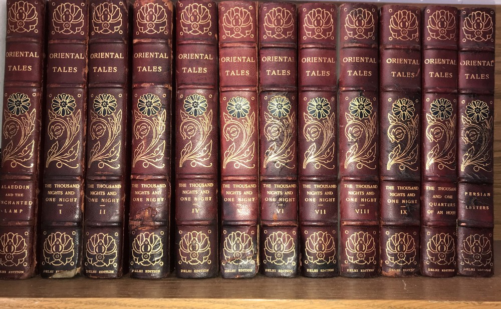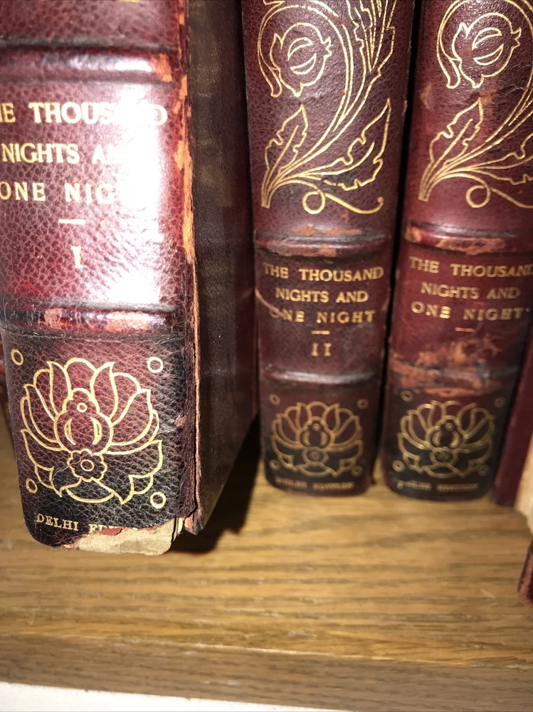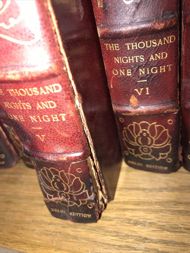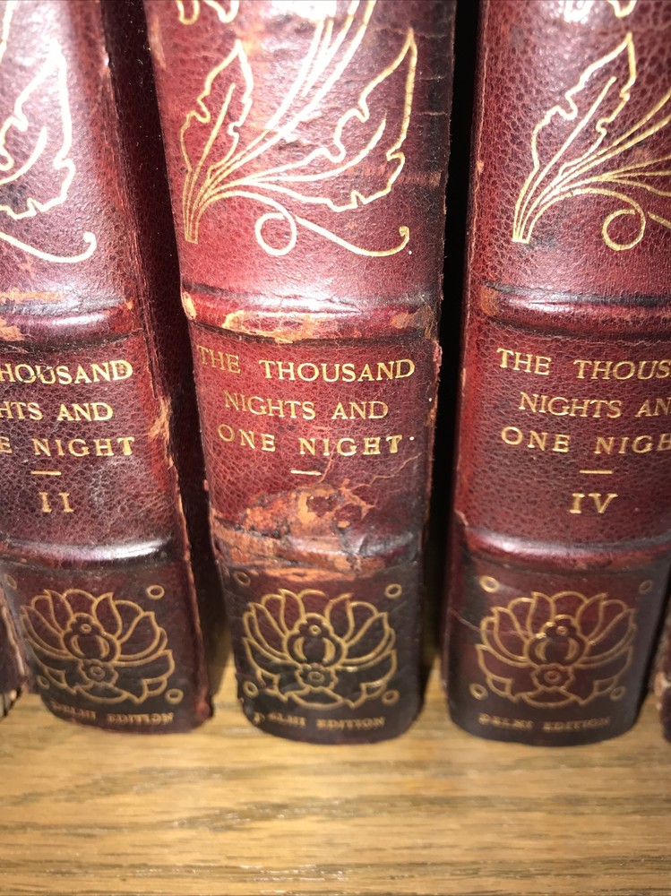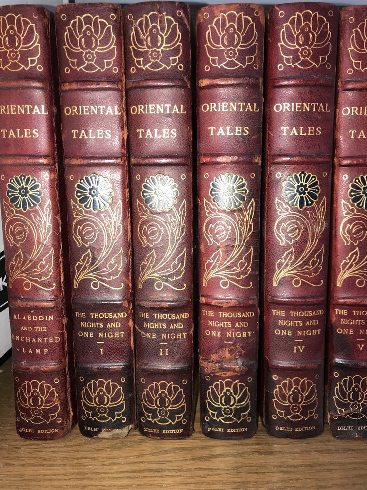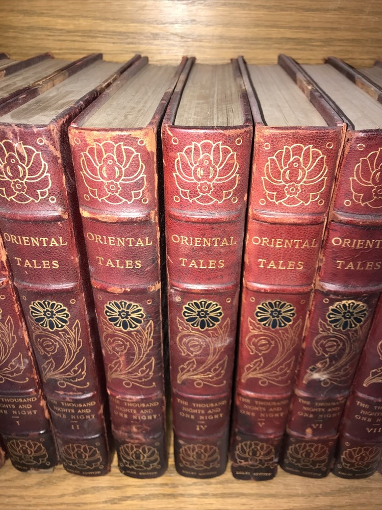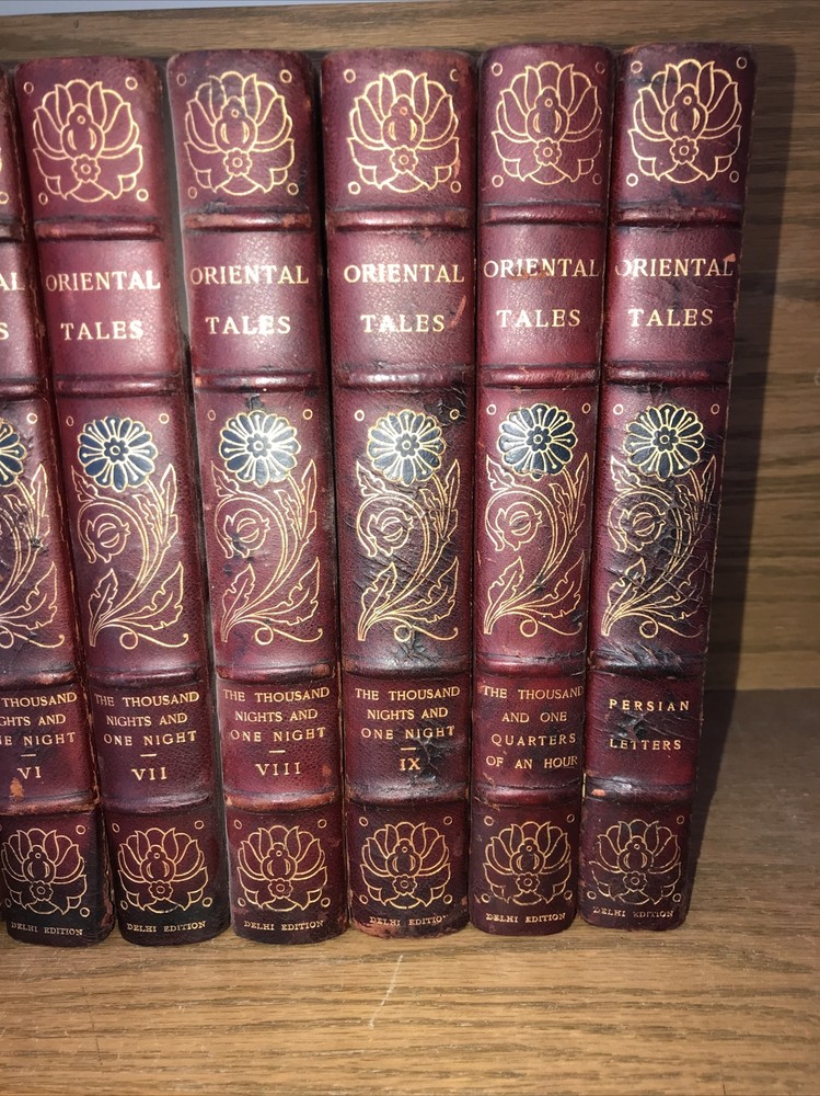 Oriental Tales. Complete in 12. Aladdin + Thousand Nights in 9 volumes + Thousand and One Quarters of an hour + Persian Letters Delhi Edition. Set #77/1000. The Payne translation. Aladdin is dated 1901. Some dates vary. In good condition for the age. Set has deep extremity abrasions. The hinges are attached. I tried showing close ups of the worst abrasions/chips. Some spine damage and splitting. T he paper is fresh rag paper. The leather has some damage that looks antiquarian rustic. Set is still attractive and displayable. Fine press set. Rag paper. Large books at over 9 inches tall. Will be well protected for shipping. 2022.03.10