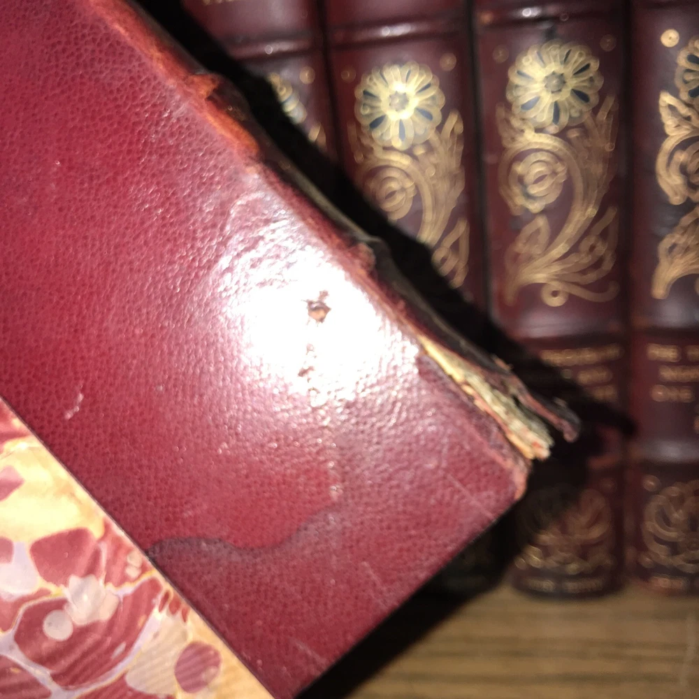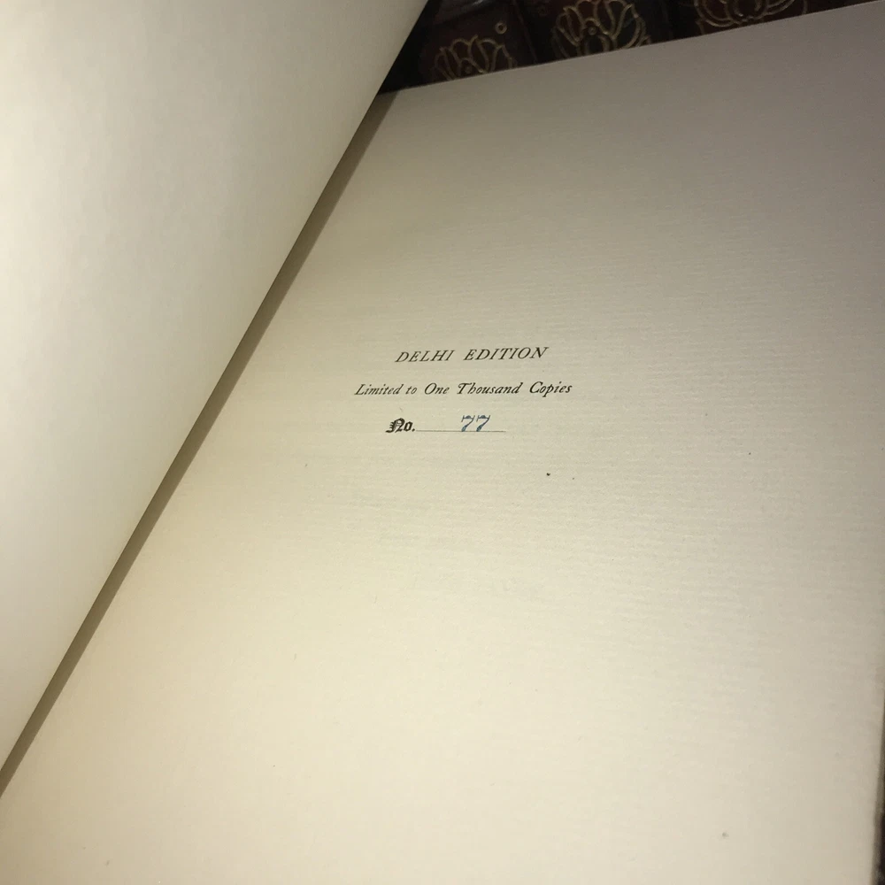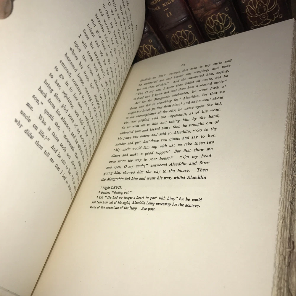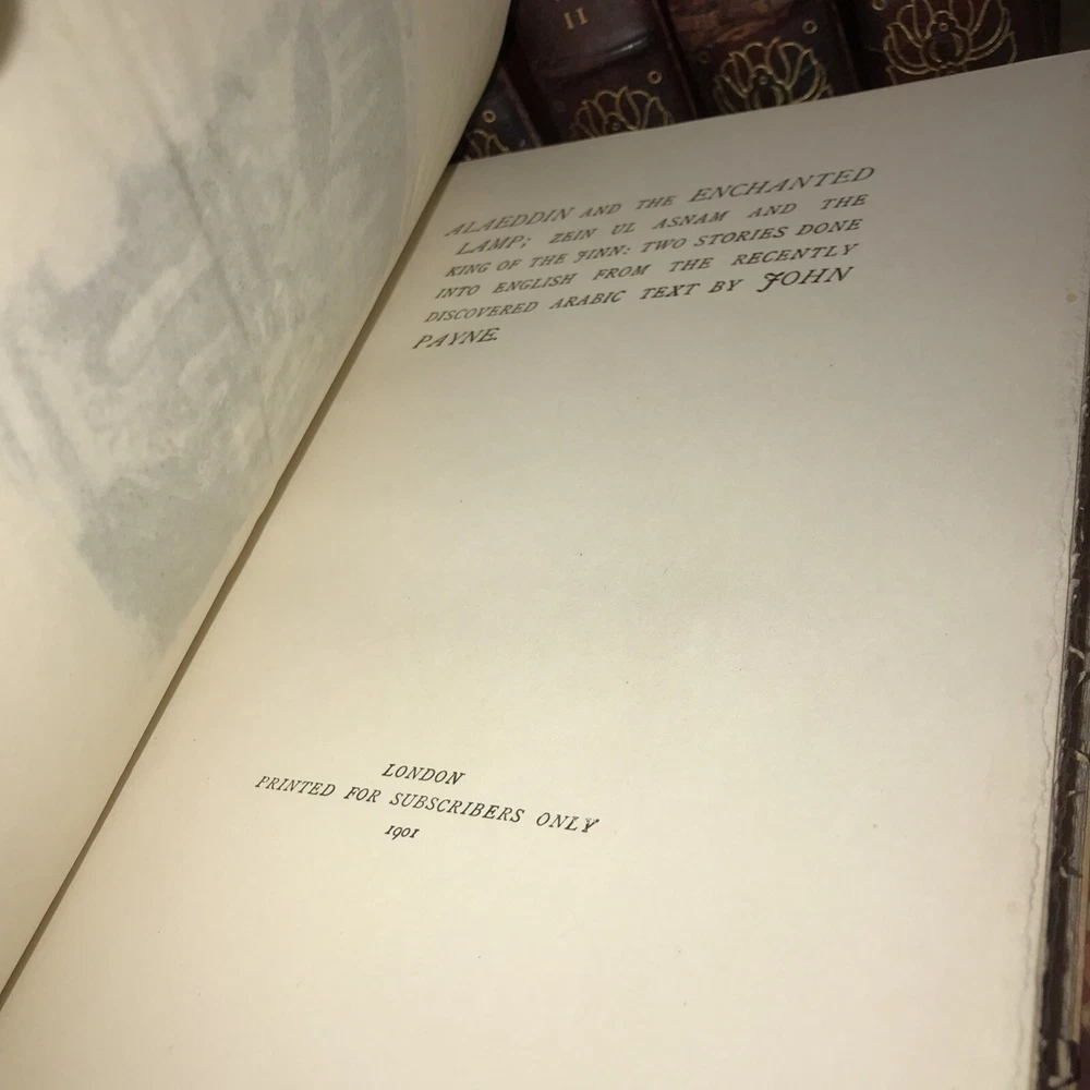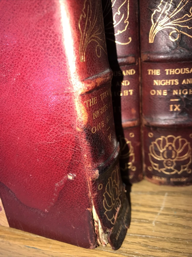 Oriental Tales. Complete in 12. Aladdin + Thousand Nights in 9 volumes + Thousand and One Quarters of an hour + Persian Letters Delhi Edition. Set #77/1000. The Payne translation. Aladdin is dated 1901. Some dates vary. In good condition for the age. Set has deep extremity abrasions. The hinges are attached. I tried showing close ups of the worst abrasions/chips. Some spine damage and splitting. T he paper is fresh rag paper. The leather has some damage that looks antiquarian rustic. Set is still attractive and displayable. Fine press set. Rag paper. Large books at over 9 inches tall. Will be well protected for shipping. 2022.03.10