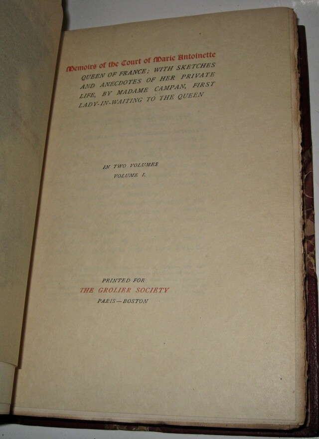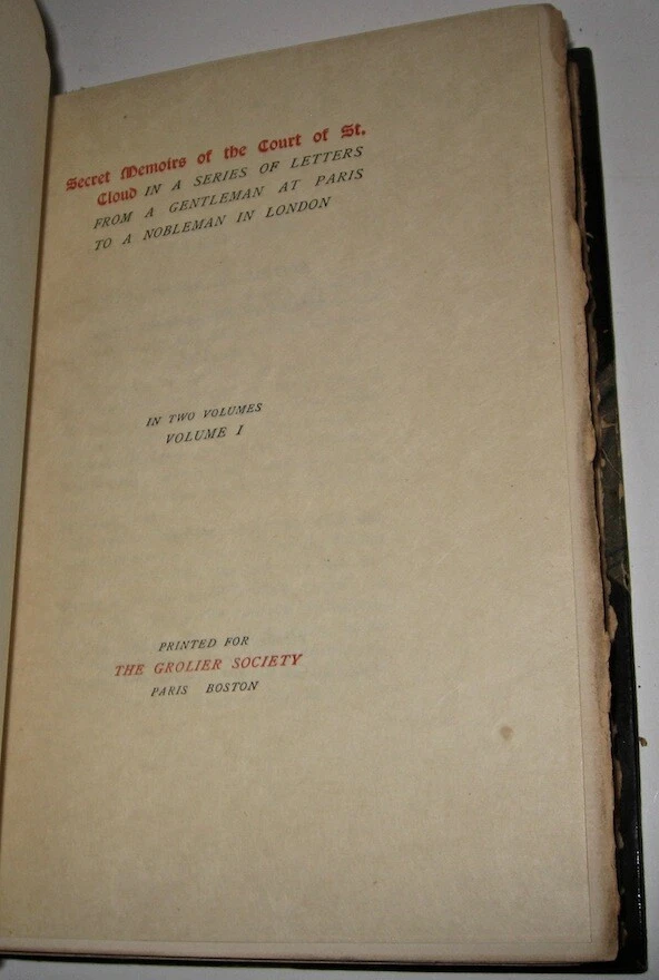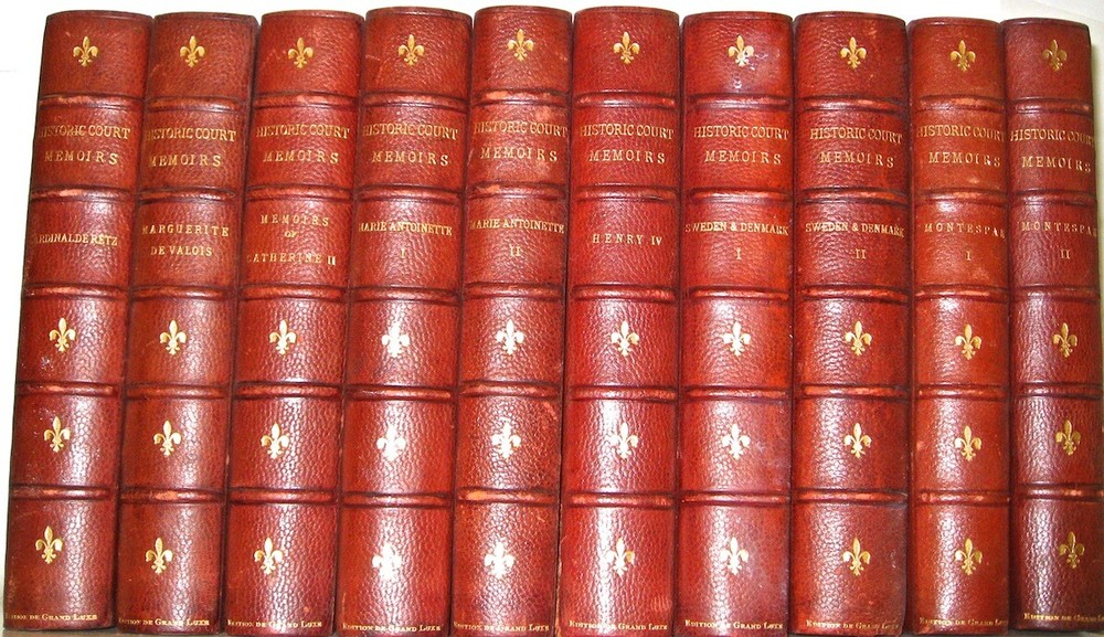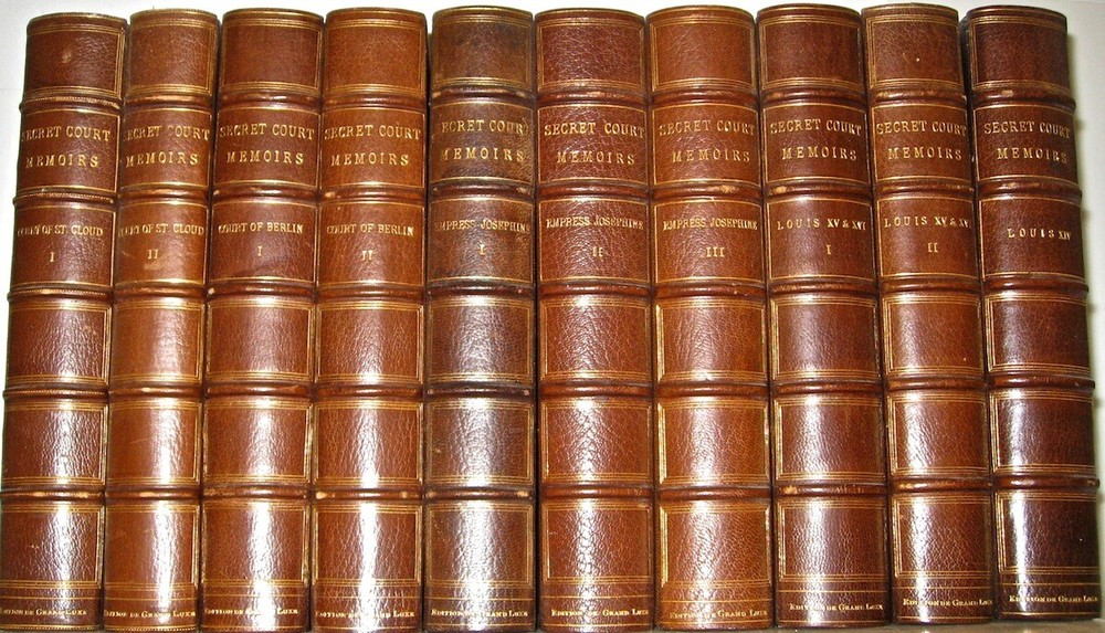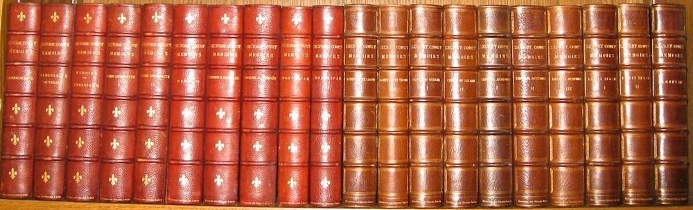 SECRET COURT MEMOIRS. Complete in 20 volumes. Comprised of 2 subsets, in 2 distinct bindings, as shown in the pictures. Some generalized usage wear. The leather is still supple. All hinges attached. Two different binding styles, which means that this set was compiled from two different sets. Each subset is complete in ten volumes, twenty volumes total. The limitation number is different for each set. Large heavy books. These are the highest quality leather bindings. These are the original bindings. Edition de Grand Luxe (Being one of only 1000 sets). Magnificently bound in half red crushed morocco over marbled boards, spines in six compartments separated by raised bands, gilt lettering in two compartments, gilt tooling in remainder, gilt borders on covers, marbled endpapers, t.e.g. Profusely illustrated with tissue-protected plates. No date (c. 1904). The first complete ten-volume set includes: (A) Secret Memoirs of the Court of Berlin, or The Character of the King of Prussia, his Ministers, Mistresses, Generals, Courtiers, Favourites, and the Royal Family of Prussia, by Count Mirabeau (two volumes, 16 plates); (B) Secret Memoirs of the Court of St. Cloud in a Series of Letters from a Gentleman at Paris to a Nobleman in London (two volumes, 16 plates); (C) Secret Memoirs of the Court of the Empress Josephine, with Anecdotes of the Courts of Navarre and Malmaison, by Madame Ducrest (three volumes, 25 plates); (D) Secret Memoirs of the Court of Louis XIV and the Regency, by the Duchesse d'Orleans, Mother of the Regent (one volume, nine plates); (E) Secret Memoirs of the Courts of Louis XV and XVI taken from the Memoirs of Madame du Hausset, Lady's Maid to Madame de Pompadour, and from the Journal of The Princess Lamballe (two volumes, 16 plates).An extremely handsome set. 8vo 8" - 9" tall. 2132 OOTREV