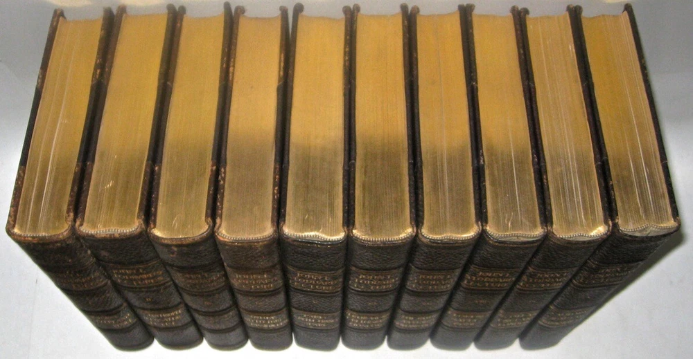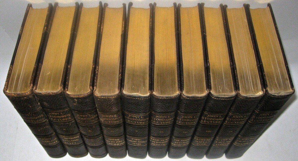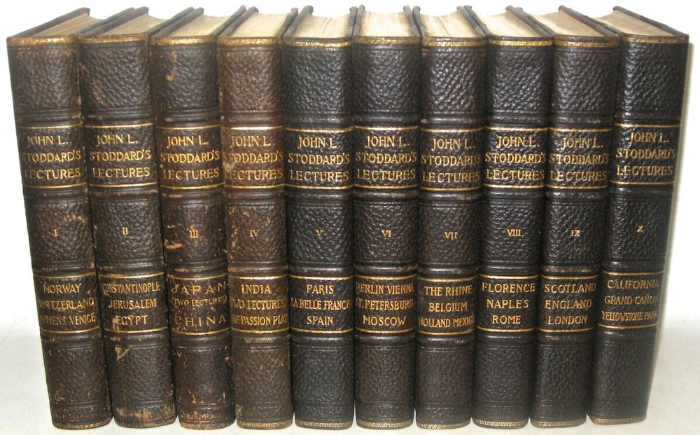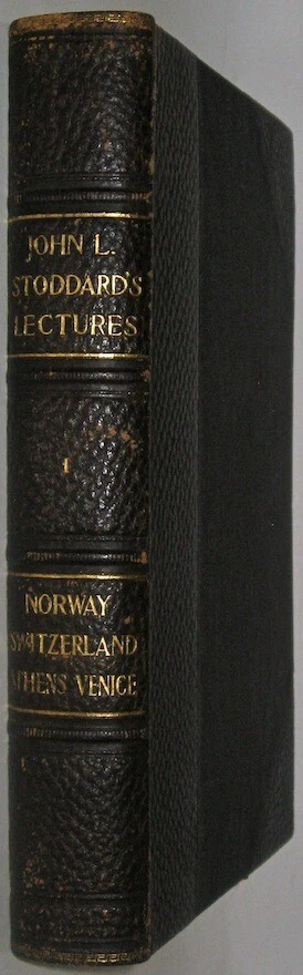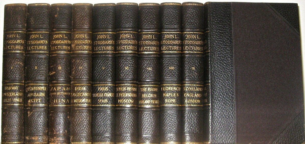 STODDARD'S LECTURES! First Edition of John L. Stoddard's Travel Writings. Complete in 10-volumes, as stated. Printed in 1897-1898! FIRST EDITION / FIRST PRINTING!! This is the First Edition of Stoddard's Lectures. John Lawson Stoddard was an American writer and lecturer known for his travel writings, published as 'Stoddard's Lectures'. The first edition is comprised of larger and heavier volumes than the subsequent editions. These books are extremely heavy. They measure 9.25 inches tall. Printed in 1897. This set is OVER 120 YEARS OLD! Bound in genuine leather. Raised hubs on the spines. Gilded spine. The top edges are gilded. Fully ILLUSTRATED. These are heavy books, printed on thick paper. This first edition is comprised of larger volumes than the subsequent editions. NY, Chicago, & London; Belford, Middlebrook & Co. Printed in 1897, with volume 10 dated 1898. This is the FIRST EDITION of Stoddard's Lectures. 9.25 inches tall. These take up approximately 14.5 inches of shelf space. John L. Stoddard's Travel Writings: v. 1 Norway. Switzerland. Athens. Venice. v. 2 Constantinople. Jerusalem. Egypt. v. 3 Japan (two lectures). China. v. 4 India (two lectures). The Passion play. v. 5 Paris. La belle France. Spain. v. 6 Berlin. Vienna. St. Petersburg. Moscow. v. 7 The Rhine. Belgium. Holland. Mexico. v. 8 Florence. Naples. Rome. v. 9 Scotland. England. London. v. 10 Southern California. Grand cañon of the Colorado River. Yellowstone National Park. In VERY GOOD, Near MINT Condition, with light generalized wear. The leather is supple and fresh. All hinges are 100% fully attached. No writing. The paper is fresh, bright, clean, and appears free of any trace of foxing. Some light shelf wear and abrasion. Some extremity rubbing, some spine abrasion. Minimal signs of use. In exceptional condition. This is the FIRST EDITION of Stoddard's Lectures. A gorgeous set. This first edition is comprised of larger volumes than the subsequent editions. The titles are: Norway; Switzerland; Athens; Venice; Constantinople; Jerusalem; Egypt; Japan (Two Lectures); China; India (Two Lectures); The Passion Play; Paris; La Belle France; Spain; Berlin; Vienna; St. Petersburg; Moscow; The Rhine; Belgium; Holland; Mexico; Florence; Naples; Rome; Scotland; England; London; Southern California; Grand Canon [Canyon] of the Colorado River; Yellowstone National Park; Complete in 10-volumes. This leather set is well over 100 years old! Still bound in the original leather bindings. A gorgeous set! #3738ap 1941 John Lawson Stoddard John Lawson Stoddard (April 24, 1850 – June 5, 1931) was an American writer, hymn writer and lecturer who gained popularity through his travelogues. John Lawson Stoddard Born April 24, 1850 Brookline, Massachusetts , USA Died June 5, 1931 (aged 81) [1] Education Williams College & Yale Divinity School Biography Edit Stoddard was born in Brookline, Massachusetts , in 1850. In 1871 he graduated from Williams College . At Williams he was a member of the fraternity Delta Psi (aka St. Anthony Hall). Later he studied two years of theology at Yale Divinity School . After that he taught Latin and French at Boston Latin School . [2] He was proud of his descent from Solomon Stoddard . He began traveling around the world in 1874 and published Red-Letter Days Abroad in 1884. He turned his experiences into a series of popular lectures delivered throughout North America. These lectures were periodically published in book form as John L. Stoddard's Lectures and eventually numbered 10 volumes and five supplements (1897-1898). [3] In 1901, Stoddard published a book on Gibraltar . [4] The books include numerous illustrations derived from the immense catalog of photographs taken by Stoddard, and cover every subject, from art and architecture, to archaeology and natural history. The books were immensely popular in their day and many copies still survive. Later in life, Stoddard also published poetry, as well as books on religious subjects. Brought up a Protestant, Stoddard was an agnostic for more than 30 years before converting with his wife to Roman Catholicism. In 1922 he published Rebuilding a Lost Faith , a famous work of apologetics which is still in print. The Main Street of Gibraltar - illustrated his 1901 book. [4] Stoddard was a proponent of the restoration of the Jews to Israel . In Volume 2 of his Lectures he told the Jews, “You are a people without a country; there is a country without a people. Be united. Fulfill the dreams of your old poets and patriarchs. Go back, go back to the land of Abraham.” [5] A sentiment popularized as " A land without a people for a people without a land ." However, his son Lothrop Stoddard , who remained agnostic after his father's conversion, [6] [7] held antisemitic views. [8] During his later life he used his fortune to support his adopted home of Merano , South Tyrol, contributing substantially to the building of its secondary school and to a home for homeless youth, now used as a rehabilitation center. John L. Stoddard's Lectures Edit v. 1 Norway. Switzerland. Athens. Venice. v. 2 Constantinople. Jerusalem. Egypt. v. 3 Japan (two lectures). China. v. 4 India (two lectures). The Passion play. v. 5 Paris. La belle France. Spain. v. 6 Berlin. Vienna. St. Petersburg. Moscow. v. 7 The Rhine. Belgium. Holland. Mexico. v. 8 Florence. Naples. Rome. v. 9 Scotland. England. London. v. 10 Southern California. Grand cañon of the Colorado River. Yellowstone National Park. v. 11 Photographs - Portfolio of Photographs - Photographic view of the entire world of nature and art, the old and new world (256 photos). Supplementary volumes: no. 1 Ireland (two lectures). Denmark. Sweden. no. 2 Canada (two lectures). Malta. Gibraltar. no. 3 South Tyrol. Around Lake Garda. The Dolomites. no. 4 Sicily. Genoa. A drive through the Engadine. no. 5 Lake Como. The upper Danube. Bohemia. Please see my other listings for similar books and sets. I’m more flexible on pricing if you are interested i
