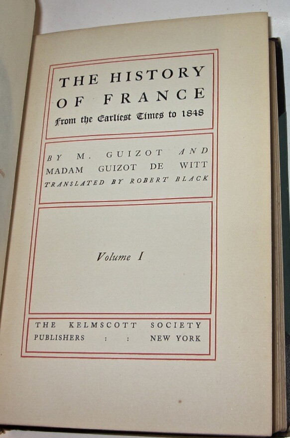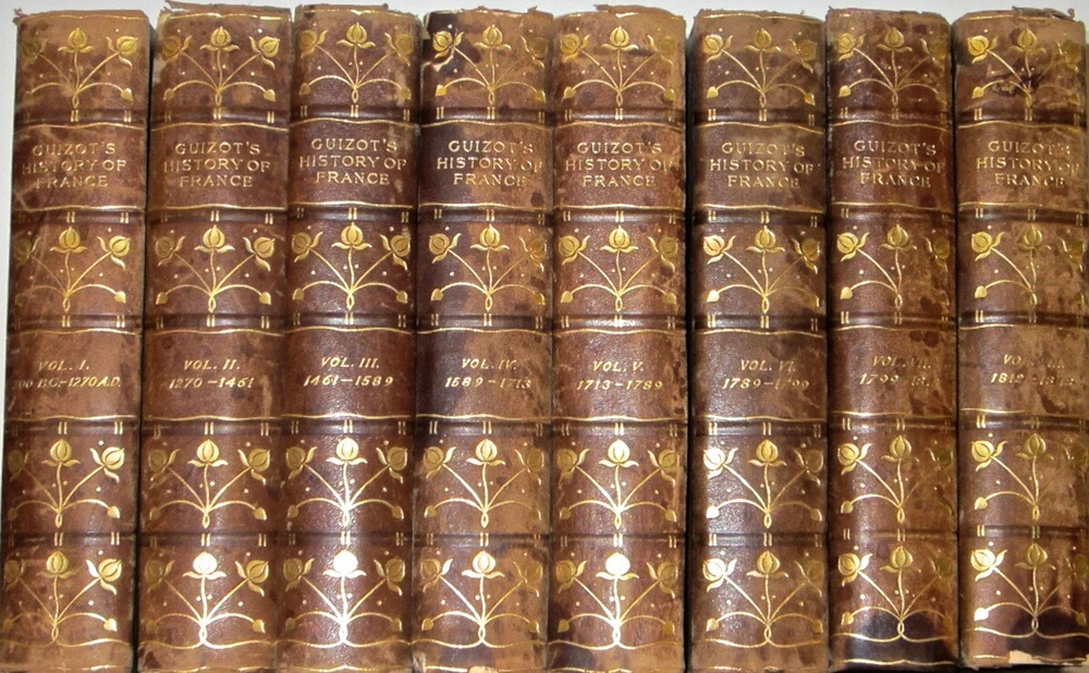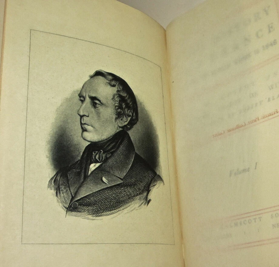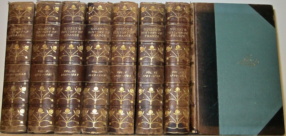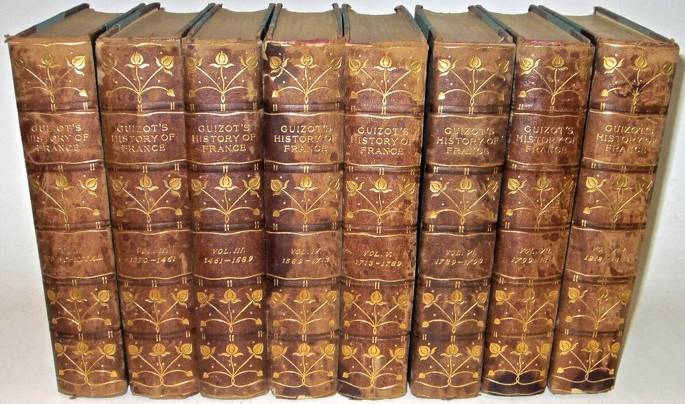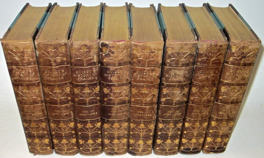 THE HISTORY OF FRANCE! Complete in 8 volumes. Printed in English. This is a nice antiquarian set.These are the original bindings.This set has a lot of external wear, splitting and abrasion to the bindings.There is chipping along the spine, some which is not visible in the picture.More detail will be added later. Francois Guizot was the 17th Prime Minister of France and famous french historian. The leather is thin or low grade. The leather has chipping splitting and some damage. THE HISTORY OF FRANCE. Complete in 8 volumes. Being A Popular History of France From The Earliest Times. Authorized Edition. The Kelmscott Society. In excellent condition for their age. The hinges are all attached, with some rubbing. Some general rubs/wear signs of usage. The leather is thin or low grade. The leather has chipping splitting and some damage. The spines are somewhat dry, and worn, as shown in the pictures. Appears free of foxing. This set displays beautifully. This would make an excellent gift and/or addition to any fine library. This is a nice old antiquarian set.These are the original bindings.This set has a lot of external wear and abrasion to the bindings.There is chipping along the spine, some which is not visible in the picture.More detail will be added later. Each book will be individually wrapped and well protected. item#2167 ootFrançois Guizot From Wikipedia, the free encyclopedia Jump to navigationJump to search François Guizot Guizot, François - 2.jpg François Guizot by Jehan Georges Vibert (19th century) 17th Prime Minister of France In office 18 September 1847 – 24 February 1848 Monarch Louis Philippe I Preceded by Jean-de-Dieu Soult Succeeded by Jacques-Charles Dupont Minister of Foreign Affairs In office 29 October 1840 – 24 February 1848 Monarch Louis Philippe I Prime Minister Jean-de-Dieu Soult Preceded by Adolphe Thiers Succeeded by Alphonse de Lamartine Minister of Public Education In office 6 September 1836 – 15 April 1837 Monarch Louis Philippe I Prime Minister Louis-Mathieu Molé Preceded by Joseph Pelet de la Lozère Succeeded by Narcisse-Achille de Salvandy In office 18 November 1834 – 22 February 1836 Monarch Louis Philippe I Prime Minister Édouard Mortier Victor de Broglie Preceded by Jean-Baptiste Teste Succeeded by Joseph Pelet de la Lozère In office 11 October 1832 – 10 November 1834 Monarch Louis Philippe I Prime Minister Jean-de-Dieu Soult Preceded by Amédée Girod de l'Ain Succeeded by Jean-Baptiste Teste Minister of Interior In office 1 August 1830 – 2 November 1830 Monarch Louis Philippe I Prime Minister Jacques Laffitte Preceded by Victor de Broglie Succeeded by Camille de Montalivet Member of the Chamber of Deputies for Calvados In office 23 June 1830 – 24 February 1848 Preceded by Louis Nicolas Vauquelin Succeeded by Jean-Charles Besnard Constituency Lisieux Personal details Born François Pierre Guillaume Guizot 4 October 1787 Nîmes, France Died 12 September 1874 (aged 86) Saint-Ouen-le-Pin, France Political party Doctrinaire (1814–1830) Party of Resistance (1830–1848) Party of Order (1848–1852) Spouse(s) Pauline de Meulan (1812–1827) Élisa Dillon (1828–1833) Children François (1819–1837) Henriette (1829–1908) Pauline (1831–1874) Guillaume (1833–1892) Alma mater University of Geneva Profession Historian, teacher François Pierre Guillaume Guizot (French: [fʁɑ̃swa pjɛʁ ɡijom ɡizo]; 4 October 1787 – 12 September 1874) was a French historian, orator, and statesman. Guizot was a dominant figure in French politics prior to the Revolution of 1848. A moderate liberal[1][2] who opposed the attempt by King Charles X to usurp legislative power, he worked to sustain a constitutional monarchy following the July Revolution of 1830. He then served the "citizen king" Louis Philippe, as Minister of Education, 1832–37, ambassador to London, Foreign Minister 1840–1847, and finally Prime Minister of France from 19 September 1847 to 23 February 1848. Guizot's influence was critical in expanding public education, which under his ministry saw the creation of primary schools in every French commune. But as a leader of the "Doctrinaires", committed to supporting the policies of Louis Phillipe and limitations on further expansion of the political franchise, he earned the hatred of more left-leaning liberals and republicans through his unswerving support for restricting suffrage to propertied men, advising those who wanted the vote to "enrich yourselves" (enrichissez-vous) through hard work and thrift. As Prime Minister, it was Guizot's ban on the political meetings (called the campagne des banquets or the Paris Banquets, which were held by moderate liberals who wanted a larger extension of the franchise)[3] of an increasingly vigorous opposition in January 1848 that catalyzed the revolution that toppled Louis Philippe in February and saw the establishment of the French Second Republic. Contents 1 Early years 2 "The Man of Ghent" 3 A minister of the Citizen-King 4 The second Soult government 5 1848 and after 6 Legacy 7 Quotes 8 Works 9 See also 10 References 11 Further reading 12 External links Guizot was born at Nîmes to a bourgeois Protestant family.[4] On 8 April 1794, when François Guizot was 6, his father was executed on the scaffold at Nîmes during the Reign of Terror.[5] From then on, the boy's mother was completely responsible for his upbringing. Driven from Nîmes by the Revolution, Madame Guizot and her son went to Geneva, where he was educated. In spite of her decided Calvinistic opinions, the theories of Jean-Jacques Rousseau influenced Madame Guizot. A strong Liberal, she even adopted the notion inculcated in Emile that every man ought to learn a manual trade or craft. Guizot learnt carpentry, and succeeded in making a table with his own hands, which is still preserved. In the work which he entitled Memoirs of My Own Times Guizot omitted all personal details of his early life. In 1805 he arrived in Paris and he entered