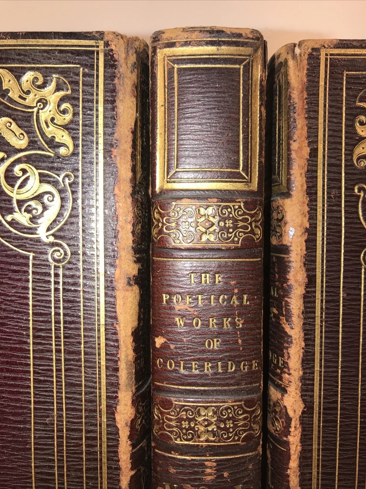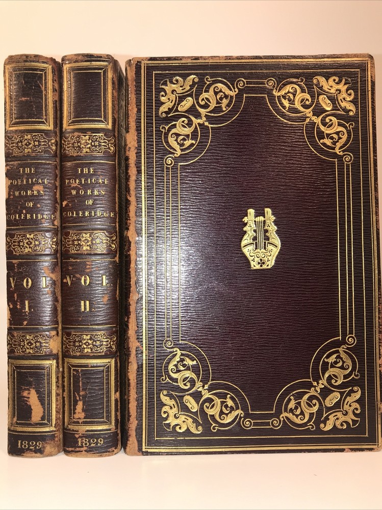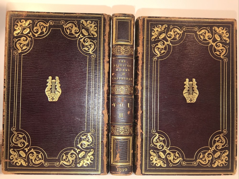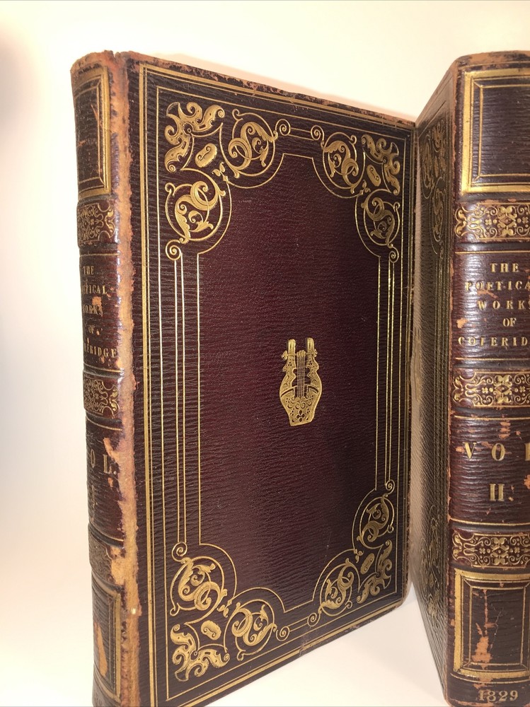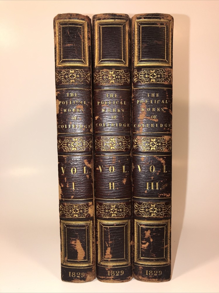 Complete in 3 volumes. In the original bindings. Printed in 1829. Highest grade full leather with intricate lyre and gilding. A ll edges cased in gold. This second edition has new content appearing for the first time that was not present in the first 1828 edition. Early Coleridge us difficult to obtain. Printed on quality rag paper. External abrasions and rubbing. Hinges are strong but starting as shown in the pictures. Early dealer notation upfront in pencil. Armorial bookplate. Will be well protected for shipping.