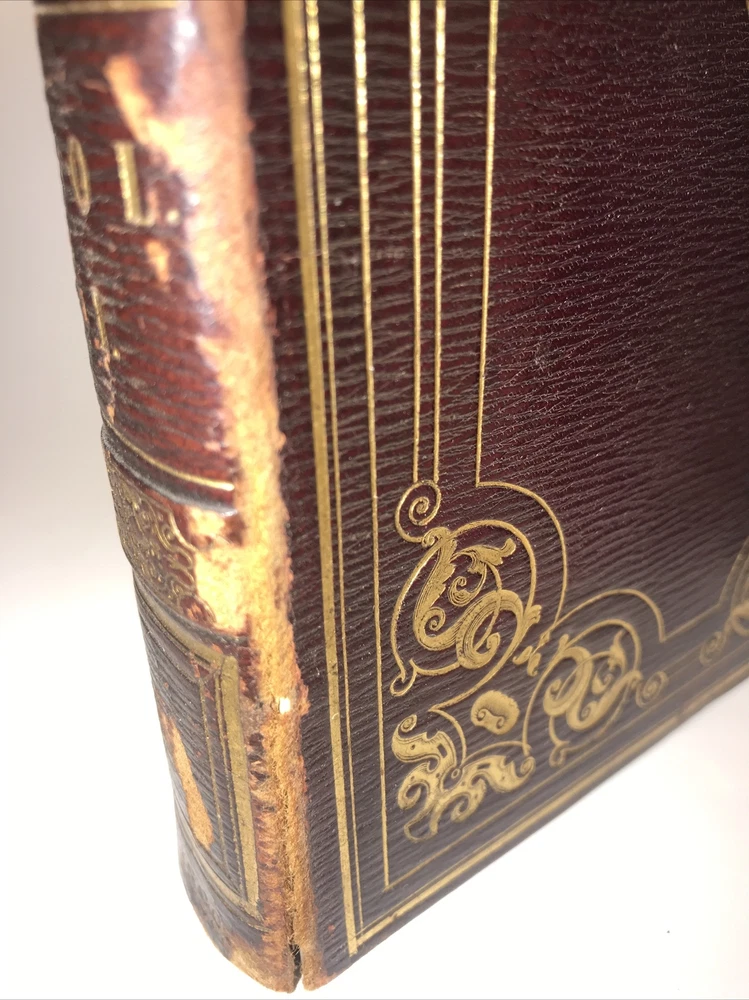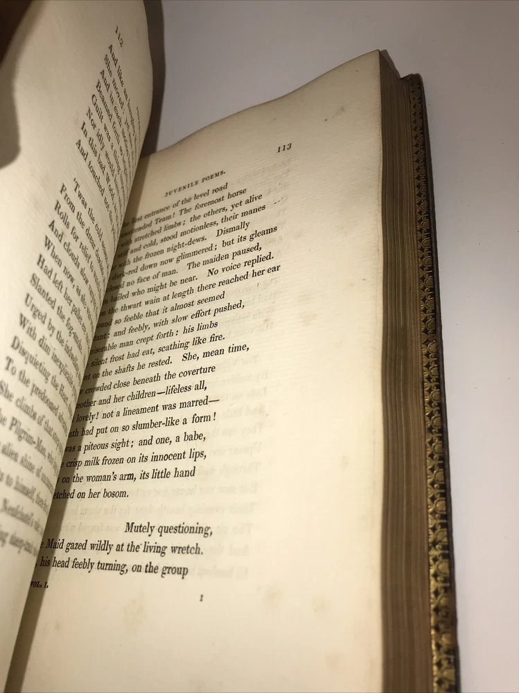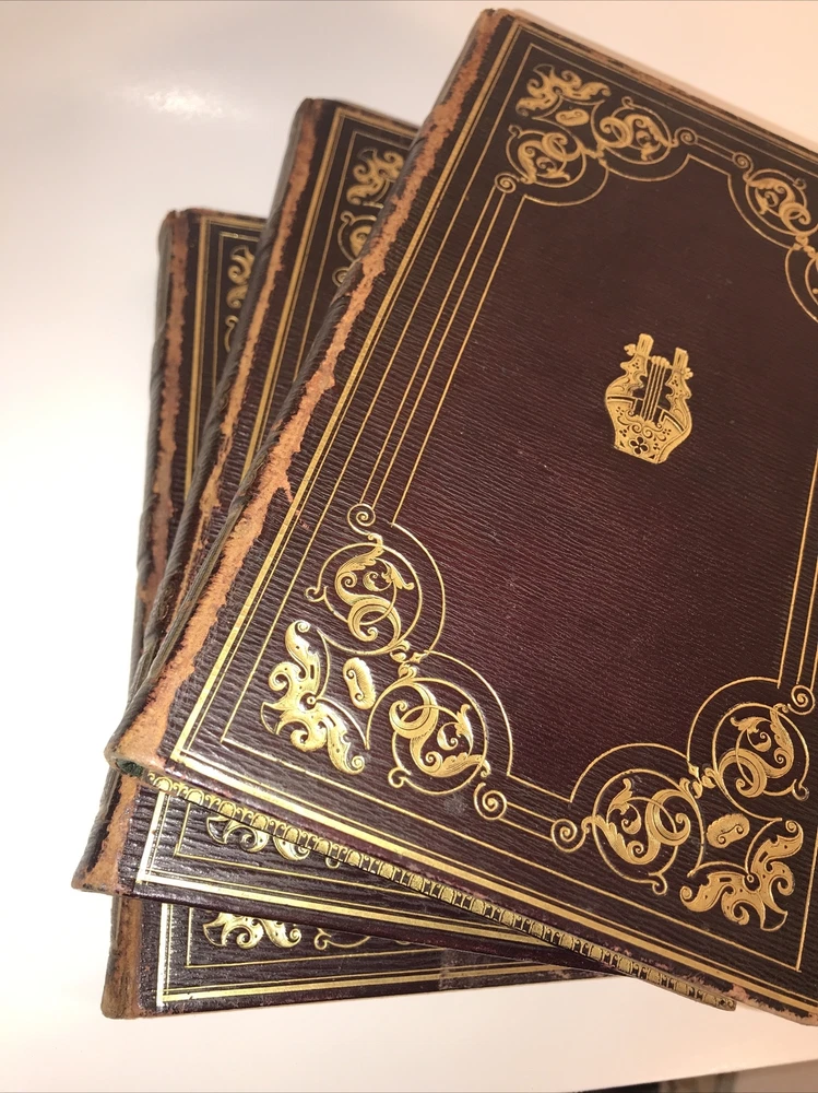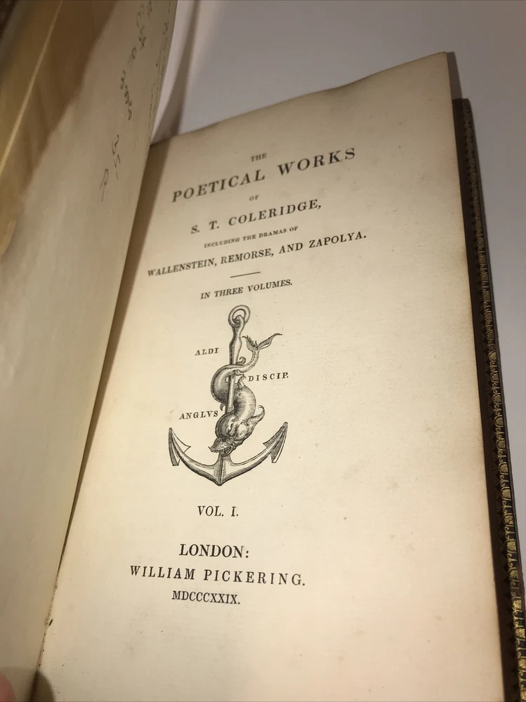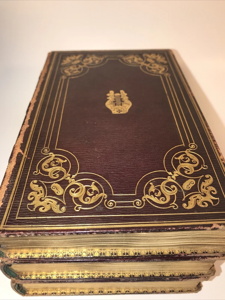Complete in 3 volumes. In the original bindings. Printed in 1829. Highest grade full leather with intricate lyre and gilding. A ll edges cased in gold. This second edition has new content appearing for the first time that was not present in the first 1828 edition. Early Coleridge us difficult to obtain. Printed on quality rag paper. External abrasions and rubbing. Hinges are strong but starting as shown in the pictures. Early dealer notation upfront in pencil. Armorial bookplate. Will be well protected for shipping.