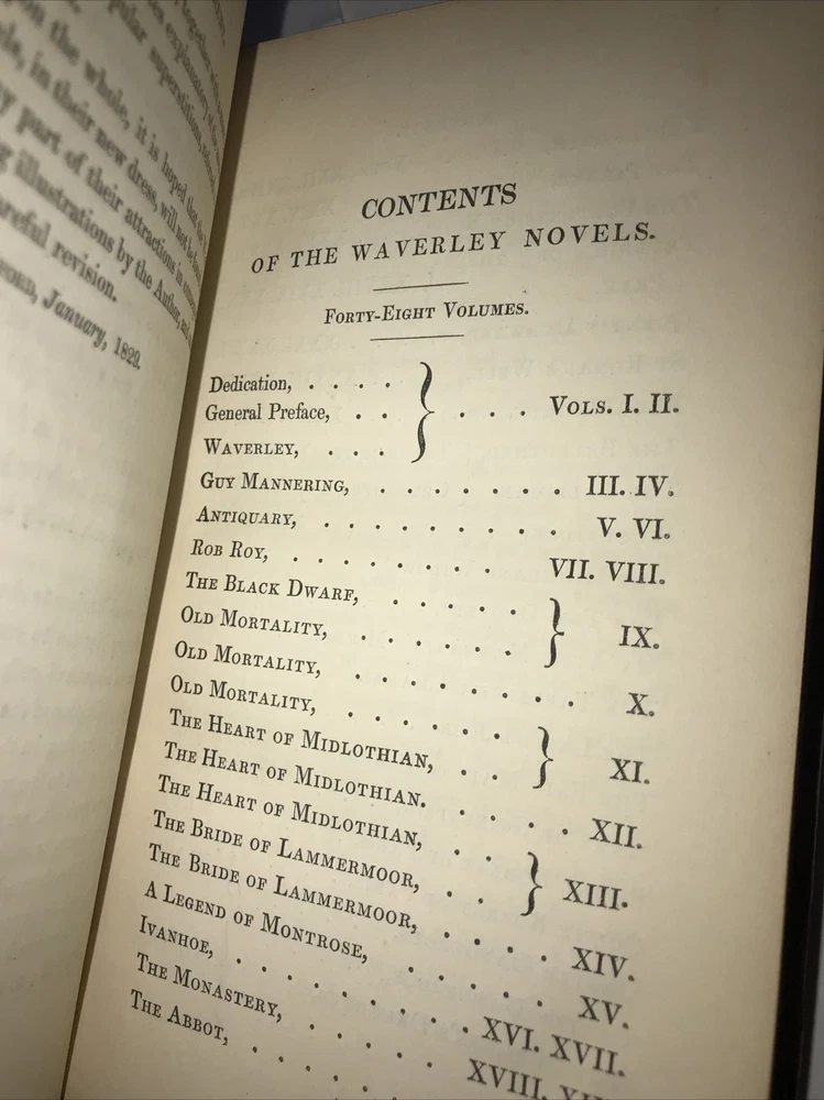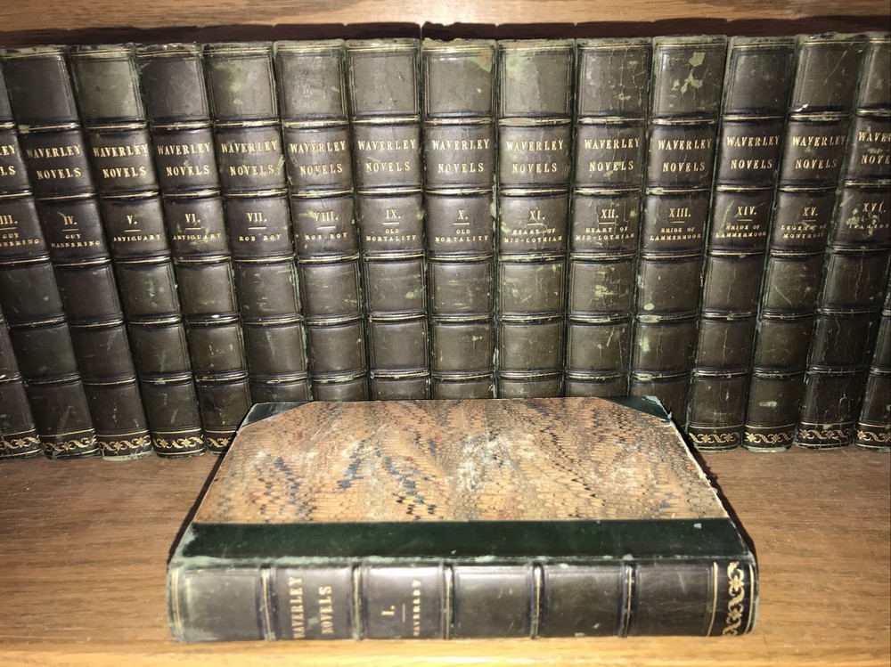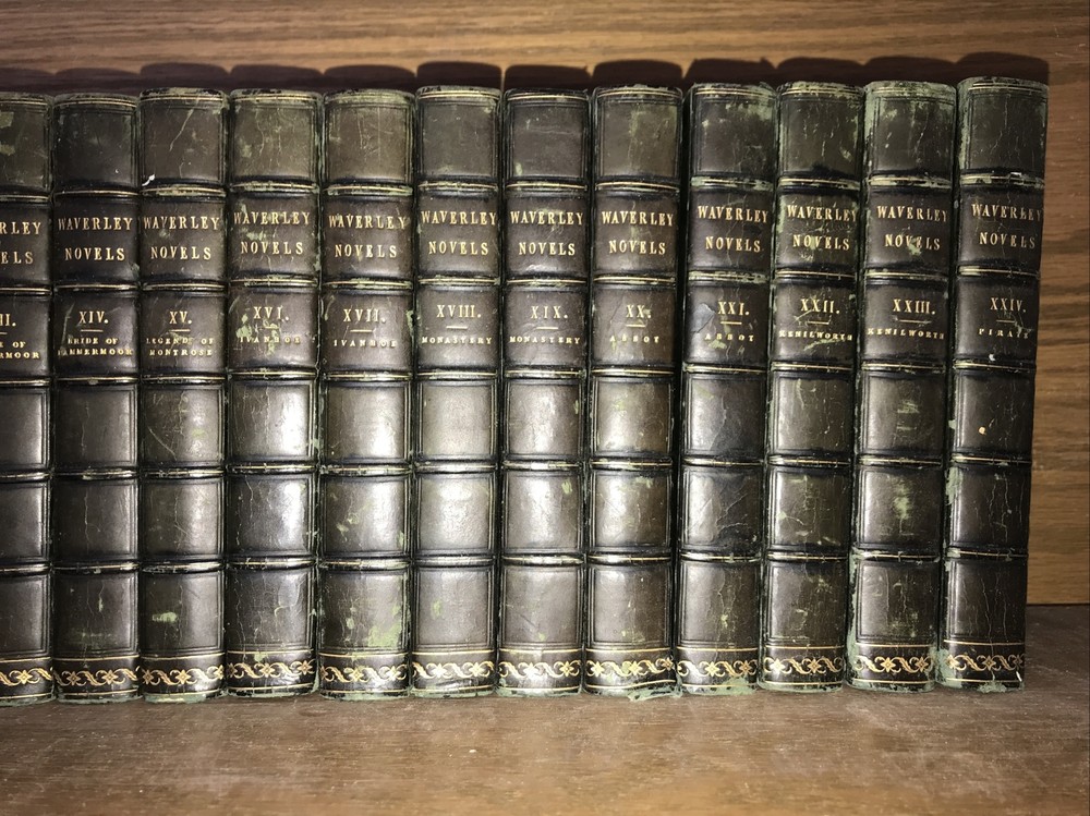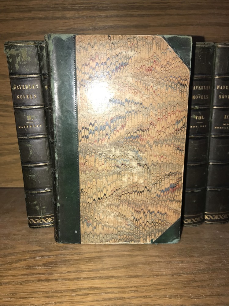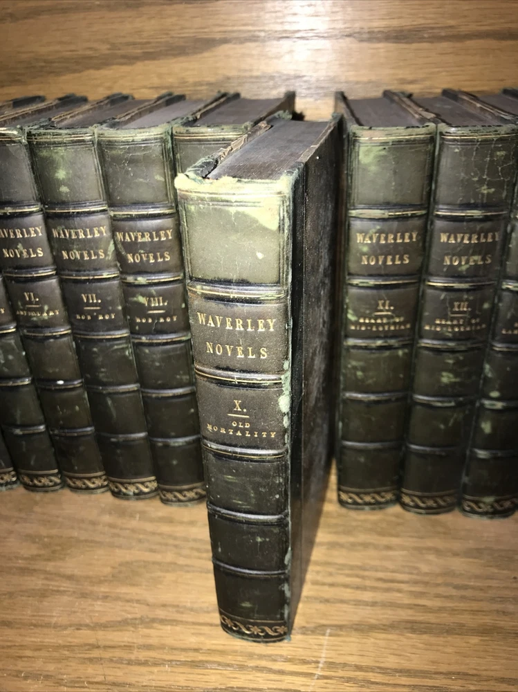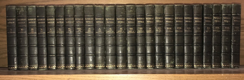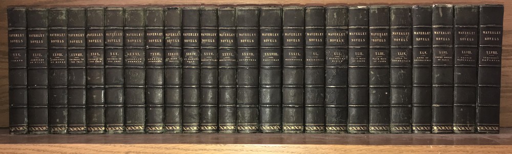 Set is complete in 48 volumes which is standard. First issue. Printed in 1829-1832. First collected edition of the Waverly novels. In the original bindings. Condition: Set has some condition flaws. Generalized shelf abrasions. Still an extremely attractive set. All hinges strongly attached. The plates are foxed. Abrasions. Some gouging. Some minor splits or micro head caps chips. The set is consistent in its appearance. The main condition flaw is in volume ten, Old Mortality, is missing pages 1-4, And the frontisplate is detached. This is articulated in the pictures as well. The missing pages could be acquired from a similar set and then bound in by a professional bindery in order to complete the four missing pages, or kept as is. Old armorial bookplate on front end papers. Still an attractive set for rustic antiquarian display. The paper is high grade and this could be a good reading set from the original first collected edition. Approximately 6 inches tall. These are smaller sized, as issued. Each book will be individually wrapped and well protected for shipping via Priority Mail. 2022.03.23
