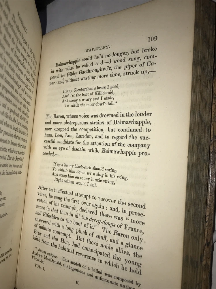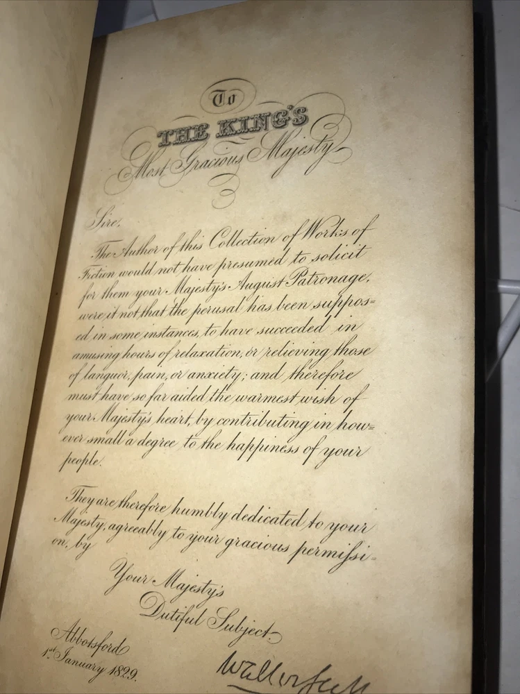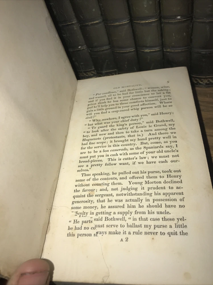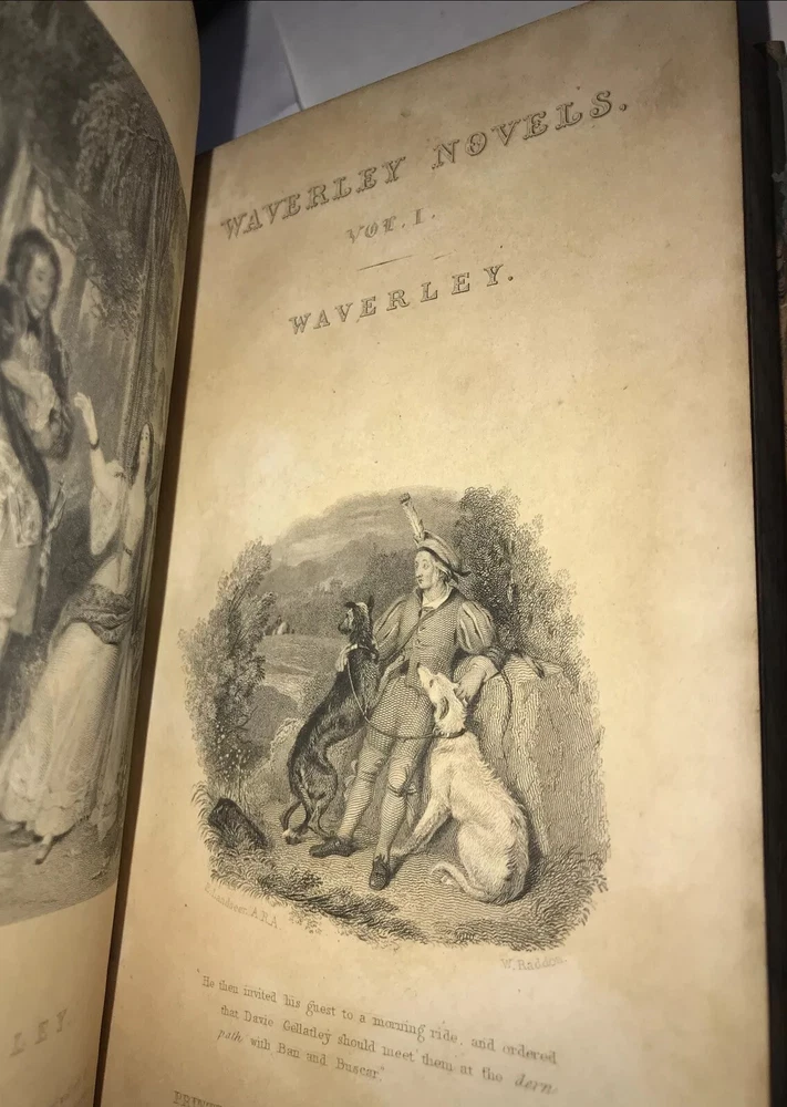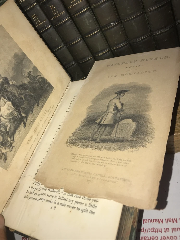 Set is complete in 48 volumes which is standard. First issue. Printed in 1829-1832. First collected edition of the Waverly novels. In the original bindings. Condition: Set has some condition flaws. Generalized shelf abrasions. Still an extremely attractive set. All hinges strongly attached. The plates are foxed. Abrasions. Some gouging. Some minor splits or micro head caps chips. The set is consistent in its appearance. The main condition flaw is in volume ten, Old Mortality, is missing pages 1-4, And the frontisplate is detached. This is articulated in the pictures as well. The missing pages could be acquired from a similar set and then bound in by a professional bindery in order to complete the four missing pages, or kept as is. Old armorial bookplate on front end papers. Still an attractive set for rustic antiquarian display. The paper is high grade and this could be a good reading set from the original first collected edition. Approximately 6 inches tall. These are smaller sized, as issued. Each book will be individually wrapped and well protected for shipping via Priority Mail. 2022.03.23