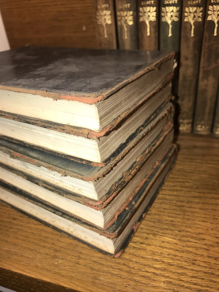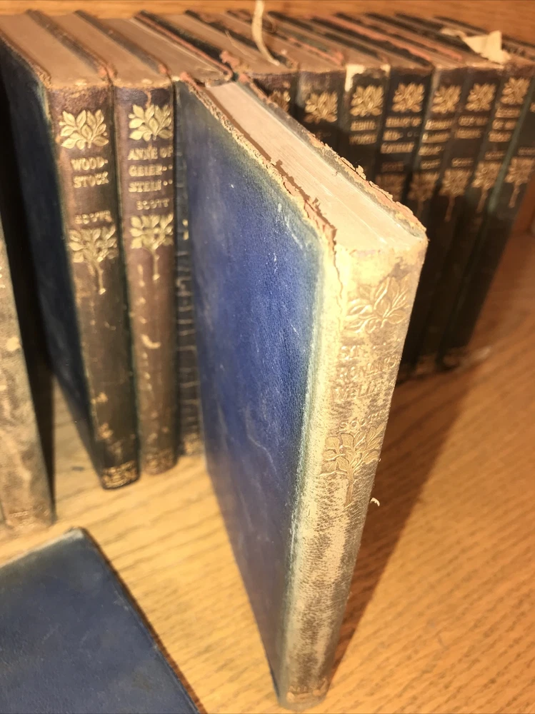 29 volumes. 8 are duplicates. Not complete. 19 out of 25 + 8 duplicates = 29 volumes. In rustic damaged condition. If condition matters please do not buy this. Heavy abrasions and extremity wear. Hinges starting. The leather is peeling away from the covers as clearly shown in the pictures. These are small approximately 6 inches tall. These are semi softcover. The covers are limp. These are dated 1907. Some dates may vary. Early bookplate inscription. Set has obvious damage shown throughout the pictures. I can’t change the condition. Each book will be individually wrapped and well protected for shipping via Priority Mail. 2341h