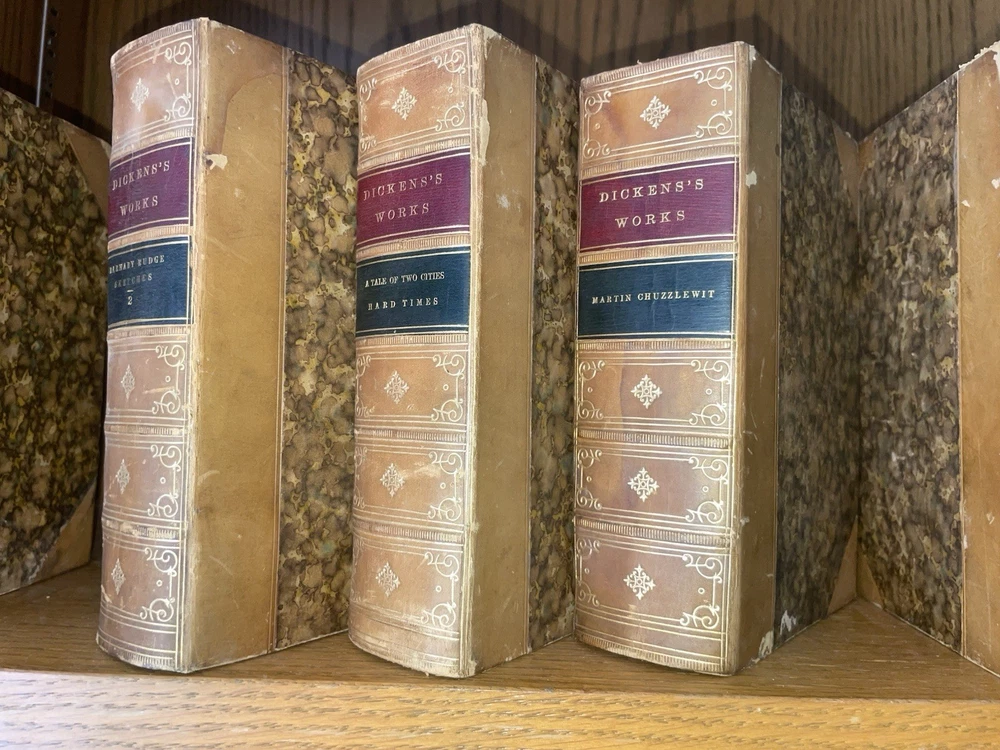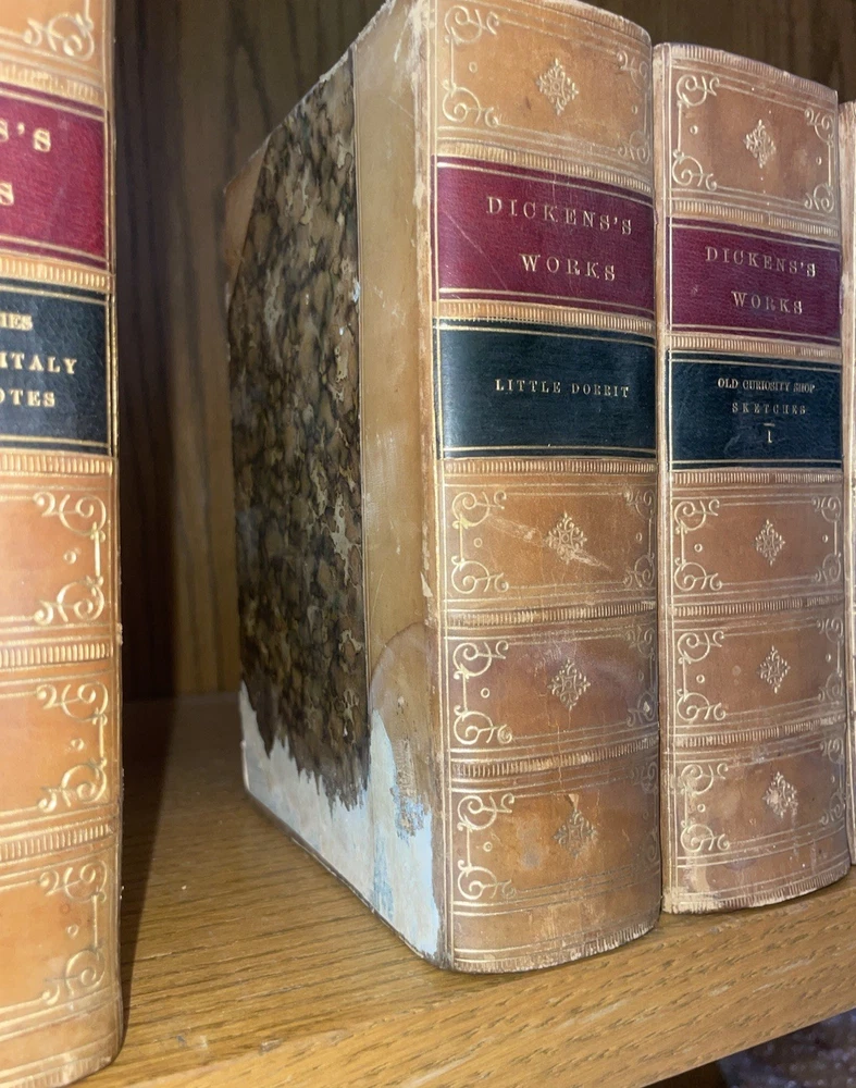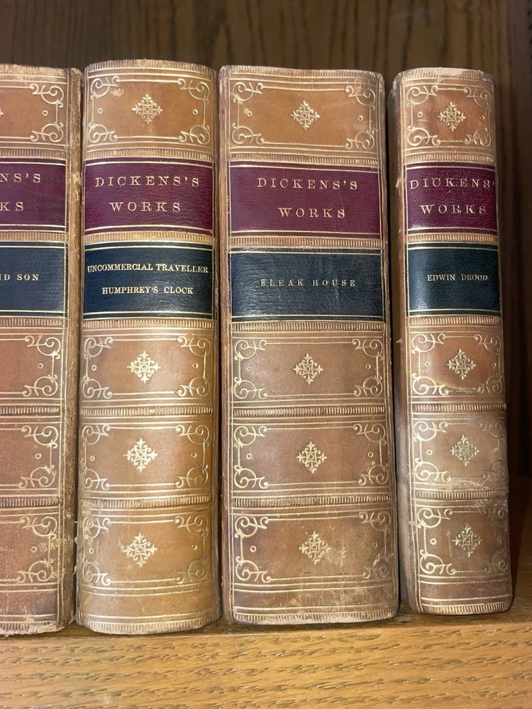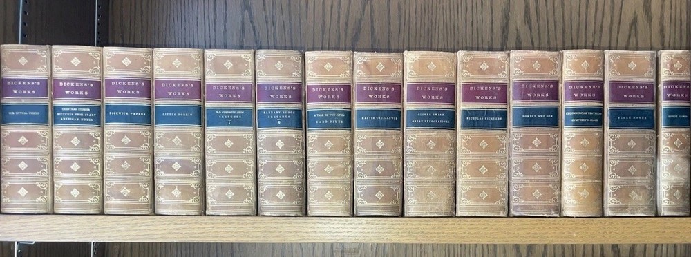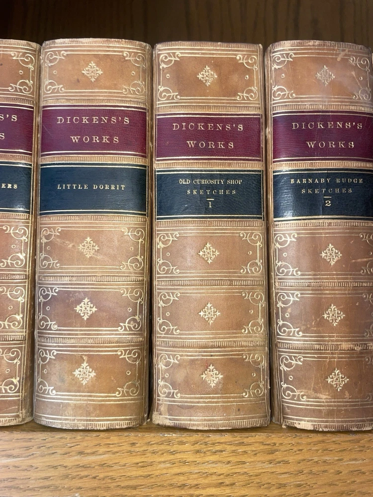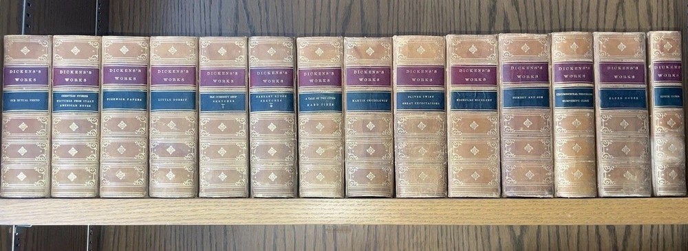 Complete Works of Charles Dickens. Complete in 14 Volumes. Printed in 1870 to 1872. The first collected edition was printed in 1870. This set is as early as possible, without being the first collected edition. The set is complete with all of the works of Charles Dickens. This set has all the titles that are found in every other set. This set is bound into 14 volumes. The Sketches volumes are subdivided into Part One and Part Two, and bound into the other books, thereby reducing the volume count from 15 volumes, to 14 volumes. Bound in the original leather bindings. The bindings are original. Quality rag paper. The paper is high quality and low acid content. The paper is not fragile or brittle as is common in later Victorian printings. Steel engraved frontisplates. Set is in very good condition overall. The leather is supple. The external hinges are all sound There is internal and separation along the paper on the inside of approximately five volumes, showing some separation from the text block. This may be bothersome. Some edge rubbing and other external wear. Set has some evidence of water exposure, and some tide marks mostly external. There is some external damage due to previous water exposure as shown in the pictures, this may be bothersome. Aside from these condition flaws this is an exceptional Victorian set of Dickens. Overall an exceptional antiquarian set of Dickens in leather. The main condition flaws are some internal separation of the bindings from the text block, and there’s some evidence of water exposure, which may be bothersome, otherwise this is an exceptional set of Dickens. The bindings are original. All external hinges are sound and the leather supple. There is internal hinge separation along the internal paper with the binding separating from the text block in some volumes. The external hinges themselves are sound. Quality paper can be read without damage. Globe Edition Printings range from 1870 - 1872 as it took 2 years to publish the set. Beautiful genuine leather and marble edge bindings on all volumes. Books have wear specifically on front and rear covers, however nothing unexpected for being over 150 years old. The spines however are in excellent condition with no sunfading. No loose or missing pages. These Globe Editions were published in various cost levels, with these leather editions being perhaps the most expensive bindings offered by the publisher. Full marbling on all edges, very nicely tooled leather with gold details, etc. These measure 7 inches tall. This set takes up approximately 28 inches of shelf space. This set is complete with all Charles Dickens works. Works include: Little Dorrit Christmas Stories Pictures from Italy American Notes A Tale of Two Cities Hard Times Old Curiosity Shop Sketches (1 and 2) (subdivided and bound into two other volumes) Bleak House Martin Chuzzlewit Nicholas Nickelby Our Mutual Friend Dombey and Son Barnaby Rudge Pickwick Papers Edwin Drood Uncommercial Traveler Humphrey's Clock Oliver Twist Great Expectations Quality paper. Paper is fresh. Leather supple. Very good overall, some internal separation and some water exposure to some volumes. Some generalized abrasion. All external hinges sound. Very good overall. Good only to some areas. Still an exceptional Victorian set of Charles Dickens in the original bindings. This will be well protected for shipping. Please see my other listings for similar books. 2025.05