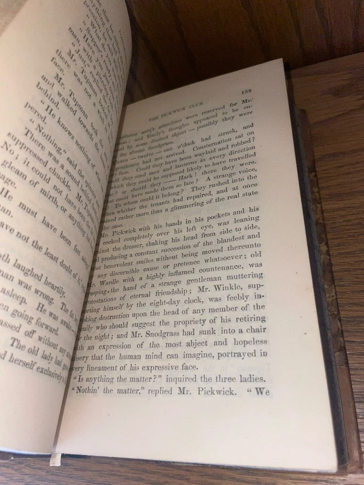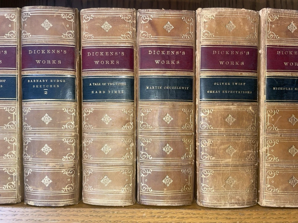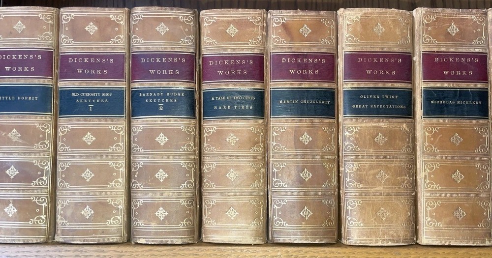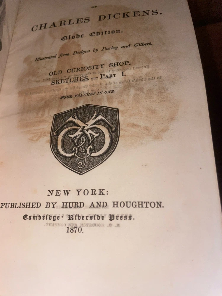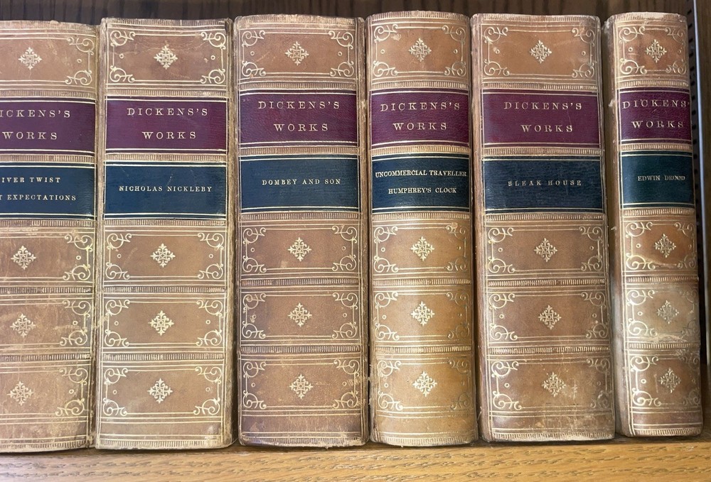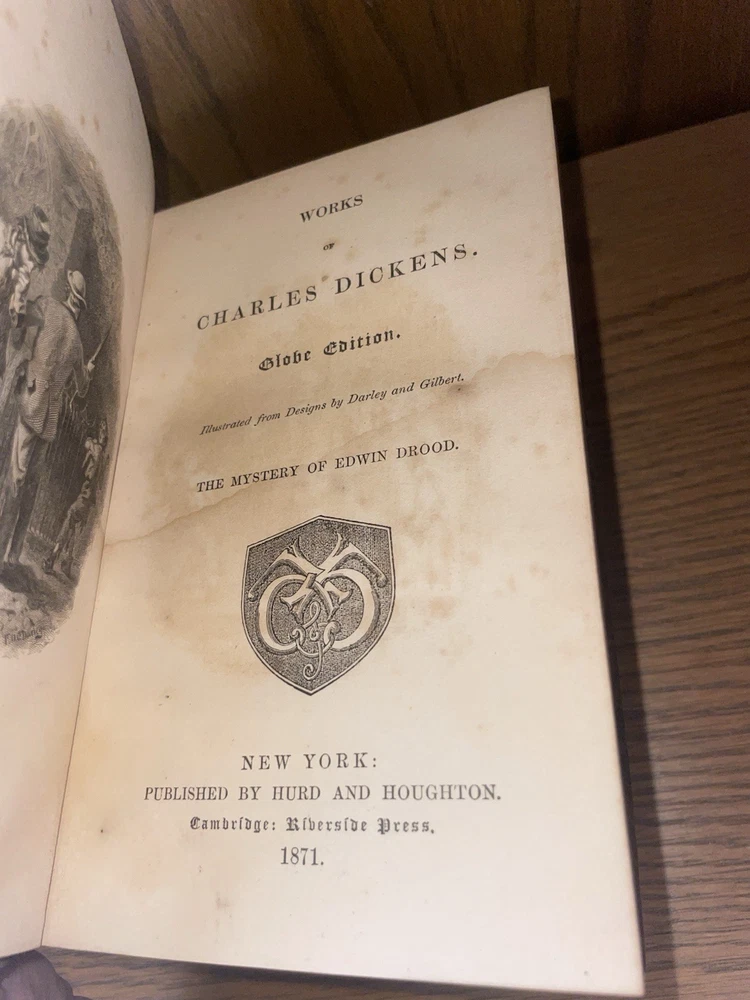 Complete Works of Charles Dickens. Complete in 14 Volumes. Printed in 1870 to 1872. The first collected edition was printed in 1870. This set is as early as possible, without being the first collected edition. The set is complete with all of the works of Charles Dickens. This set has all the titles that are found in every other set. This set is bound into 14 volumes. The Sketches volumes are subdivided into Part One and Part Two, and bound into the other books, thereby reducing the volume count from 15 volumes, to 14 volumes. Bound in the original leather bindings. The bindings are original. Quality rag paper. The paper is high quality and low acid content. The paper is not fragile or brittle as is common in later Victorian printings. Steel engraved frontisplates. Set is in very good condition overall. The leather is supple. The external hinges are all sound There is internal and separation along the paper on the inside of approximately five volumes, showing some separation from the text block. This may be bothersome. Some edge rubbing and other external wear. Set has some evidence of water exposure, and some tide marks mostly external. There is some external damage due to previous water exposure as shown in the pictures, this may be bothersome. Aside from these condition flaws this is an exceptional Victorian set of Dickens. Overall an exceptional antiquarian set of Dickens in leather. The main condition flaws are some internal separation of the bindings from the text block, and there’s some evidence of water exposure, which may be bothersome, otherwise this is an exceptional set of Dickens. The bindings are original. All external hinges are sound and the leather supple. There is internal hinge separation along the internal paper with the binding separating from the text block in some volumes. The external hinges themselves are sound. Quality paper can be read without damage. Globe Edition Printings range from 1870 - 1872 as it took 2 years to publish the set. Beautiful genuine leather and marble edge bindings on all volumes. Books have wear specifically on front and rear covers, however nothing unexpected for being over 150 years old. The spines however are in excellent condition with no sunfading. No loose or missing pages. These Globe Editions were published in various cost levels, with these leather editions being perhaps the most expensive bindings offered by the publisher. Full marbling on all edges, very nicely tooled leather with gold details, etc. These measure 7 inches tall. This set takes up approximately 28 inches of shelf space. This set is complete with all Charles Dickens works. Works include: Little Dorrit Christmas Stories Pictures from Italy American Notes A Tale of Two Cities Hard Times Old Curiosity Shop Sketches (1 and 2) (subdivided and bound into two other volumes) Bleak House Martin Chuzzlewit Nicholas Nickelby Our Mutual Friend Dombey and Son Barnaby Rudge Pickwick Papers Edwin Drood Uncommercial Traveler Humphrey's Clock Oliver Twist Great Expectations Quality paper. Paper is fresh. Leather supple. Very good overall, some internal separation and some water exposure to some volumes. Some generalized abrasion. All external hinges sound. Very good overall. Good only to some areas. Still an exceptional Victorian set of Charles Dickens in the original bindings. This will be well protected for shipping. Please see my other listings for similar books. 2025.05