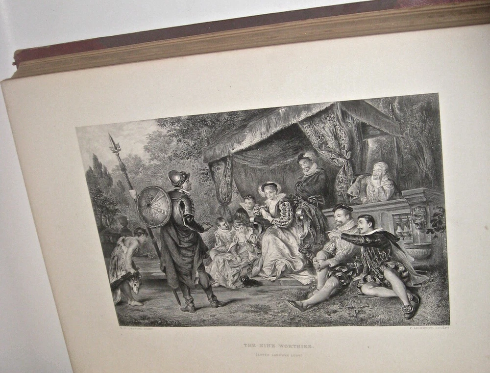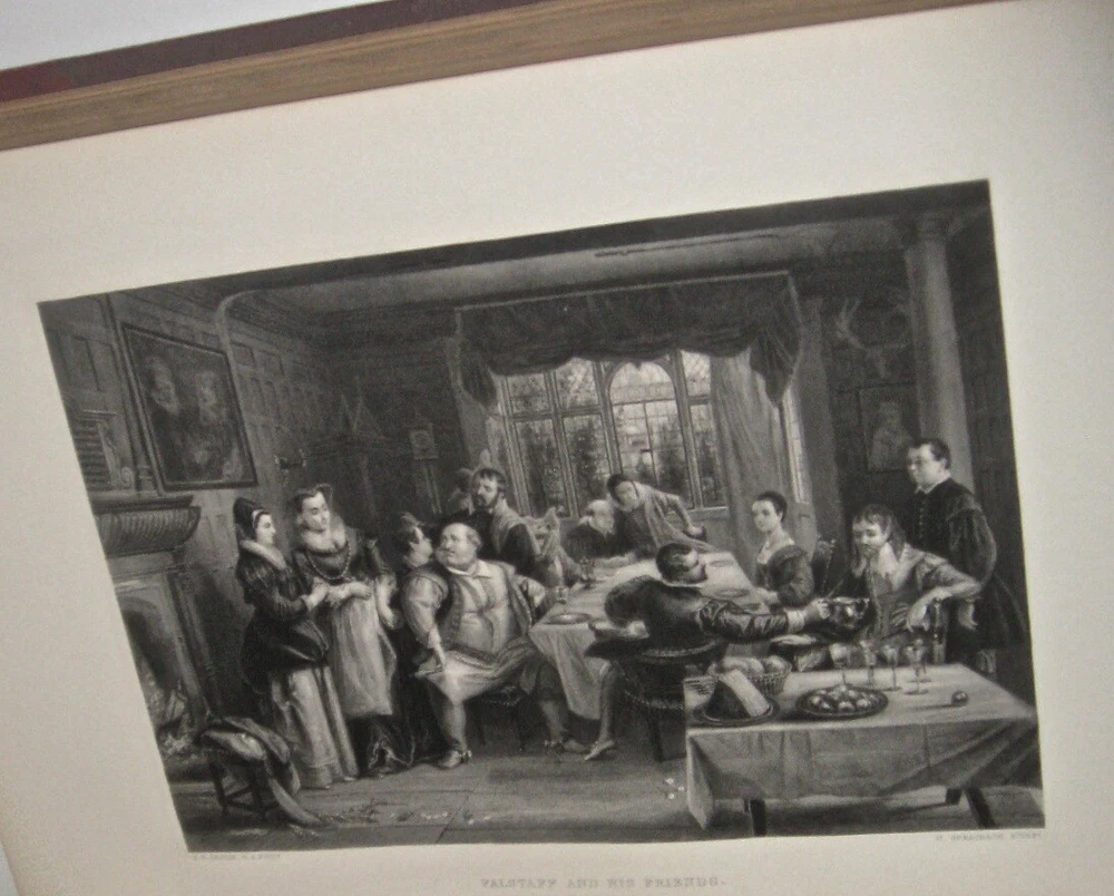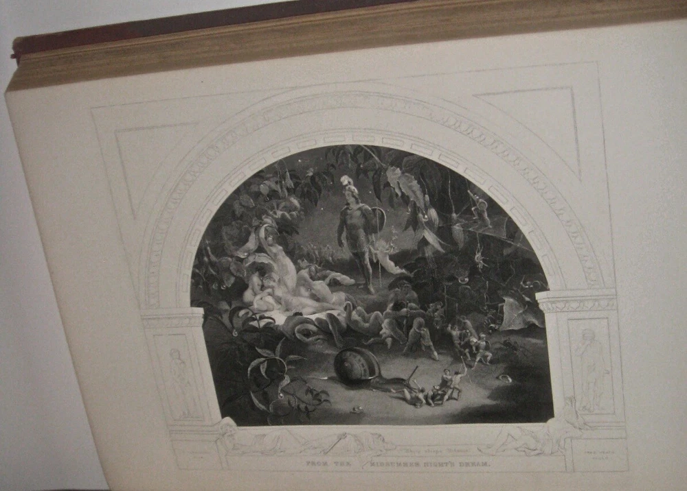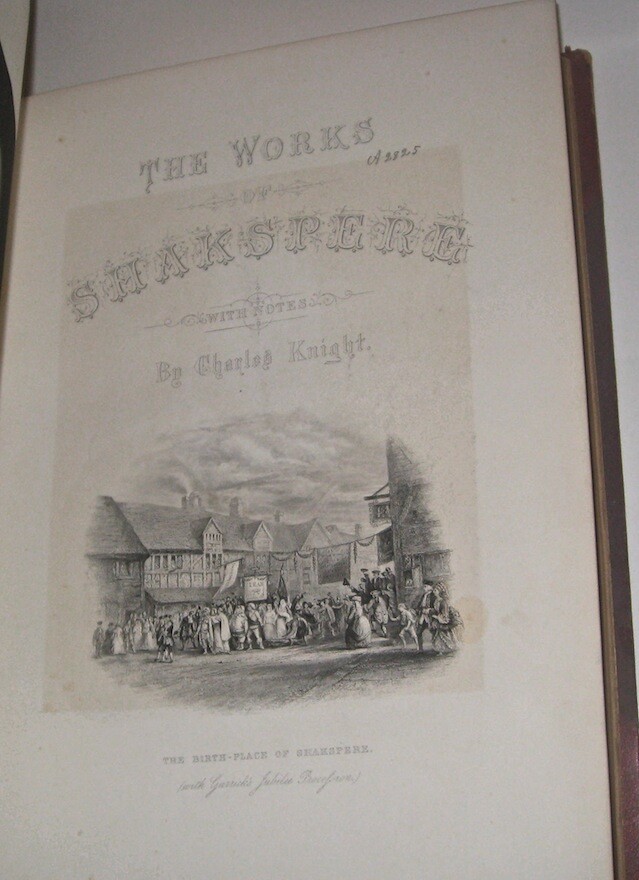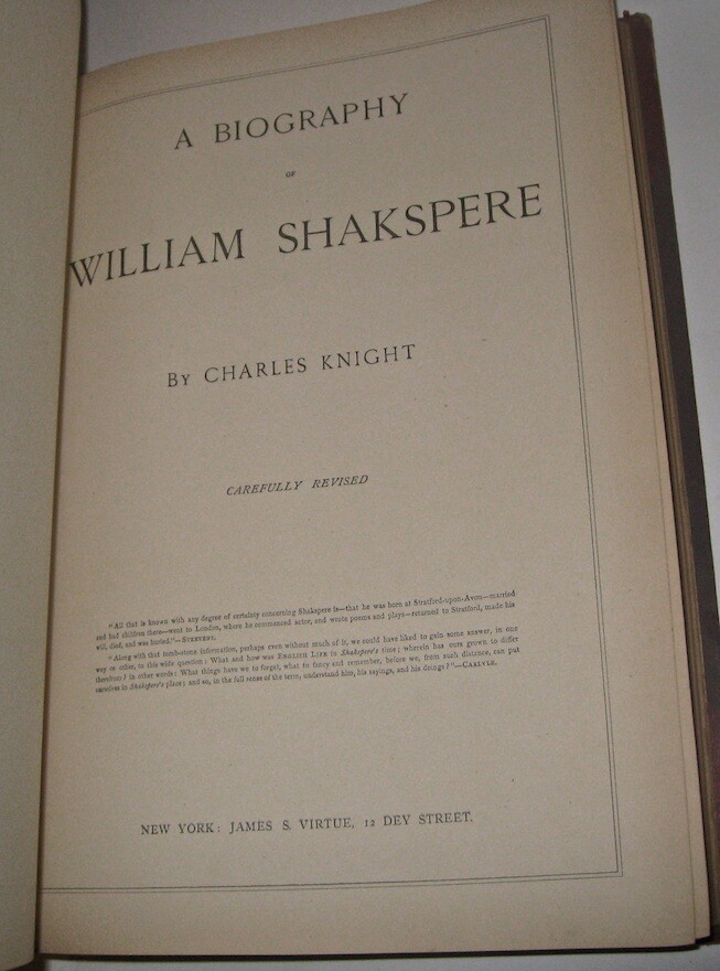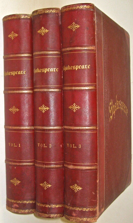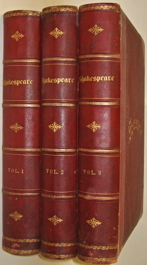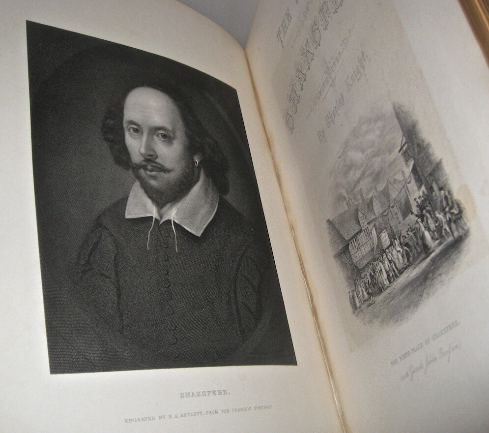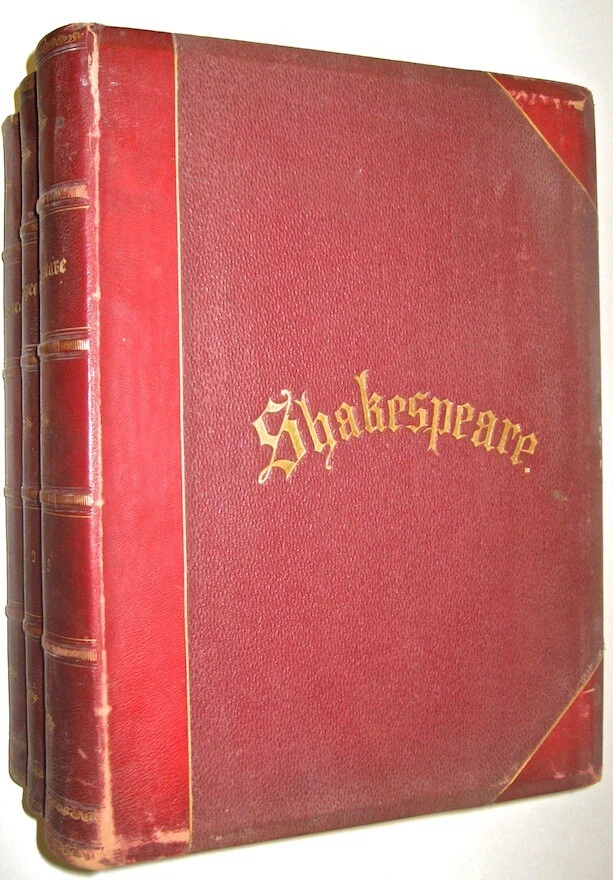 The Complete Works of WILLIAM SHAKESPEARE! The highly desirable IMPERIAL EDITION. Complete in 3 massive books. Printed circa 1860. MASSIVE FOLIO-SIZED BOOKS, measuring 15 inches tall. This is an incredibly heavy set. Complete in 3 volumes. Rare. This is the regal and massive IMPERIAL EDITION of Shakespeare's Works. The most magnificent and impressive edition of Shakespeare ever printed. Bound in the highest quality leather bindings. These are the original leather bindings. All edges are cased in gold. Thick heavy covers with BEVELED EDGES. Printed circa 1860. This set is well over 150 years old! No date printed on the title pages. 1860-1870 is the estimate attributed by booksellers. A massive set, complete in 3 volumes. The additional volume increases the value of the set. As the set is typically found bound in two. Ilustrated with 41 steel-engraved plates , including a frontispiece and additional engraved title page in each volume. “From 1837 Knight had been occupied with what he himself probably regarded as his magnum opus. From the time of his boyish experience he had wished to edit Shakespeare… [his edition of Shakespeare was] ‘the first in the country conceived in the right spirit,’ and no future editor can afford to neglect it” (DNB). Includes all of the comedies, tragedies, histories, poems and sonnets, thirteen other plays outside the canon ascribed to Shakespeare, Knight’s notes on each play, and indexes. Jaggard, 542. Edited by CHARLES KNIGHT. Massive FOLIO SIZED books, measuring just under 15 inches tall, by 12 inches wide. These books are incredibly heavy. These measure 14.75 inches tall, or just under 15 inches tall. These measure 12 inches across the covers. Requiring roughly 7.5 inches of shelf space. All edges are cased in gold. Thick heavy covers with Beveled Edges. Gilt 'Shakespeare' embossing to covers in Victorian gothic, blind embossed rear covers. Floral end papers. CONDITION: In exceptional condition. Internally very fresh, bright and clean. There is external abrasion. Hinges all strongly attached with starting. A ppears free of foxing after front pages. The end paper is thinner than the printed paper, with some wear around edges. Printed on extremely high quality thick stock paper. The Imperial Edition. The Imperial Edition is typically found in two volumes, so only the first two volumes have the title pages. Small extremity split top spine volume one. Some wear spine ends. Very clean internally. Dual ruled pages. Almost 12 inches deep. Approximately 15 inches tall! This set is unusually bound in 3 volumes, these are the original bindings, whereas the most common Imperial Edition is in 2, which is why only the first two books with title pages . end papers with some wear. An early bookbinder stamp, indicating that this set was custom bound. These custom bindings are original. A massive set, complete in 3 volumes. The additional volume increases the value of the set. This set is well over 150 YEARS OLD! Bound in the highest quality leather bindings. These are very large, FOLIO-SIZED books!! These measure just under 15 inches tall!! These are very large books. These are the original leather bindings. Thick covers, with elaborate embossing, and ornate tooling. Thick covers with beveled edges. Blind embossing surrounding a gilded wreath motif. Gilded spines with thick raised hubs. Two leather labels. Trimmed edges and turn ins. Floral end papers. 7.5 inches of shelf space. Heavily Illustrated, with steel engravings. Printed on quality paper. Dual ruled, decorative framing, surrounding the text on each page. Columned text, with wide margins. These are a true pleasure to read. Bound in the original gilded leather bindings which display beautifully. The Complete Works of WILLIAM SHAKESPEARE. Item # 2077 William Shakespeare From Wikipedia, the free encyclopedia This article is about the poet and playwright. For other persons of the same name, see William Shakespeare (disambiguation) . For other uses of "Shakespeare", see Shakespeare (disambiguation) . William Shakespeare The Chandos portrait (artist and authenticity unconfirmed), courtesy of the National Portrait Gallery, London Born Stratford-upon-Avon , Warwickshire , England Baptised 26 April 1564 Died 23 April 1616 (aged 52) Stratford-upon-Avon , Warwickshire , England Resting place Church of the Holy Trinity, Stratford-upon-Avon Occupation Playwright Poet Actor Era Elizabethan era Movement English Renaissance Spouse(s) Anne Hathaway ( m. 1582; his death 1616) Children Susanna Hall Hamnet Shakespeare Judith Quiney Signature William Shakespeare ( / ˈ ʃ eɪ k s p ɪər / ; [1] 26 April 1564 ( baptised ) – 23 April 1616) [nb 1] was an English poet , playwright and actor, widely regarded as the greatest writer in the English language and the world's pre-eminent dramatist. [2] He is often called England's national poet and the "Bard of Avon". [3] [nb 2] His extant works, including collaborations , consist of approximately 38 plays , [nb 3] 154 sonnets , two long narrative poems and a few other verses, some of uncertain authorship. His plays have been translated into every major living language and are performed more often than those of any other playwright. [4] Shakespeare was born and brought up in Stratford-upon-Avon , Warwickshire . At the age of 18, he married Anne Hathaway , with whom he had three children: Susanna and twins Hamnet and Judith . Sometime between 1585 and 1592, he began a successful career in London as an actor, writer, and part-owner of a playing company called the Lord Chamberlain's Men , later known as the King's Men . At age 49 around 1613, he appears to have retired to Stratford, where he died three years later. Few records of Shakespeare's private life survive, which has stimulated considerable speculation about such matters as his physical appearance , sexuality , religious beliefs and whether the works attributed to him were written by others . [5] Shakespeare produced most of his
