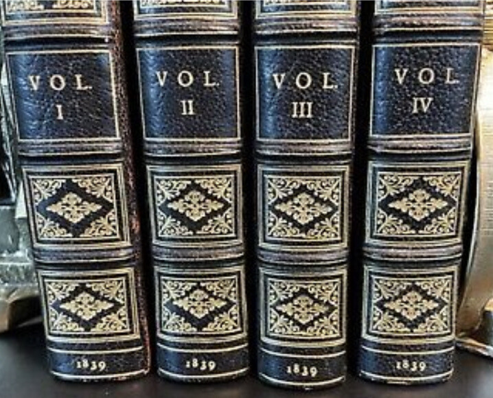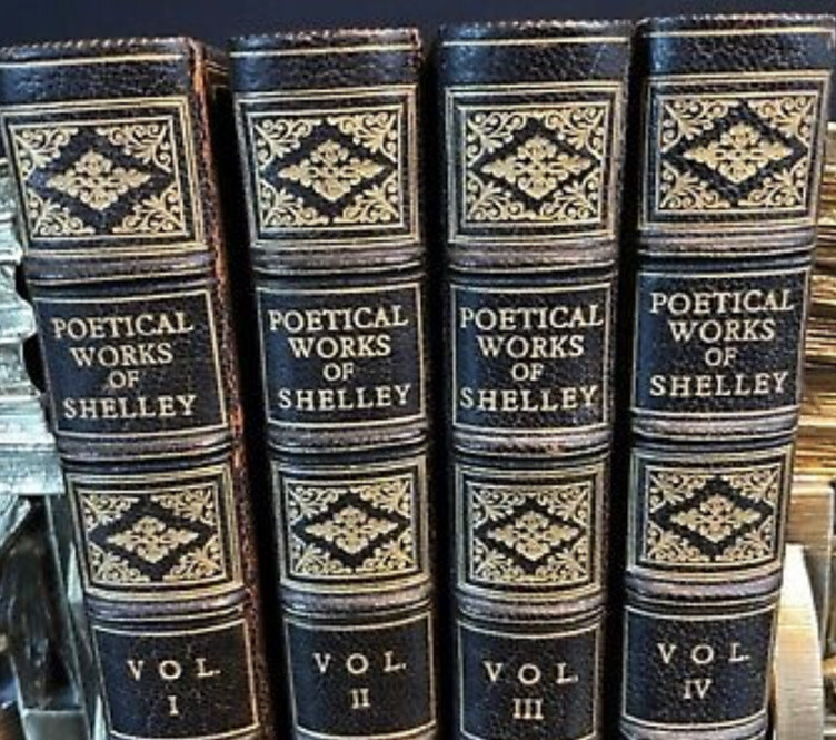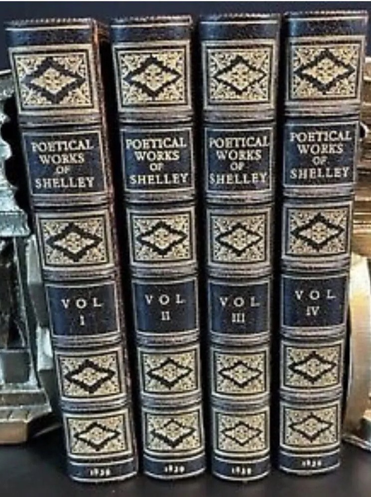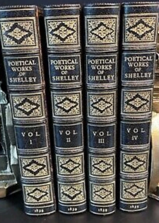 The Complete Works Of PERCY SHELLEY! Rare FIRST COLLECTED EDITION of Shelley's Works. Complete in 4 volumes. Printed in 1839. ——— Shelley is one of the major English Romantic poets, and is regarded as among the finest poets in the English language. He was a key member of a close circle of visionary poets and writers that included: Lord Byron, John Keats, and his own second wife, Mary Shelley, the author of Frankenstein. This is the Rare and Highly Desirable First Edition of Shelley's works. Edited and assembled by his widow Mary Wollstonecraft Shelley, the famous author of Frankenstein. (Frankenstein is not in this set.) Printed in 1839, by Edward Moxon & Co., London. This set is 180 years old! THIS RARE SET WAS CUSTOM BOUND in full leather in the 1800's. These bindings are of the highest quality gilded leather. Each book will be individually wrapped and well protected for shipping. Raised hubs, on the gilded spines. Marbled edges and end papers. Frontis in volume one. Half-titles are all present. Printed on quality paper. These measure 6.5 inches tall. This is the important first edition of Shelley's works, edited and assembled by his widow Mary Wollstonecraft Shelley. This is the first appearance of Mary Shelley's valuable Notes to Shelley's Poems, written in lieu of a memoir in order to fulfill a promise to her late husband's father. Despite her promise, the Notes cleverly combined exegesis with biography, helping to promote the cult of Shelley. Printed in London by Edward Moxon, Dover Street. This is an exceptional set. In Exceptional Condition despite being 180+ years old. In near mint condition. The leather is exceptionally fresh and supple. Printed on quality paper that is very fresh, bright, and clean. This set displays beautifully. Rare FIRST EDITION of Shelley's Works. Complete in 4 volumes. Printed in 1839. THIS RARE SET WAS CUSTOM BOUND. A gorgeous set. Bindings have some scuffing. All hinges are attached. An exceptional set. This set displays beautifully, and is very worthy of gifting. This would make an excellent gift and/or addition to any fine library. Rare and desirable FIRST EDITION of his collected works. Printed in 1839!This set is 180 years old. This set is approaching 200 years old. This is the Rare FIRST COLLECTED EDITION of Shelley's Works. THE POETICAL WORKS OF PERCY BYSSHE SHELLEY Edited by Mrs. Shelley. London:Edward Moxin,1839. First collected edition. Four volumes complete, sm8vo (about 6.5"x5"), bound in full gilt ruled and gilt decorated leather, all edges gilt. marbled endpapers. The first complete edition of Percy Shelley's poetical works, complied and edited by his wife Mary Shelley and bringing Percy's work into the mainstream. Her notes added significantly to the fuller comprehension of Percy's poetic writings. CONDITION: A very good+ set with minor wear. There are no marks or names. The bindings hinges are square and solid. Rare complete set with a handsome shelf appearance. H 2022.06 Percy Bysshe Shelley From Wikipedia, the free encyclopedia Jump to navigationJump to search "Percy Shelley" redirects here. For the son of the poet, see Percy Florence Shelley. For the English potter, see Percy Shelley (potter). Percy Bysshe Shelley Portrait of Shelley, by Alfred Clint (1829) Portrait of Shelley, by Alfred Clint (1829) Born 4 August 1792 Horsham, Sussex, England Died 8 July 1822 (aged 29) Gulf of La Spezia, Sardinia(now Italy) Occupation Poetdramatistessayistnovelist Nationality English Education University of Oxford Literary movement Romanticism Spouse Harriet Westbrook (m. 1811; died 1816) Mary Shelley (m. 1816) Signature Percy Bysshe Shelley (/bɪʃ/ (About this soundlisten) BISH;[1][2] 4 August 1792 – 8 July 1822) was one of the major English Romantic poets, who is regarded by some as among the finest lyric and philosophical poets in the English language, and one of the most influential. A radical in his poetry as well as in his political and social views, Shelley did not see fame during his lifetime, but recognition of his achievements in poetry grew steadily following his death. Shelley was a key member of a close circle of visionary poets and writers that included Lord Byron, John Keats, Leigh Hunt, Thomas Love Peacock, and his own second wife, Mary Shelley, the author of Frankenstein. Shelley is perhaps best known for classic poems such as "Ozymandias", "Ode to the West Wind", "To a Skylark", "Music, When Soft Voices Die", "The Cloud", and "The Masque of Anarchy". His other major works include a groundbreaking verse drama The Cenci (1819) and long, visionary, philosophical poems such as Queen Mab (later reworked as The Daemon of the World), Alastor, The Revolt of Islam, Adonaïs, Prometheus Unbound (1820)—widely considered to be his masterpiece—Hellas: A Lyrical Drama (1821), and his final, unfinished work, The Triumph of Life(1822). Shelley's close circle of friends included some of the most important progressive thinkers of the day, including his father-in-law, the philosopher William Godwin, and Leigh Hunt. Though Shelley's poetry and prose output remained steady throughout his life, most publishers and journals declined to publish his work for fear of being arrested for either blasphemy or sedition. Shelley's poetry sometimes had only an underground readership during his day, but his poetic achievements are widely recognized today, and his political and social thought had an impact on the Chartistand other movements in England, and reach down to the present day. Shelley's theories of economics and morality, for example, had a profound influence on Karl Marx; his early—perhaps first—writings on nonviolent resistance influenced Leo Tolstoy, whose writings on the subject in turn influenced Mahatma Gandhi, and through him Martin Luther King Jr. and others practicing nonviolence during the American civil rights movement. Shelley became a lodestar to the subsequent three or four generations of poets, including important Victorian an