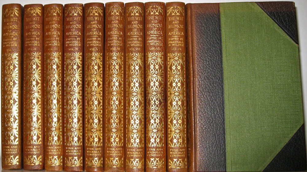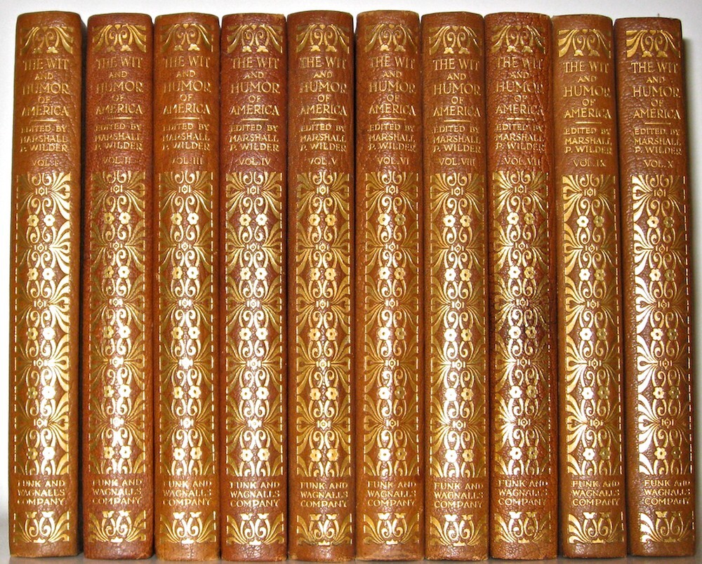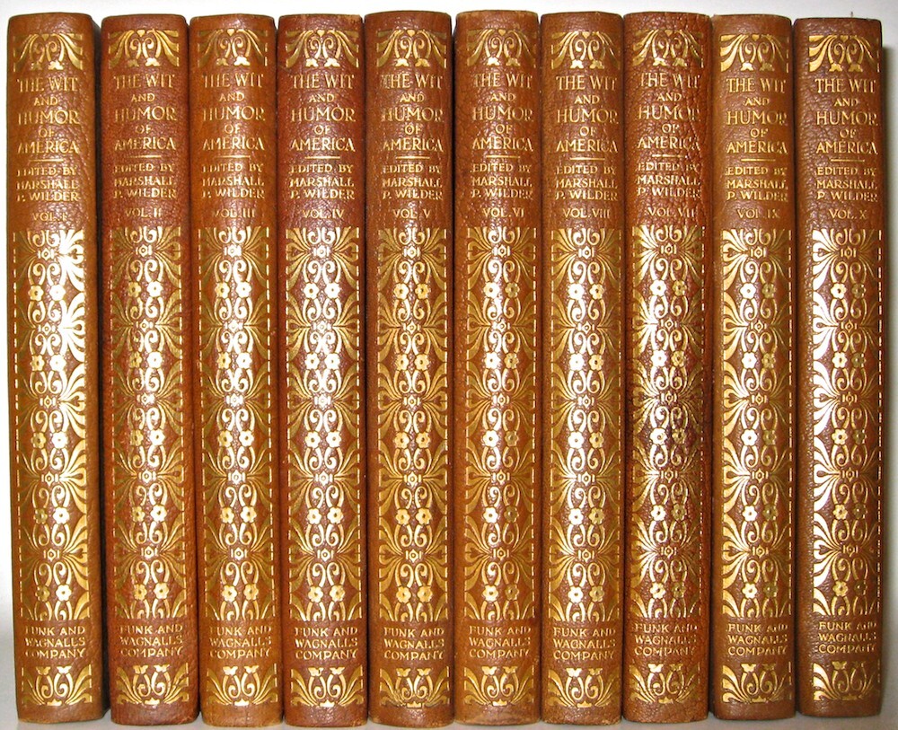THE WIT AND HUMOR OF AMERICA! Complete in 10 volumes. Printed in 1911. THIS IS A GORGEOUS SET! Bound in leather. IN MINT CONDITION, despite being over 100 years old! A collection of the greatest American works. Printed in 1911. This set is well over 100 years old. THE WIT AND HUMOR OF AMERICA. Bound in leather bindings. These are the original bindings. Intricately gilded spine. Illustrated with frontisplates. Top edges are gilded. These book measure 8 inches tall. A collection of the greatest American works. Edited by Marshall P. Wilder (1859-1914). "Happiness and laughter are two of the most beautiful things in the world, for they are of the few that are purely unselfish. Laughter is not for yourself, but for others. When people are happy they present a cheerful spirit, which finds its reflection in every one they meet, for happiness is as contagious as a yawn. Of all the emotions, laughter is the most versatile, for it plays equally well the role of either parent or child to happiness." A collection of the greatest American literature including the likes of: Mark Twain, Washington Irving, Nathaniel Hawthorne, Oliver Wendell Holmes, James Whitcomb Riley, et al... Wilder, Marshall P. Complete in 10 volumes, as stated on the title page. Funk & Wagnalls Company, New York and London. Printed in 1911. This set is well over 100 years old. THE WIT AND HUMOR OF AMERICA. Bound in quality, gilded, moroccan, leather. Ornate gilded spine. Top edge gilded. Complete in 10 volumes, as stated on title page. Funk & Wagnalls Company, New York and London. 1911. FINE/MINT condition. Appears NEW & UNREAD. Hinges fully attached and sound, as new and exceptionally fresh. Some slight rubbing, minor rubs. Clean interiors. Free of foxing. No writing or signs of previous ownership. Very clean internally, no foxing. CONDITION: In VERY GOOD condition overall, and very well preserved for being over 100 years old. No writing or signs of previous ownership. A gorgeous set worthy of any fine library. A collection of the greatest American literature including the likes of: Mark Twain, Washington Irving, Nathaniel Hawthorne, Oliver Wendell Holmes, James Whitcomb Riley, and many others. 3624 American literature From Wikipedia, the free encyclopedia Jump to navigation Jump to search For other uses, see American literature (disambiguation) . This article is part of a series on the Culture of the United States of America Society History Language People Race and ethnicity Religion Arts and literature Architecture Art Dance Fashion Literature Comics Poetry Music Sculpture Theater Other Cuisine Festivals Folklore Media Newspapers Radio Cinema TV Internet Pornography Mythology Sport Symbols Flag Great Seal Monuments Motto Anthem Bird World Heritage Sites United States portal v t e American literature is literature written or produced in the United States of America and its preceding colonies (for specific discussions of poetry and theater, see Poetry of the United States and Theater in the United States ). Before the founding of the United States , the British colonies on the eastern coast of the present-day United States were heavily influenced by English literature. The American literary tradition thus began as part of the broader tradition of English literature . The revolutionary period is notable for the political writings of Benjamin Franklin , Alexander Hamilton , and Thomas Paine . Thomas Jefferson 's United States Declaration of Independence solidified his status as a key American writer. It was in the late 18th and early 19th centuries that the nation's first novels were published. An early example is William Hill Brown 's The Power of Sympathy published in 1791. Brown's novel depicts a tragic love story between siblings who fall in love without knowing they are related. With an increasing desire to produce uniquely American literature and culture, a number of key new literary figures emerged, perhaps most prominently Washington Irving and Edgar Allan Poe . In 1836, Ralph Waldo Emerson started an influential movement known as Transcendentalism . Inspired by that movement, Henry David Thoreau wrote Walden , which celebrates individualism and nature and urges resistance to the dictates of organized society. The political conflict surrounding abolitionism inspired the writings of William Lloyd Garrison and Harriet Beecher Stowe in her famous novel Uncle Tom's Cabin . These efforts were supported by the continuation of the slave narratives such as Frederick Douglass 's Narrative of the Life of Frederick Douglass, an American Slave . In the mid-nineteenth century, Nathaniel Hawthorne published his magnum opus The Scarlet Letter , a novel about adultery. Hawthorne influenced Herman Melville , who is notable for the books Moby-Dick and Billy Budd . America's greatest poets of the nineteenth century were Walt Whitman and Emily Dickinson . Mark Twain (the pen name used by Samuel Langhorne Clemens ) was the first major American writer to be born away from the East Coast. Henry James put American literature on the international map with novels like The Portrait of a Lady . At the turn of the twentieth century a strong naturalist movement emerged that comprised writers such as Edith Wharton , Stephen Crane , Theodore Dreiser , and Jack London . American writers expressed disillusionment following World War I . The short stories and novels of F. Scott Fitzgerald captured the mood of the 1920s, and John Dos Passos wrote too about the war. Ernest Hemingway became famous with The Sun Also Rises and A Farewell to Arms ; in 1954, he won the Nobel Prize in Literature . William Faulkner became one of the greatest American writers with novels like The Sound and the Fury . American poetry reached a peak after World War I with such writers as Wallace Stevens , T. S. Eliot , Robert Frost , Ezra Pound , and E. E. Cummings . American drama attained international status at the time with the works of Eugene O'Neill , who won four Pulitzer Prizes 