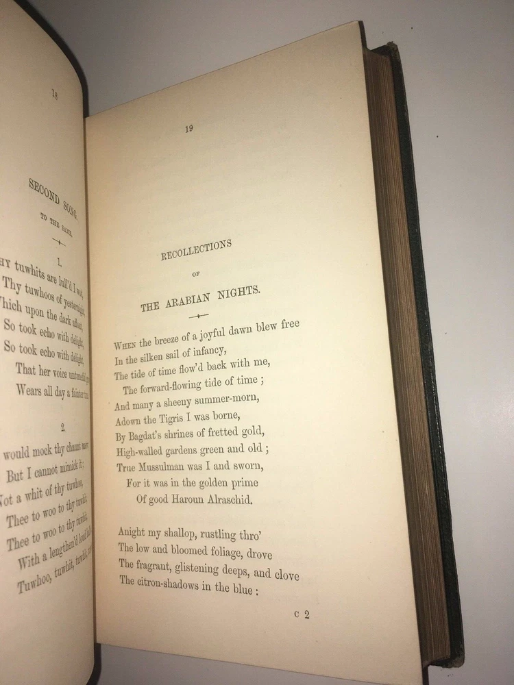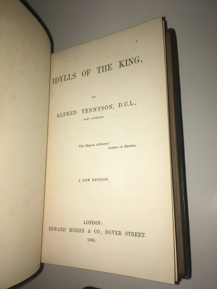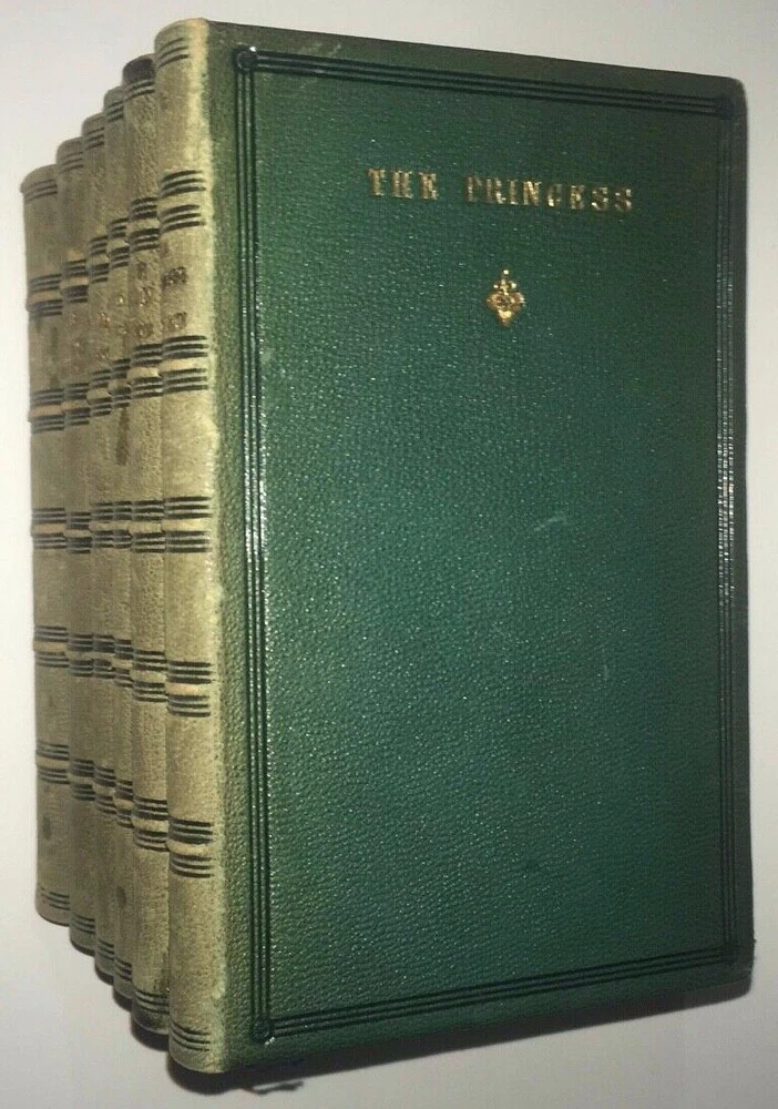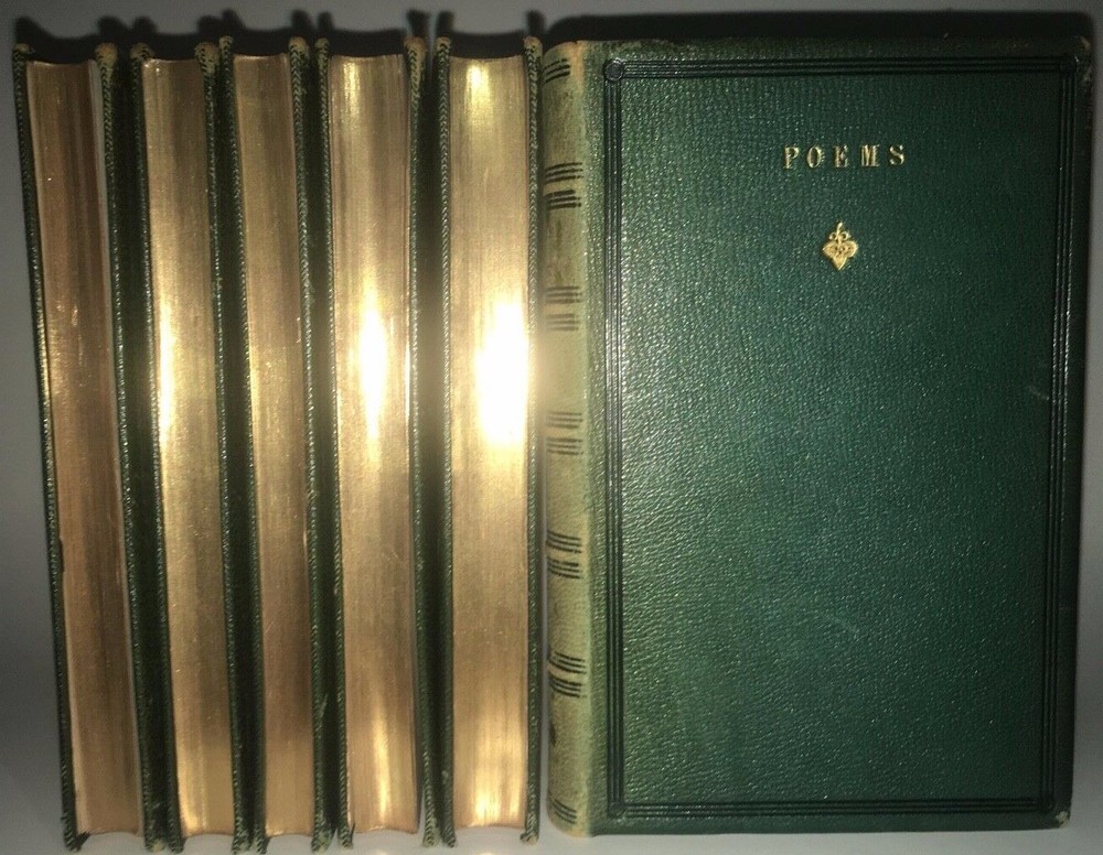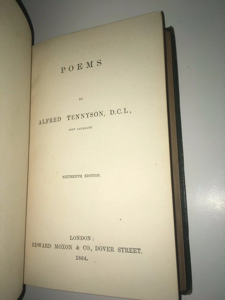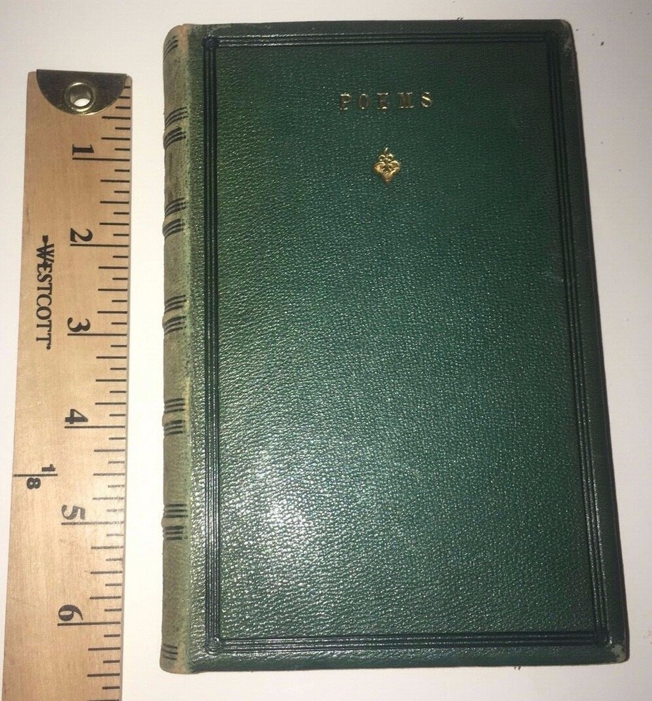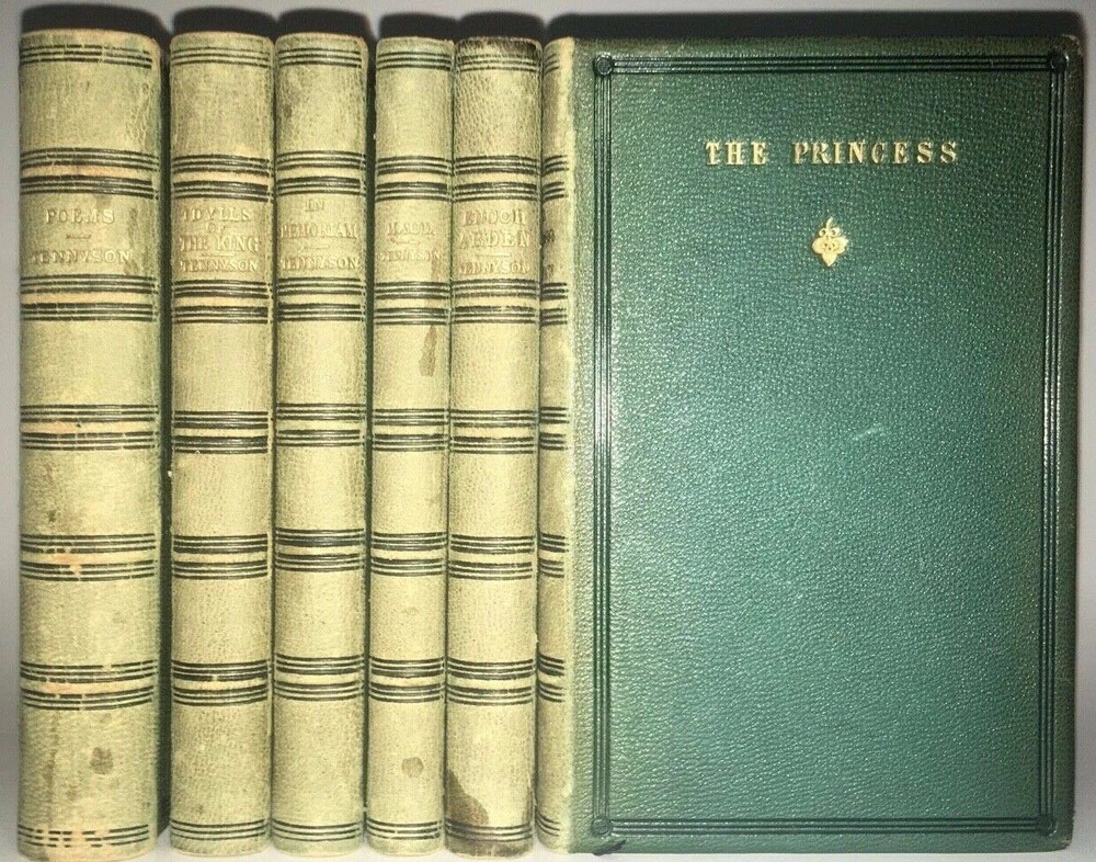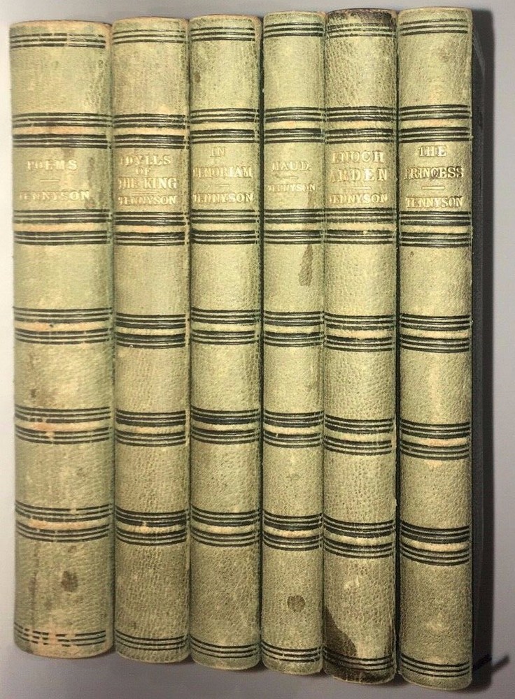 THE COMPLETE WORKS OF ALFRED LORD TENNYSON! Complete in 6 volumes. Printed in 1864-1865. This set is over 150 Years Old! Still bound in the original bindings. This set was printed during Tennyson's lifetime. STILL BOUND IN THE ORIGINAL FULL LEATHER BINDINGS FROM 1865. Full leather binding where more expensive to produce.These are the original bindings. Tennyson was the Poet Laureate of Great Britain and Ireland during much of Queen Victoria's reign, and still remains to this day one of the most popular British poets. "More than any other Victorian writer, Tennyson has seemed the embodiment of his age, both to his contemporaries and to modern readers. In his own day he was said to be—with Queen Victoria and Gladstone—one of the three most famous living persons, a reputation no other poet writing in English has ever had. As official poetic spokesman for the reign of Victoria, he felt called upon to celebrate a quickly changing industrial and mercantile world with which he felt little in common, for his deepest sympathies were called forth by an unaltered rural England; the conflict between what he thought of as his duty to society and his allegiance to the eternal beauty of nature seems peculiarly Victorian." This set predates the First Collected Edition of 1869. The title page states this to be the 'Seventeenth Edition'. The Complete Works of Alfred Tennyson. An Exceptionally Early Edition, printed during his lifetime. Still bound in the original full red leather binding. Full leather bindings were more expensive to produce.Raised hubs on spine. All edges cased in gilt.Printed on quality paper. 6 5/8 inches tall. Complete six volume set. Edward Moxon & Co., London. (The esteemed publisher of the First Collected Edition of Shelley's Works, and numerous other Victorian writers.)Printed in 1864-1865. These are the original bindings, over 150 years old. CONDITION: In VERY GOOD condition overall with some general shelf wear and abrasion. Hinges are fully attached and sound, some abrasion and staining to the spine, as is visible in the pictures. Some general rubbing. Interior shows light foxing. Clean pages, printed on high quality paper, these area pleasure to read. A gorgeous set, printed during Tennyson's lifetime. Titles include: Maud Idylls of the King The Princess In Memoriam Enoch Arden Poems Complete in 6 volumes. Hard to obtain in such nice, full leather bindings.These are the original bindings, over 150 years old. The first collected edition to contain all of Tennyson's major works was in 1869, the Idylls volume was expanded in 1869 to include The Holy Grail and Other Poems.Tennyson was still alive and continued to publish shorter poems. This is set precedes the First Collected Edition of all of his major works, and was printed during his lifetime. Tennyson was the Poet Laureate of Great Britain and Ireland during much of Queen Victoria's reign, and still remains to this day one of the most popular British poets. "More than any other Victorian writer, Tennyson has seemed the embodiment of his age, both to his contemporaries and to modern readers. In his own day he was said to be—with Queen Victoria and Gladstone—one of the three most famous living persons, a reputation no other poet writing in English has ever had. As official poetic spokesman for the reign of Victoria, he felt called upon to celebrate a quickly changing industrial and mercantile world with which he felt little in common, for his deepest sympathies were called forth by an unaltered rural England; the conflict between what he thought of as his duty to society and his allegiance to the eternal beauty of nature seems peculiarly Victorian." The Complete Works of Alfred Tennyson. Bound in the original full red leather bindings from 1865. Printed during the American Civil War. Complete in 6 volumes, with all of his works, especially Idylls of the King,Maud, and a fat Poems volume.Titles are: Enoch Arden Idylls of the King Maud In Memoriam The Princess Poems An endearing set.Bound in full leather.With intricately gilded covers.Small in size, intended to be carried around.Nonetheless, this set is in exceptional condition. A gorgeous set. Bound in exceedingly high quality leather bindings. item#5052i—>h