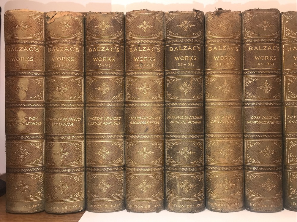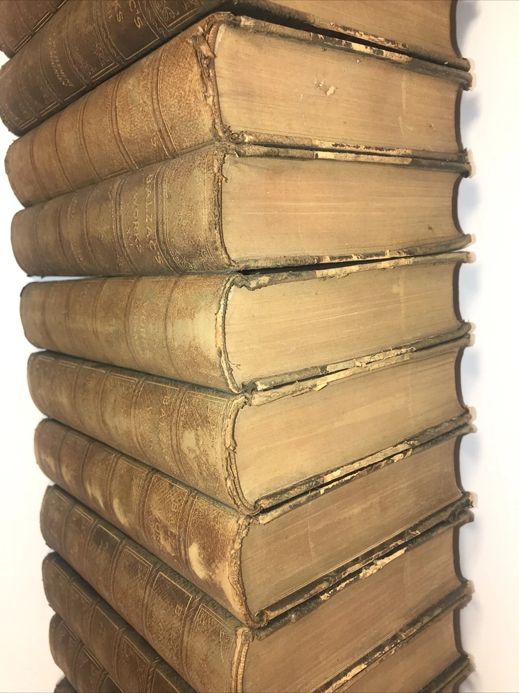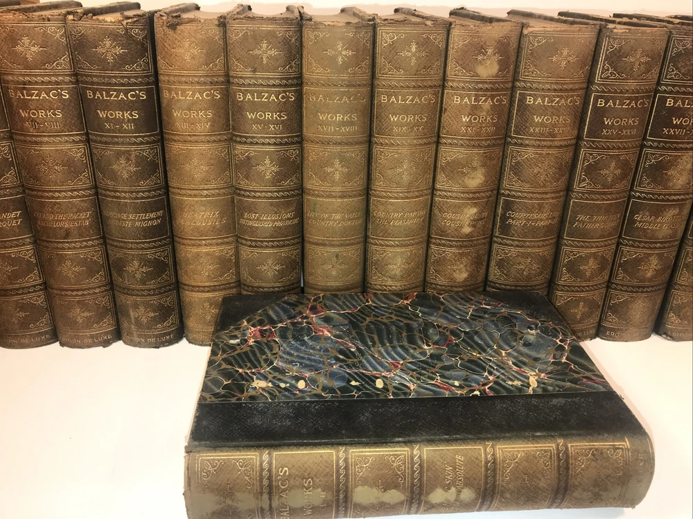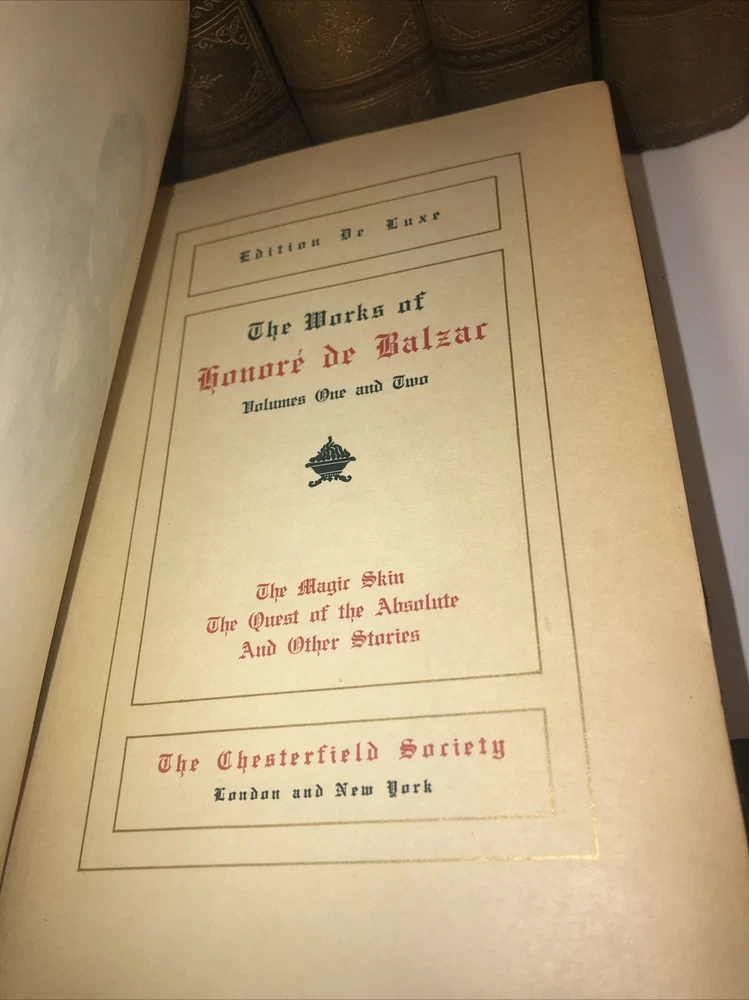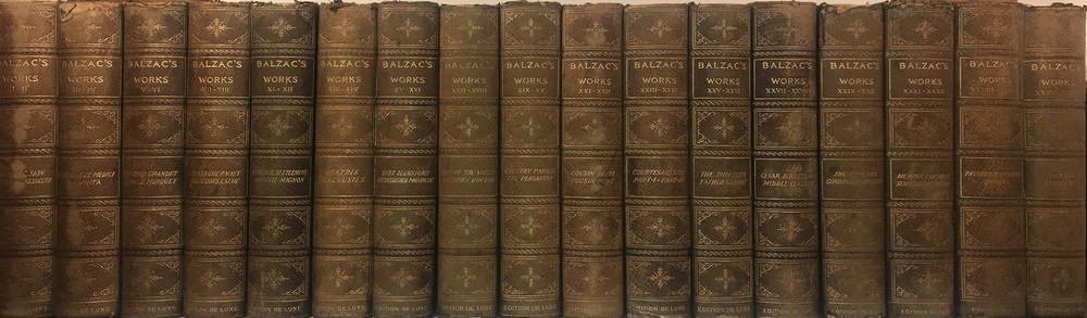 THE COMPLETE WORKS OF HONORE DE BALZAC!PRINTED IN ENGLISH . Usually complete in 18 volumes, set is missing one volu me. 17 volumes out of 18. Edition De Luxe.Limited to 1/750 sets ever made. ILLUSTRATED with Full Page plates. The Complete Works of HONORE DE BALZAC. Complete in 36 volumes, bound into 18 books, which is standard for Balzac's Complete Works.There are only 17 out of 18 books to this set, and this set is n ot complete. Bound in ornately gilded leather bindings! Marbled boards and end-papers. Top edges are gilded! Ornate gilded spine! Wide margins. Printed in English. These measure 8 1/8 inches tall. This is an extremely heavy set; hence the cost of postage. Edition De Luxe limited to just 750 sets ever produced! ILLUSTRATED with Full Page plates! Chesterfield Society, NY; There is no printed date, printed circa 1895. VERY GOOD Condition overall with shelf wear as visible in the pictures. . Hinges are strongly attached and sound, some rubbing/abrasion. Some general external rubbing/wear, as shown; signs of usage. Please look at the pictures, there is external wear, a few small chips, as shown. Very Good, near mint interior. Bright, clean, crisp. About free of foxing. Quality rag style paper. Some light general signs of usage. Very tightly bound. No writing or signs of previous ownership aside from previous owners stamp on pastedown. This is an extremely nice rustic set A beautiful collection of Honore de Balzac's complete works. Printed in English Titles: Lily of the Valley Country Doctor Daughter of Eve // A Woman of Thirty The Thirteen Father Goriot Sign of the Cat and Racket // Honorine Cesar Birotteau // Middle Classes Scenes from A Courtesan's Life Catherine De Medici // Gambara // Seraphita Member For Arcis // The Steamy Side of History Beatrix // Jealousies of A Country Town Country Parson // The Peasantry Eugenie Grandet // Ursule Mirouet The Chouans // A Passion in the Desert Cousine Betty // Cousin Pons The Phsyiology of Marriage // Comedie Humaine A Marriage Settlement // Modest Mignon The Magic Skin // The Quest of the Absolute Dramas // Vautrin Lost Illusions // A Distinguished Provincial at Paris COMPLETE in 18-volumes. This would make an excellent gift and/or addition to any fine library. In addition to their shelf presence, Rare & Antiquarian Books make a great investment. I always pack very securely to ensure safe arrival at your doorstep. All books are individually wrapped and professionally padded. _______________________~~~~~~~~~~~~~~~~~~~~~ This would make an excellent gift and/or addition to any library. Antiquarian books make a great investment, are only going up in value, and are sure to increase the aura of any room or office! I will pack very securely to ensure safe arrival at your doorstep. All books are individually wrapped and professionally padded. We double wrap and will leave plenty of space between this purchase and the walls of the box. We fill this space with plenty of padding.Customer Service is important to me. A full refund is offered, if the item is not as described. My goal is complete customer satisfaction. Please contact me with any questions. This set should ship out within 48 hours, and each volume will be individually wrapped and protected for shipping. #1868ap Honoré de BalzacFrom Wikipedia, the free encyclopedia"Balzac" redirects here. For other uses, see Balzac (disambiguation).Honoré de BalzacBornHonoré Balzac[1] 20 May 1799 Tours, Indre-et-Loire, FranceDied18 August 1850 (aged 51) Paris, FranceResting placePère Lachaise Cemetery, ParisOccupationWriter, critic, journalist, printerNationalityFrenchAlma materUniversity of ParisGenreNovel, dramaturgy, essayLiterary movementRealismNotable works • La Comédie humaineEugénie GrandetLa Peau de chagrinLe Père GoriotColonel ChabertLa RabouilleuseLe Lys dans la valléeIllusions perduesSplendeurs et misères des courtisanes Notable awards – Légion d'honneurYears active1829–1850SpouseEwelina Hańska (m. 1850) ( née Contessa Rzewuska)Signature Honoré de Balzac (/ˈbɔːlzæk, ˈbæl-/;[2] French: [ɔ.nɔ.ʁe d(ə) bal.zak], born Honoré Balzac ,[1] 20 May 1799 – 18 August 1850) was a French novelist and playwright. The novel sequence La Comédie Humaine , which presents a panorama of post-Napoleonic French life, is generally viewed as his magnum opus . Owing to his keen observation of detail and unfiltered representation of society, Balzac is regarded as one of the founders of realism in European literature.[3] He is renowned for his multi-faceted characters; even his lesser characters are complex, morally ambiguous and fully human. Inanimate objects are imbued with character as well; the city of Paris, a backdrop for much of his writing, takes on many human qualities. His writing influenced many famous writers, including the novelists Émile Zola, Charles Dickens, Gustave Flaubert, Jack Kerouac and Henry James, as well as important philosophers such as Friedrich Engels. Many of Balzac's works have been made into films, and they continue to inspire other writers. An enthusiastic reader and independent thinker as a child, Balzac had trouble adapting to the teaching style of his grammar school. His willful nature caused trouble throughout his life and frustrated his ambitions to succeed in the world of business. When he finished school, Balzac was apprenticed in a law office, but he turned his back on the study of law after wearying of its inhumanity and banal routine. Before and during his career as a writer, he attempted to be a publisher, printer, businessman, critic, and politician; he failed in all of these efforts. La Comédie Humaine reflects his real-life difficulties, and includes scenes from his own experience. Balzac suffered from health problems throughout his life, possibly due to his intense writing schedule. His relationship with his family was often strained by financial and personal drama, and he lost more than one friend over critical reviews. In 1850, Balzac