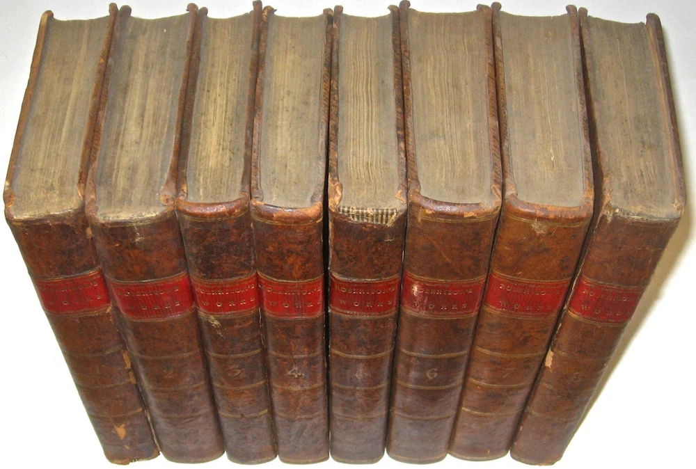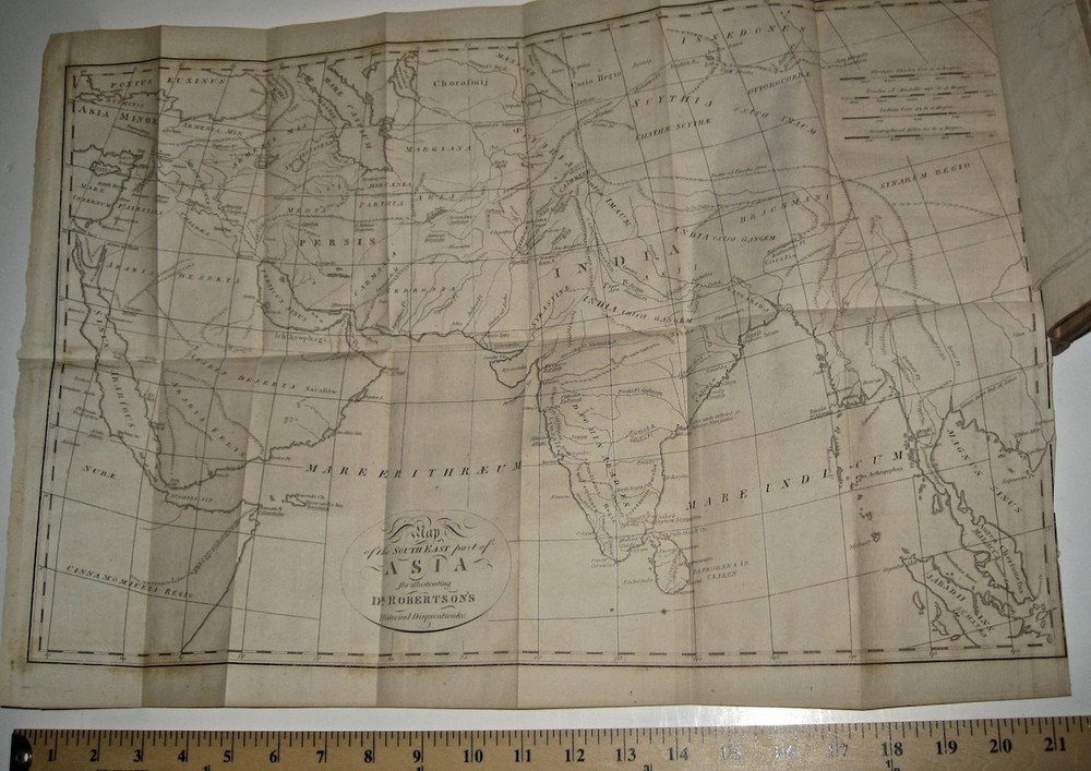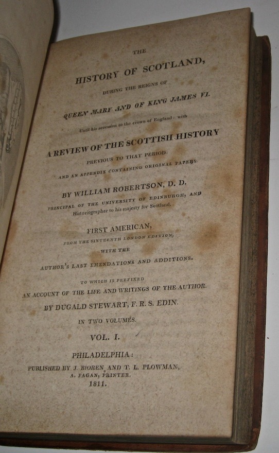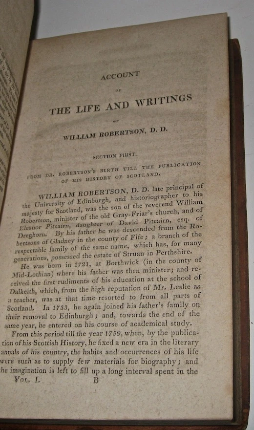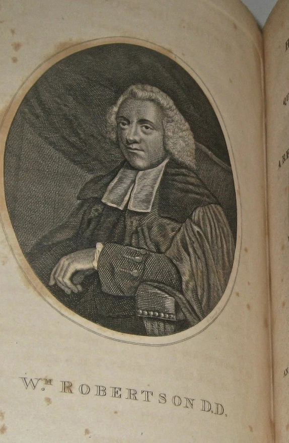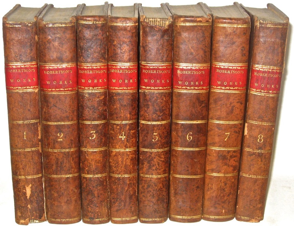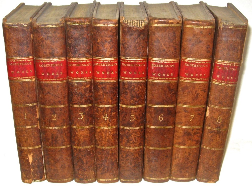 The Complete Works of WILLIAM ROBERTSON! With The Author's Last Emendations and Additions. To which is prefixed an account of the life and writings of the author. Complete in 8 volumes. Printed in 1811-1812. With the original 3 fold-out maps. FIRST AMERICAN EDITION! First American Edition of Robertson's History Of America, and History of Virginia. This is a RARE & important set. Still bound in the original leather bindings. Complete in 8 volumes. Includes all of his works. Including The History Of America. Being The First American Edition of his American History. Printed in 1811-1812. This set is Over 200 YEARS OLD!! First American Edition of History of Amerca and History of Virginia, as stated on the title pages (except Charles V which is the Second Edition). Each subset is complete in itself, together forming all of Robertson's works, complete in 8 volumes. Titles: Volumes 1 and 2 being: The History of Scotland During The Reigns of Queen Mary and of King James VI Until His Accession To The Crown of England; With A Review Of The Scottish History Previous To That Period. Volumes 3, 4, and 5 being: A History Of The Reign Of The Emperor Charles V; With A View Of The Progress Of Society In Europe; From The Subversion Of The Roman Empire To The Beginning Of The Sixteenth Century; Second American Edition; printed in 1812. Volumes 6 and 7 being: A History of America; First American Edition In Which Is Included The Posthumous Volume Containing The History Of Virginia, To The Year 1688; And of New England, to The Year 1652 Volume 8 being: An Historical Disquisition Concerning The Knowledge Which The Ancients Had Of India; And The Progress Of The Trade With That Country Prior To The Discovery Of The Passage To It By The Cape Of Good Hope. Frontisplates in most volumes, as issued. 3 fold-out maps. Printed on quality paper. Some volumes have Publisher's marginal notes. These are the original 200 year old bindings. These are the original full leather bindings. Full leather bindings were more expensive to produce, and are highly desirable! Gilded spines with red leather label. These measure 8 3/4 inches tall. Philadelphia, 1811 - 1812. First American Edition. In excellent condition. The leather is still supple and fresh, but with some wear and some chips, as shown. All the hinges are strongly attached and held firmly by the underlying cords, although there is some starting along the hinges. Printed on quality paper, there is some foxing and general age and usage wear. No writing. there is a surface gouge in the lower spine of volume one, chips on heads of other volumes, as shown. This is a gorgeous set! A durable set having been printed on quality materials. This set will last many more centuries if properly stored. This would make an excellent gift and/or addition to any fine library. In addition to their shelf presence, Rare & Antiquarian Books make a great investment. All books are individually wrapped and professionally padded. This set is complete in 8 volumes. These are the original bindings. Of the three great British historians of the 18th century two were Scotsmen. The exact place of Robertson with regard to his two friends Hume and Gibbon, and to such historians as the rest of Europe had to offer, presents a question of some nicety, because it is complicated by extraneous considerations, so to speak, which should not weigh in an abstract estimate, but cannot be excluded in a concrete and practical one. If we regard only Robertson's potential historic power, the question is not so much whether he was equal to either of his two friends as whether he was not superior to both. The man who wrote the review of the state of Europe prefixed to the History of Charles V. , or even the first book of the History of Scotland , showed that he had a wider and more synthetic conception of history than either the author of the Decline and Fall or the author of the History of England . These two portions of Robertson's work, with all their shortcomings in the eye of modern criticism, have a distinctive value which time cannot take away. He was one of the first to see the importance of general ideas in history. He saw that the immediate narrative of events with which he was occupied needed a background of broad and connected generalizations, referring to the social state of which the detailed history formed a part. But he did more than this. In the appendix to the view of Europe called "Proofs and Illustrations" he enters into the difficult and obscure question of land tenure in Frankish times, and of the origin of the feudal system, with a sagacity and knowledge which distinctly advanced the comprehension of this period beyond the point at which it had been left by Du Bos, Montesquieu and Mably. He was well acquainted with the original documents, -- many of them, we may conjecture, not easy to procure in Scotland. It must have been a genuine aptitude for historical research of a scientific kind which led Robertson to undertake the labor of these austere disquisitions of which there were not many in his day who saw the importance. Gibbon, so superior to him for wide reading and scholarship, has pointedly avoided them. Robertson's views are now out of date. But he deserves the honor of a pioneer in one of the most obscure if also important lines of inquiry connected with European history. On the other hand, it must be admitted that he showed himself only too tame a follower of Voltaire in his general appreciation of the middle ages, which he regarded with the mingled ignorance and prejudice common in the 18th century. In this particular he was not at all in advance of his age. item#1994 William Robertson (historian) From Wikipedia, the free encyclopedia Jump to navigation Jump to search This article is about the Scottish historian. For other people of the same name, see William Robertson (disambiguation) . William Robertson FRSE FSA Scot William Robertson (1721-93) Born 19 September 1721 Borthwick , Midlothian