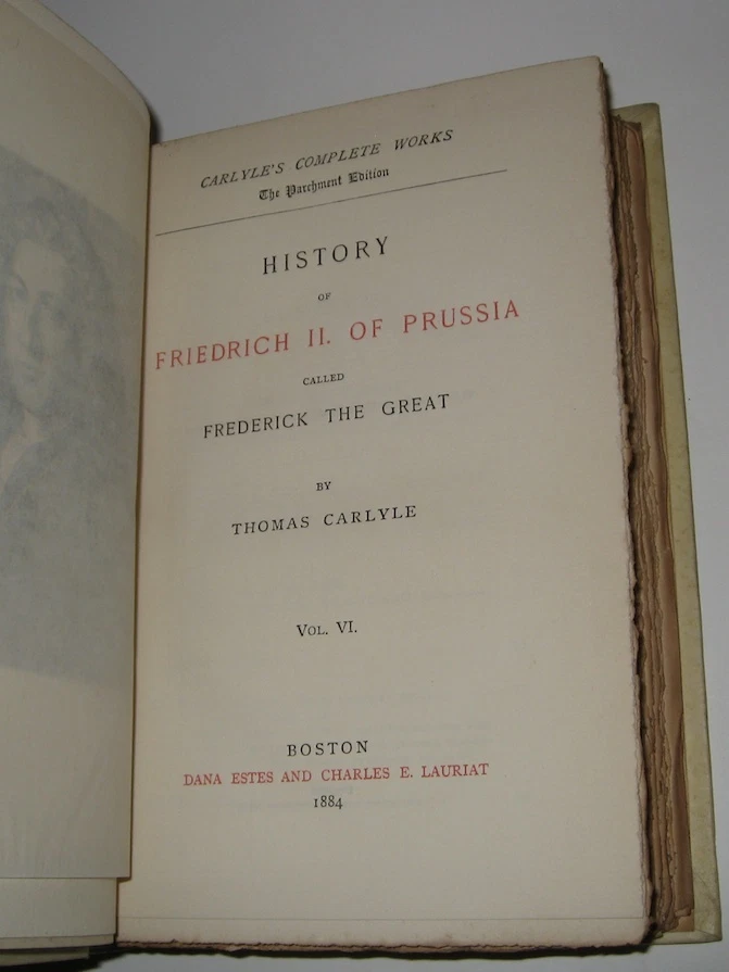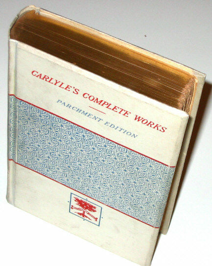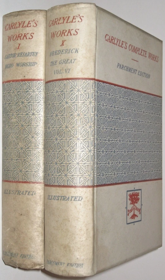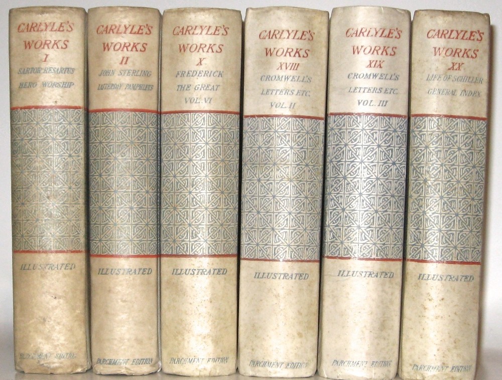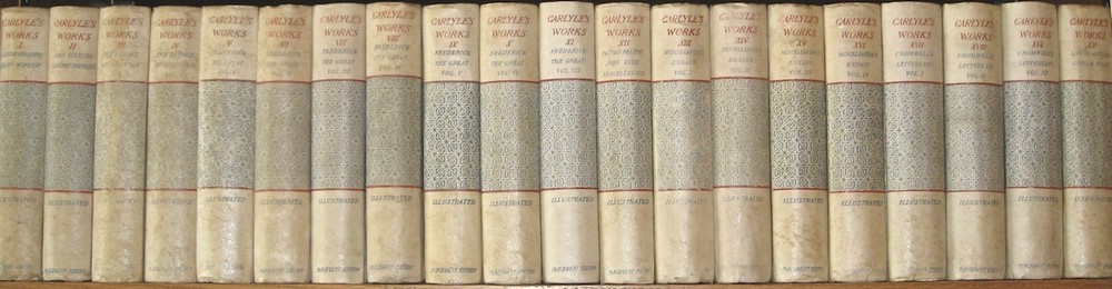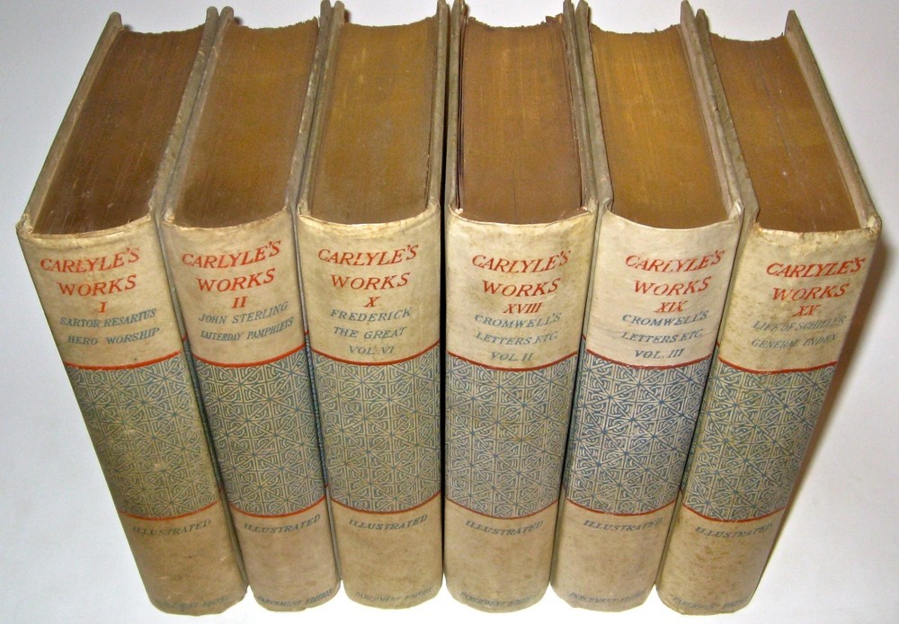 THE COMPLETE WORKS OF THOMAS CARLYLE! Complete with all 20 volumes. Printed in 1884. The Rare PARCHMENT EDITION! Limited to one of only 375 sets ever made. This is the FIRST COLLECTED EDITION of Carlyle's works. Printed just 3 years after Carlyle's death. Limited to Only Three Hundred and Seventy-Five Copies With this being #173 , number handwritten. With only 375 sets ever produced, this collection is quite scarce, and difficult to obtain, particularly in such collectible condition. Printed on exceptionally high quality paper. These are a pleasure to read. Each volume contains a frontispiece protected by tissue. A very high quality collection of Carlyle's complete works. The PARCHMENT EDITION. A beautiful set. Bound in full leather bindings. These are white vellum leather bindings. These are genuine leather. Full leather bindings were more expensive to produce and are highly desirable. Illustrated with quality engravings. Bound in full vellum leather of the highest quality. Decorative illustrated design on cover, spine. Top edges are gilded. The edges of the covers are all beveled. Printed on high quality Rag style paper. Bound in genuine vellum (genuine leather bindings.) Thick BEVELED boards. These are large books, measuring 8.25 inches tall. Complete in 20 volumes, all 20 volumes are present. Dana Estes and Charles E. Lauriat, Boston. Printed in 1884. Printed in English. CONDITION: Very Good condition overall with some generalized wear and abrasion and scuffs to the vellum, typical of vellum. FINE & UNREAD Internally. Leather is very fresh and supple. Hinges attached and sound. These are all still very tightly bound and try to close when opened. Main wear is general external rubbing and abrasion. Some of the ink printing on the vellum may be abraded through in areas reminiscent of gouging or scuffs on calf. The front cover of volume eight shows abrasion to and through the ink printing on that cover. The front cover of volume eight shows additional abrasion and rubbing. Exceptionally durable vellum, the types found on books from the 1400's. The vellum is wrapped over thick beveled boards. The white spines and covers show some light dirt, as shown. Possible micro extremity chipping if at all. Bright, clean interior, printed on high quality rag style paper. Practically free of any foxing. Printed on quality rag paper. Internal hinge paper may have some wear in a couple volumes. All hinges are fully and strongly attached. All tightly bound and exceptionally well-preserved. No previous signs of ownership. A gorgeous set. Limited to Only Three Hundred and Seventy-Five Copies with this being #173 , number handwritten. With only 375 sets ever produced, this collection is quite scarce, and difficult to obtain, particularly in such collectible condition. Each volume contains a frontispiece protected by tissue. A very high quality collection of Carlyle's complete works. Titles: Vol. I Sartor Resartus / Hero Worship Vol. II John Sterling / Latterday Pamphlets Vol. III The French Revolution I Vol. IV The French Revolution II Vol. V - XII Frederick The Great I-VII Vol. XII Past and Present / John Knox / Miscellanies Vol. XIII - XVI Miscellaneous Essays I-IV Vol. XVII - XIX Cromwell's Letters, Etc. I-III Vol. XX Life of Schiller / General Index This set would make a great gift and/or addition to any library. (No other sets, bound in the original vellum, are presently available elsewhere.) #3675 Thomas Carlyle From Wikipedia, the free encyclopedia Jump to navigation Jump to search This article is about the writer. For the Irvingite, see Thomas Carlyle (lawyer) . Thomas Carlyle Photo by Elliott & Fry , c. 1860s Born 4 December 1795 Ecclefechan , Dumfriesshire , Scotland Died 5 February 1881 (aged 85) London , England Occupation Essayist, satirist, translator, historian, mathematician Alma mater University of Edinburgh Literary movement Victorian literature Notable works Sartor Resartus The French Revolution: A History On Heroes, Hero-Worship, and The Heroic in History Carlyle circle (mathematics) Signature Thomas Carlyle (4 December 1795 – 5 February 1881) was a Scottish philosopher , satirical writer, essayist , translator , historian , mathematician , and teacher. [1] Considered one of the most important social commentators of his time, he presented many lectures during his lifetime with certain acclaim in the Victorian era . One of those conferences resulted in his famous work On Heroes, Hero-Worship, and The Heroic in History where he argued that the key role in history lies in the actions of the " Great Man ", claiming that "the history of the world is but the biography of great men". [2] A respected historian, his 1837 book The French Revolution: A History was the inspiration for Charles Dickens ' 1859 novel A Tale of Two Cities , and remains popular today. Carlyle's 1836 Sartor Resartus is a notable philosophical novel. A great polemicist, Carlyle coined the term " the dismal science " for economics, in his essay " Occasional Discourse on the Negro Question ". [3] He also wrote articles for the Edinburgh Encyclopædia , [4] and his "Occasional Discourse on the Negro Question" (1849) remains controversial. [5] Once a Christian, Carlyle lost his faith while attending the University of Edinburgh , later adopting a form of deism . [6] In mathematics , he is known for the Carlyle circle , [7] a method used in quadratic equations and for developing ruler-and-compass constructions of regular polygons . Contents 1 Early life and influences 2 Writings 2.1 Early writings 2.2 Sartor Resartus 2.2.1 Everlasting Yea and No 2.2.2 Worship of Silence and Sorrow 2.3 The French Revolution 2.4 Heroes and Hero Worship 2.5 Past and Present 2.6 Later work 2.6.1 Frederick the Great 2.6.2 Last works 3 London Library 4 Private life 4.1 Marriage 4.2 Later life 4.3 Death 4.4 Biography 5 Influence 6 Views 6.1 Anglo-Saxonism 6.2 Antisemitism 7 Works 8 Definitions 9 See also 10 Notes 11 Bibliography 12 Further reading 13 
