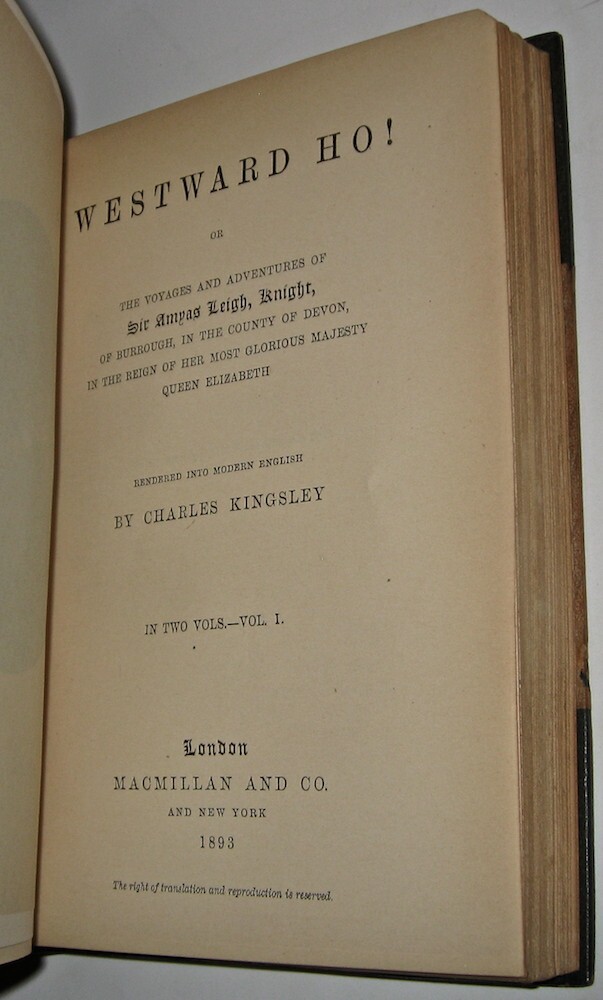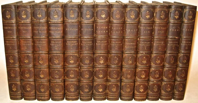 THE COMPLETE WORKS OF CHARLES KINGSLEY! Complete in 13-volumes . Bound in the original leather bindings. Printed in 1893. This is an absolutely gorgeous set. With INTRICATE LEATHER FLORAL INLAYS. These bindings would have been extremely costly to produce. High quality leather binding with raised hubs and intricate leather floral detailing. Eversley Edition. Printed in 1893. This set is over 120 years old. Complete in 13-volumes, as issued, as is standard, and is inclusive of all of Kingsley's works. Complete in 11 volumes + his Poems in 2 volumes. 11 volumes is standard for Kingsley's Works. Together with his Poems in 2 additional volumes. Complete in 13 volumes. Bound in quality leather bindings. These are the original bindings. Marbled end papers. Printed on quality paper, with wide margins. London, Macmillan and Co. Printed in 1893. In Very Good, near Fine condition overall with some abrasion and wear to the bindings. The leather is very fresh and supple. The hinges 100% fully and strongly attached with some light abrasion and scuffing. Printed on quality paper, near free of any trace of foxing. This is a gorgeous and highly giftable set. All hinges attached and sound, with some rubbing and abrasion. In VERY GOOD condition. Very fresh and well-preserved. An early bookplate, no writing. Set is complete in 13 total volumes. 'Yeast', 'Hypatia', 'Westward Ho!', 'Two Years Ago', 'Alton Locke', 'Hereward The Wake', et al... This would make an excellent gift and/or addition to any fine library. In addition to their shelf presence, Rare & Antiquarian Books make a great investment. I always pack very securely to help ensure safe handling during transit. All books are individually wrapped and professionally padded. Charles Kingsley From Wikipedia, the free encyclopedia Jump to navigation Jump to search For the British yacht designer, see Charles Kingsley (yacht designer) . For the English tennis player, see Charles Kingsley (tennis) . The Reverend Charles Kingsley Born 12 June 1819 Holne , Devon, England Died 23 January 1875 (aged 55) Eversley , Hampshire, England Occupation Clergyman, historian, novelist Nationality English Alma mater King's College London Magdalene College, Cambridge Period 19th century Genre Social Christianity Literary movement Christian socialism Spouse Frances Eliza Grenfell Charles Kingsley (12 June 1819 – 23 January 1875) was a broad church priest of the Church of England , a university professor, social reformer, historian and novelist. He is particularly associated with Christian socialism , the working men's college , and forming labour cooperatives that failed but led to the working reforms of the progressive era . He was a friend and correspondent with Charles Darwin . [1] He was also the uncle of traveller and scientist Mary Kingsley . Contents 1 Life and character 2 Influences and works 3 Views 3.1 Anglo-Saxonism 3.2 Hibernophobia 4 Legacy 5 Published works 6 Notes 7 References 8 External links Caricature by Adriano Cecioni published in Vanity Fair in 1872. Kingsley was born in Holne , Devon , the elder of two sons of the Reverend Charles Kingsley and his wife Mary Lucas Kingsley. His brother Henry Kingsley and his sister Charlotte Chanter also became writers. He spent his childhood in Clovelly , Devon, where his father was Curate 1826–1832 and Rector 1832–1836, [2] and at Barnack , Northamptonshire and was educated at Bristol Grammar School and Helston Grammar School [3] before studying at King's College London , and the University of Cambridge. Charles entered Magdalene College, Cambridge , in 1838, and graduated in 1842. [4] He chose to pursue a ministry in the church. From 1844, he was rector of Eversley in Hampshire. In 1859 he was appointed chaplain to Queen Victoria . [5] [6] In 1860, he was appointed Regius Professor of Modern History at the University of Cambridge. [5] [6] In 1861 he became a private tutor to the Prince of Wales . [5] In 1869 Kingsley resigned his Cambridge professorship and, from 1870 to 1873, was a canon of Chester Cathedral . While in Chester he founded the Chester Society for Natural Science, Literature and Art, which played an important part in the establishment of the Grosvenor Museum . [7] In 1872 he accepted the Presidency of the Birmingham and Midland Institute and became its 19th President. [8] In 1873 he was made a canon of Westminster Abbey . [5] Kingsley died in 1875 and was buried in St Mary's Churchyard in Eversley . Kingsley sat on the 1866 Edward Eyre Defence Committee along with Thomas Carlyle , John Ruskin , Charles Dickens , John Tyndall , and Alfred Tennyson , where he supported Jamaican Governor Edward Eyre 's brutal suppression of the Morant Bay Rebellion against the Jamaica Committee . One of his daughters, Mary St Leger Kingsley, became known as a novelist under the pseudonym " Lucas Malet ". [6] Kingsley's life was written by his widow in 1877, entitled Charles Kingsley, his Letters and Memories of his Life . [6] Kingsley also received letters from Thomas Huxley in 1860 and later in 1863, discussing Huxley's early ideas on agnosticism . Kingsley's interest in history is shown in several of his writings, including The Heroes (1856), a children's book about Greek mythology , and several historical novels, of which the best known are Hypatia (1853), Hereward the Wake (1865) and Westward Ho! (1855). Kingsley He was sympathetic to the idea of evolution and was one of the first to welcome Charles Darwin 's book On the Origin of Species . He had been sent an advance review copy and in his response of 18 November 1859 (four days before the book went on sale) stated that he had "long since, from watching the crossing of domesticated animals and plants, learnt to disbelieve the dogma of the permanence of species." [9] Darwin added an edited version of Kingsley's closing remarks to the next edition of his book, stating that "A celebrated author and divine has written to me that 'he has gradually learnt to see that it