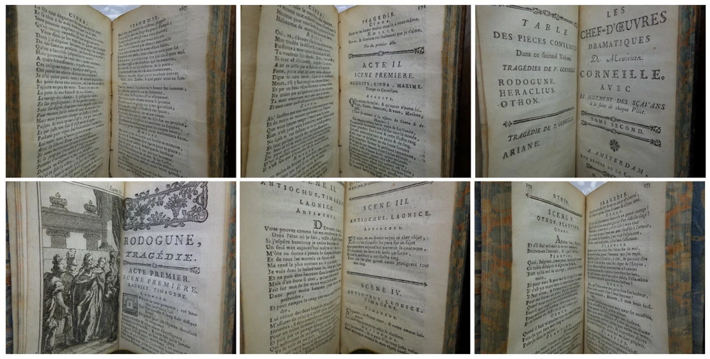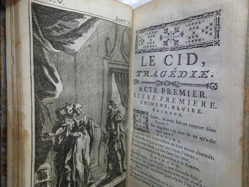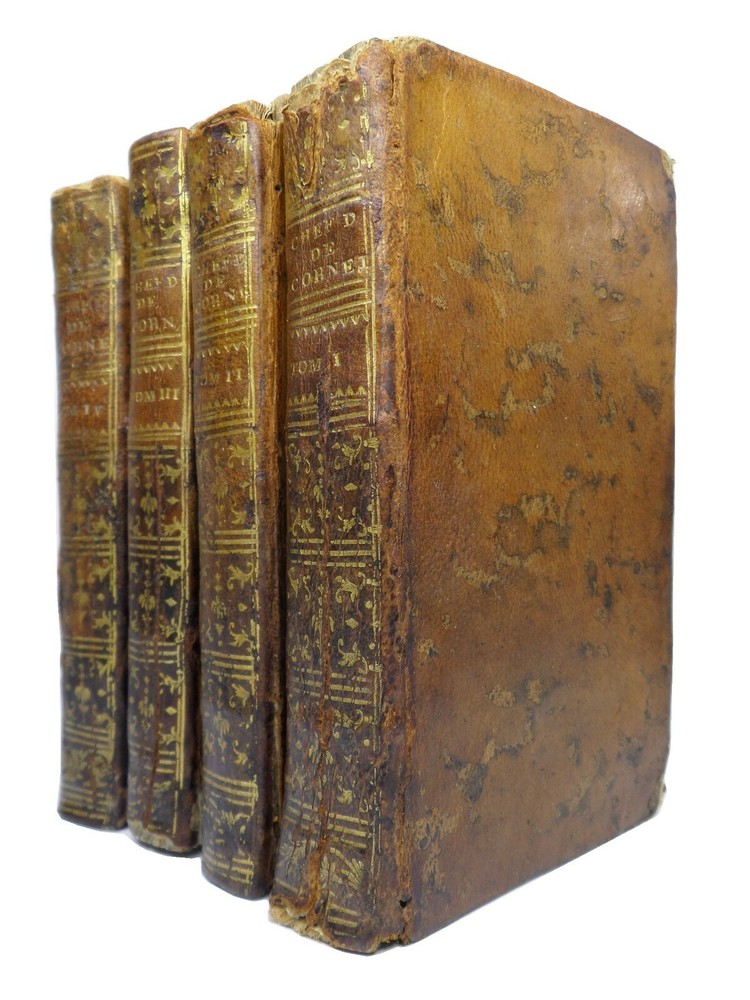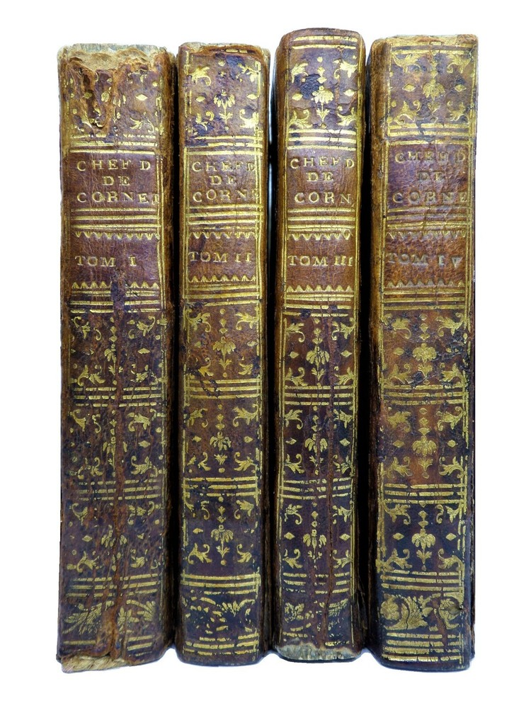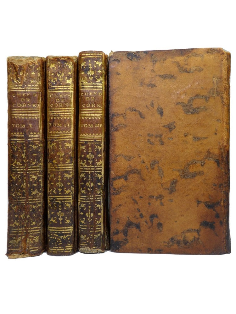 [CORNEILLE, Pierre; CORNEILLE, Thomas ]. Les chef-d'oeuvres dramatiques de Messieurs Corneille, avec le jugement des sçavans ê la fin de chaque piéce. A Amsterdam: Aux dépens de la Compagnie, M. DCC. LXXIII. [1773]. Reprint. Complete in four volumes. Leather-bound. 12mo (165 x 85 mm.), pp. viii, (2), 384; (6), 314; (8), 172 [i.e. 272]; (8), 352. French text. Bound in contemporary full marbled calf, smooth spines gilt, marbled page edges and endpapers, engravings, head- and tail-pieces. Vol. 1. Tragedies de P. Corneille: Le Cid; Horace; Cinna; Polyeucte; La mort de Pompée. -- Vol. 2. Tragedies de P. Corneille: Rodogune; Heraclitus; Othon. Tragedie de T. Corneille: Ariane. -- Vol.3. Tragedies de P. Corneille: La Comte d'Essex; Comedie de P. Corneille: Le Menteur; Comedie de T. Corneille: Le Baron d'Albikrac. -- Vol. 4. Comedies de T. Corneille: Le Festin de Pierre; La Comtesse d'Orgueil; L'Inconnu. Condition: Collated compete. Bindings tight and secure, however there is some minor cracking to some joints and rubbing to points and spine ends. Contents very well preserved with some light browning, a few leaves with marginal staining. A lovely set without previous ownership markings. Scarce. International tracked shipping - dispatched promptly and securely. Please view my other books.