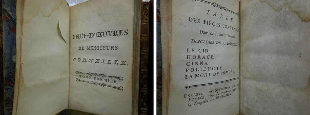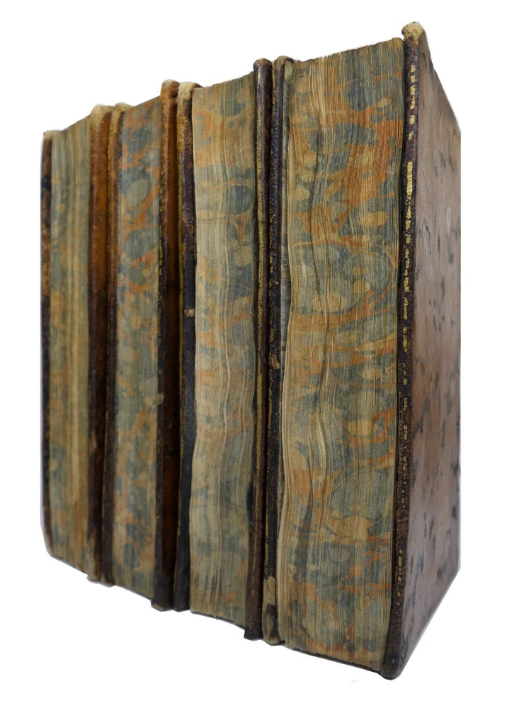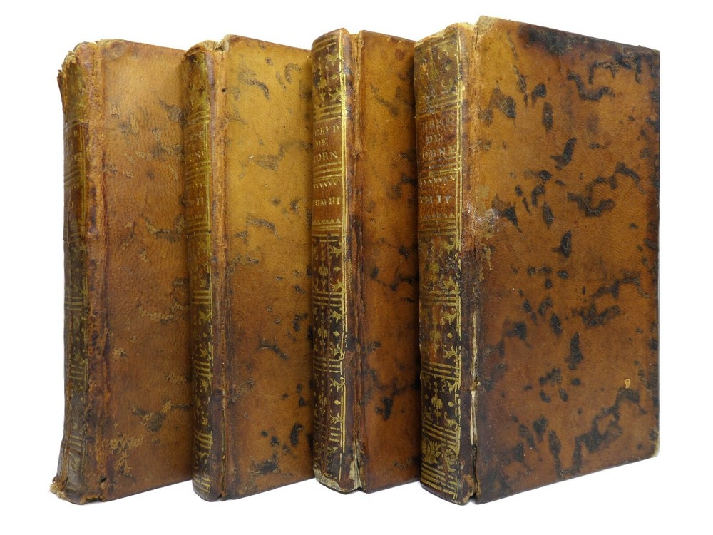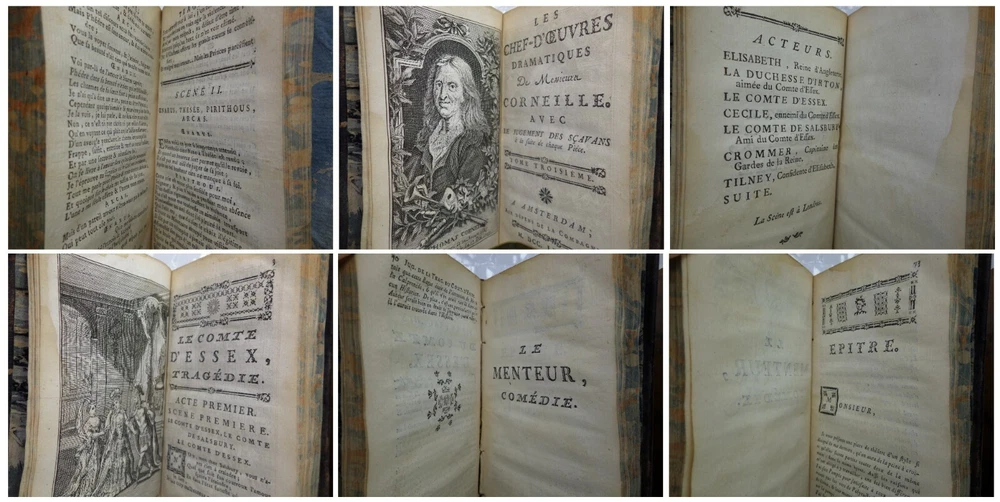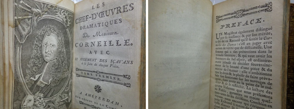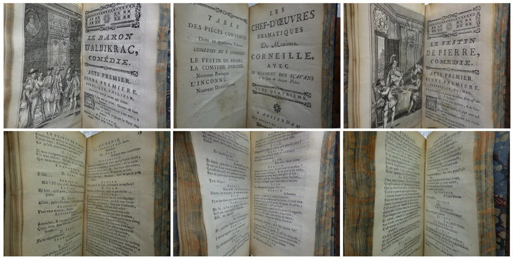 [CORNEILLE, Pierre; CORNEILLE, Thomas ]. Les chef-d'oeuvres dramatiques de Messieurs Corneille, avec le jugement des sçavans ê la fin de chaque piéce. A Amsterdam: Aux dépens de la Compagnie, M. DCC. LXXIII. [1773]. Reprint. Complete in four volumes. Leather-bound. 12mo (165 x 85 mm.), pp. viii, (2), 384; (6), 314; (8), 172 [i.e. 272]; (8), 352. French text. Bound in contemporary full marbled calf, smooth spines gilt, marbled page edges and endpapers, engravings, head- and tail-pieces. Vol. 1. Tragedies de P. Corneille: Le Cid; Horace; Cinna; Polyeucte; La mort de Pompée. -- Vol. 2. Tragedies de P. Corneille: Rodogune; Heraclitus; Othon. Tragedie de T. Corneille: Ariane. -- Vol.3. Tragedies de P. Corneille: La Comte d'Essex; Comedie de P. Corneille: Le Menteur; Comedie de T. Corneille: Le Baron d'Albikrac. -- Vol. 4. Comedies de T. Corneille: Le Festin de Pierre; La Comtesse d'Orgueil; L'Inconnu. Condition: Collated compete. Bindings tight and secure, however there is some minor cracking to some joints and rubbing to points and spine ends. Contents very well preserved with some light browning, a few leaves with marginal staining. A lovely set without previous ownership markings. Scarce. International tracked shipping - dispatched promptly and securely. Please view my other books.