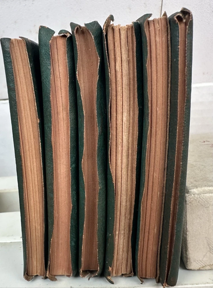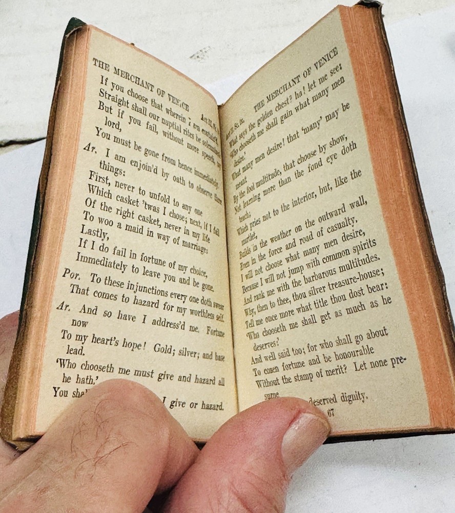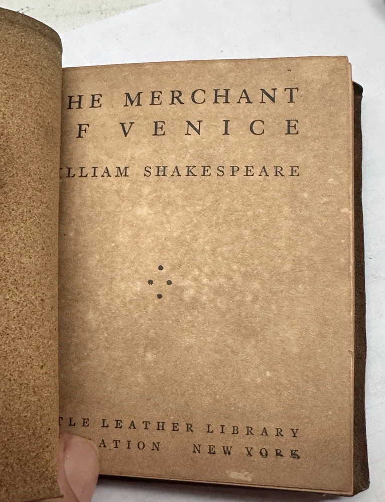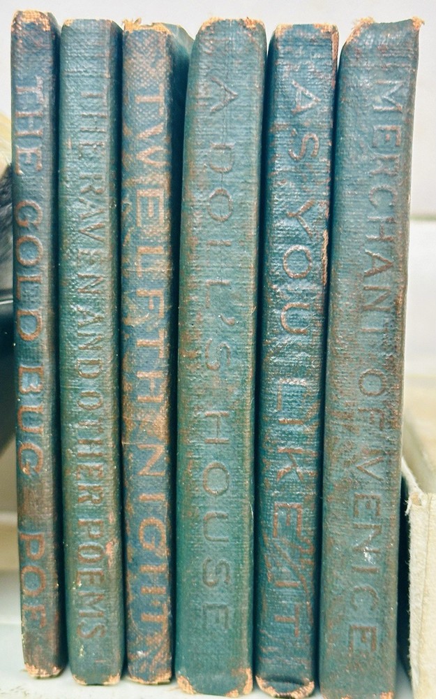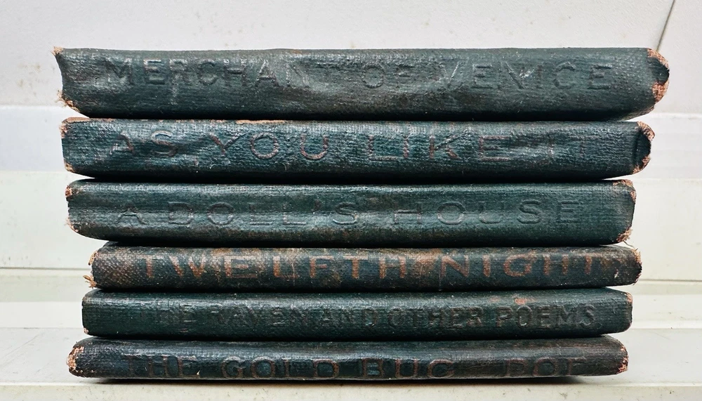 Nice and vintage little leather library set of Six books...nice shape as shown with sturdy cover and binding.. book/pages are stiff and tight.."AS YOU LIKE IT' by Shakespeare, MERCHANT OF VENICE by Shakespeare, A DOLLS HOUSE by Ibsen, TWELFTH NIGHT by Shakespeare, THE GOLD BUG by Poe, THE RAVEN AND OTHER POEMS by Poe...each book measues 3&1/8th by 4 inches..nice vintage condition....clean with age..complete...binding and pages tight as you can see in pictures..describe to the best of my ability but if something is important to you please message me..thanks for looking ! minkman