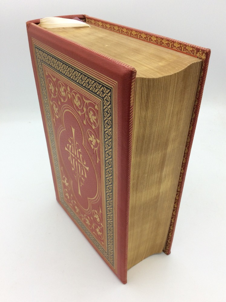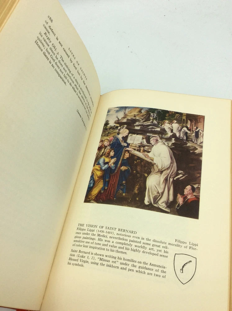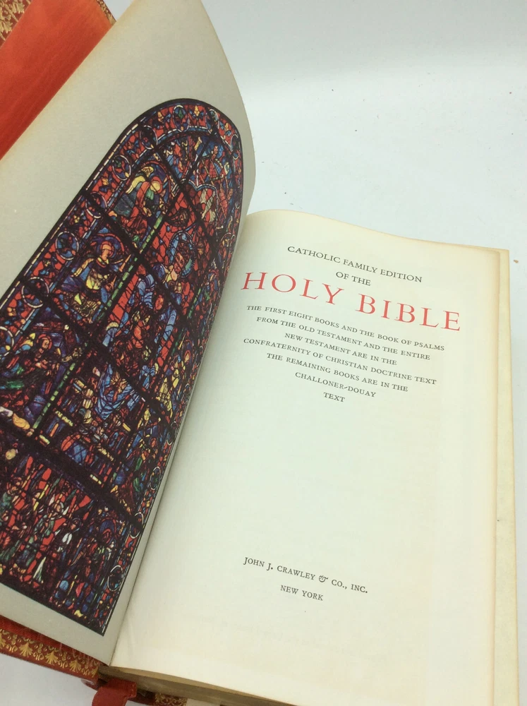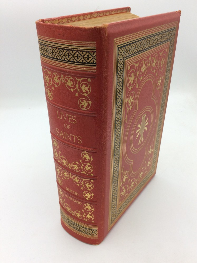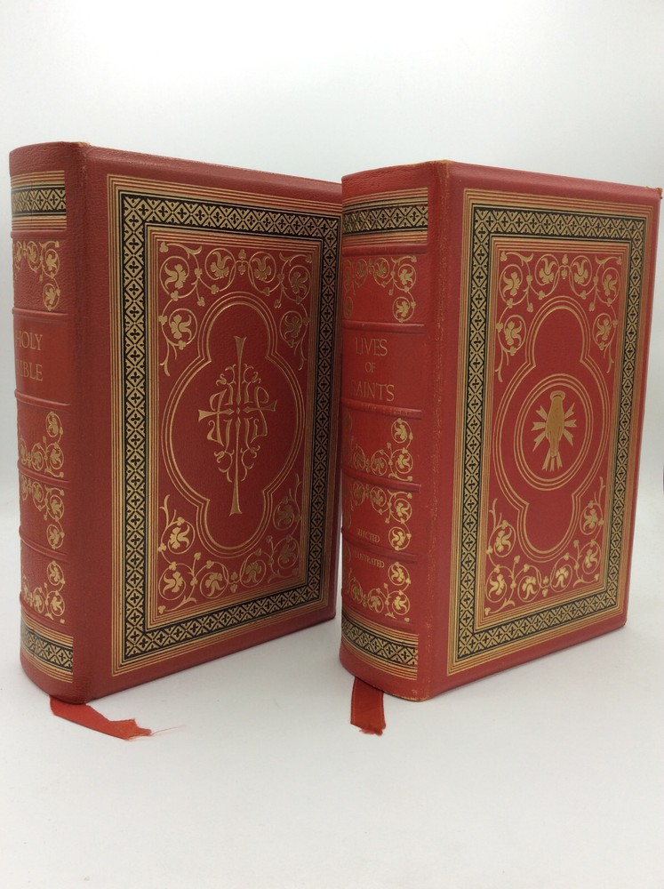 Fr. Joseph Vann, ed. LIVES OF SAINTS with Excerpts from Their Writings / CATHOLIC FAMILY EDITION OF THE HOLY BIBLE New York: John J. Crawley & Co., Inc., 1954. Deluxe Gregorian Edition. 2 vols. 527p / 1186p OT; 381p NT. A set of two hardcover books beautifully bound in full red leather with ornate gilt decorations, gilt edges and dentelles, silk endpapers, and attached ribbon bookmarks. Condition is very good to near-fine. On the LIVES OF SAINTS volume, the corners are lightly worn and the edges of the spine are rubbed. Gilt edges unobstrusively rubbed; still shiny and smooth. Gilt emblem in the middle of the front cover of LIVES OF SAINTS is lightly rubbed. Otherwise, text clean and binding tight in both volumes. Excellent condition, ideal for gifting! Item #193351 The deluxe Gregorian Edition! The Bible is in the Confraternity version and contains an unused family record section. Both books contain beautiful color illustrations.