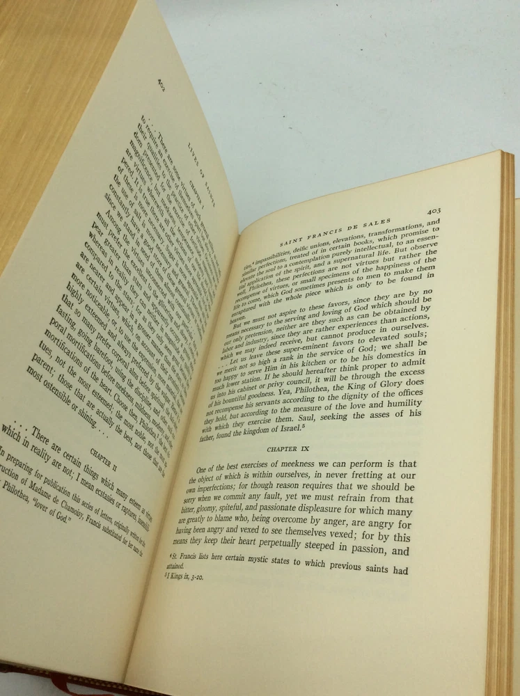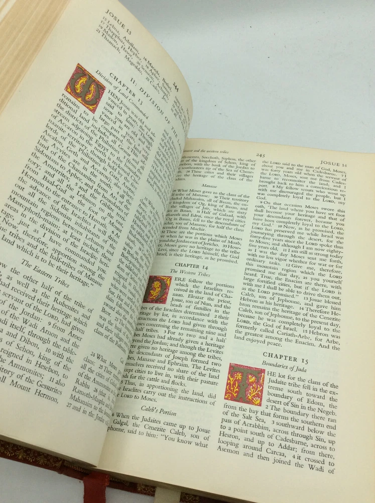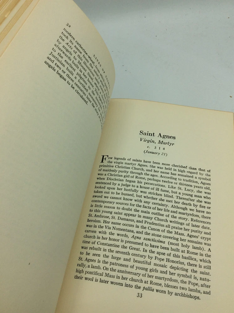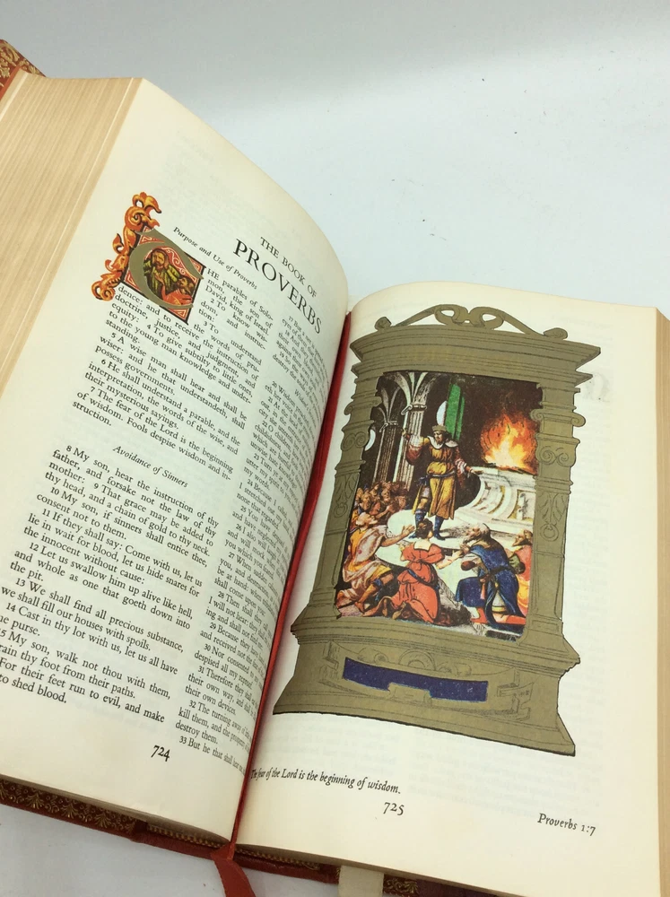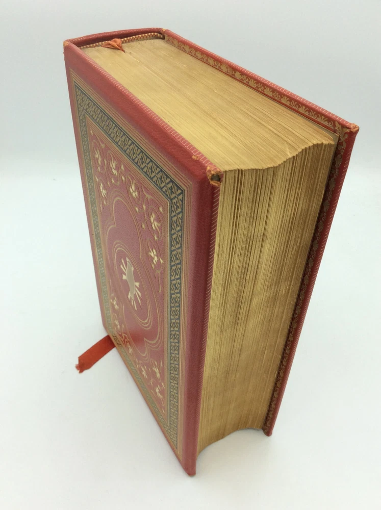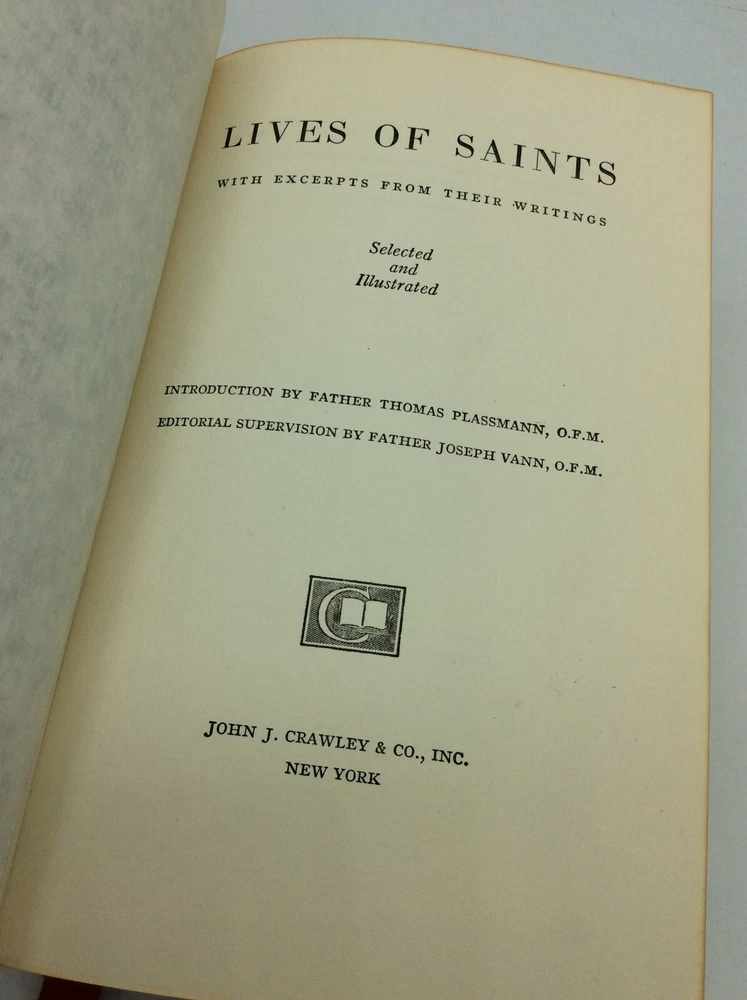 Fr. Joseph Vann, ed. LIVES OF SAINTS with Excerpts from Their Writings / CATHOLIC FAMILY EDITION OF THE HOLY BIBLE New York: John J. Crawley & Co., Inc., 1954. Deluxe Gregorian Edition. 2 vols. 527p / 1186p OT; 381p NT. A set of two hardcover books beautifully bound in full red leather with ornate gilt decorations, gilt edges and dentelles, silk endpapers, and attached ribbon bookmarks. Condition is very good to near-fine. On the LIVES OF SAINTS volume, the corners are lightly worn and the edges of the spine are rubbed. Gilt edges unobstrusively rubbed; still shiny and smooth. Gilt emblem in the middle of the front cover of LIVES OF SAINTS is lightly rubbed. Otherwise, text clean and binding tight in both volumes. Excellent condition, ideal for gifting! Item #193351 The deluxe Gregorian Edition! The Bible is in the Confraternity version and contains an unused family record section. Both books contain beautiful color illustrations.