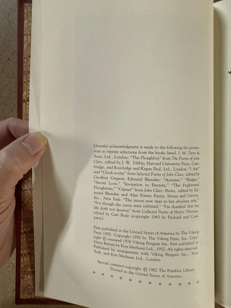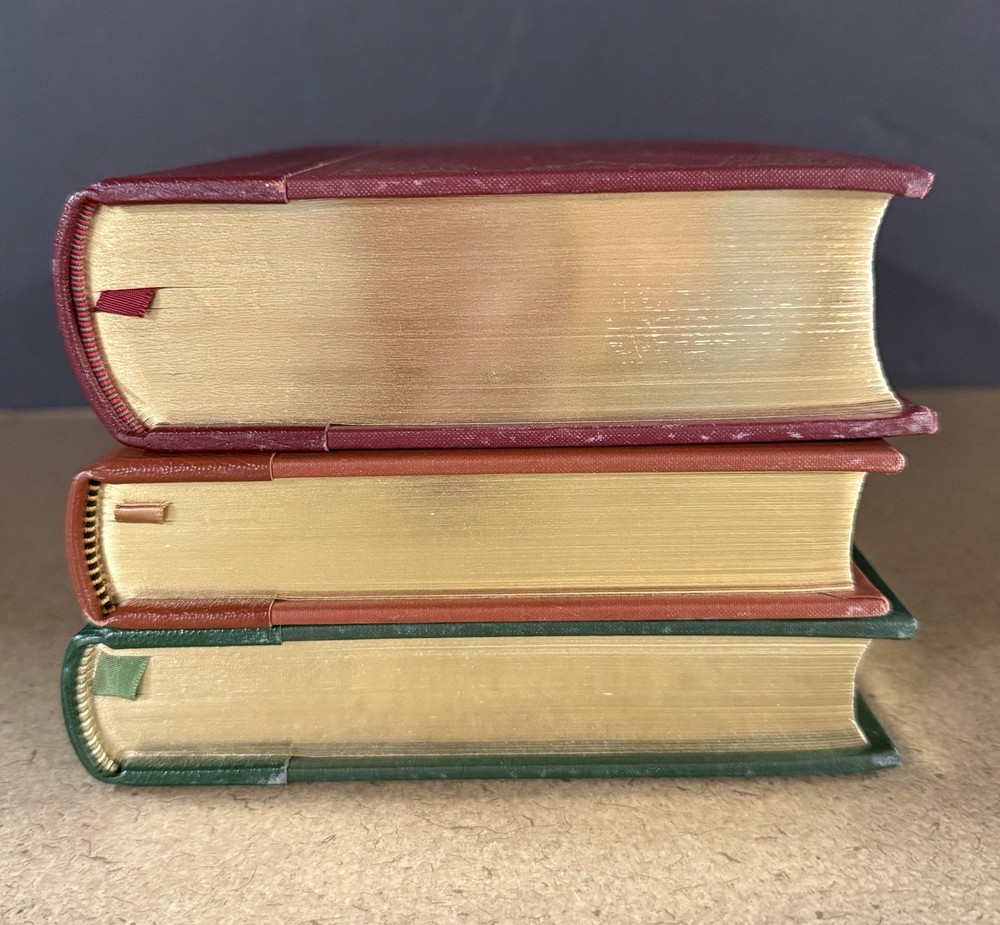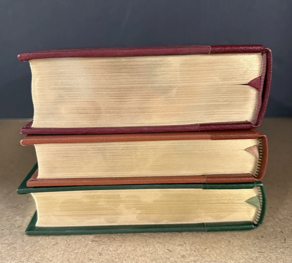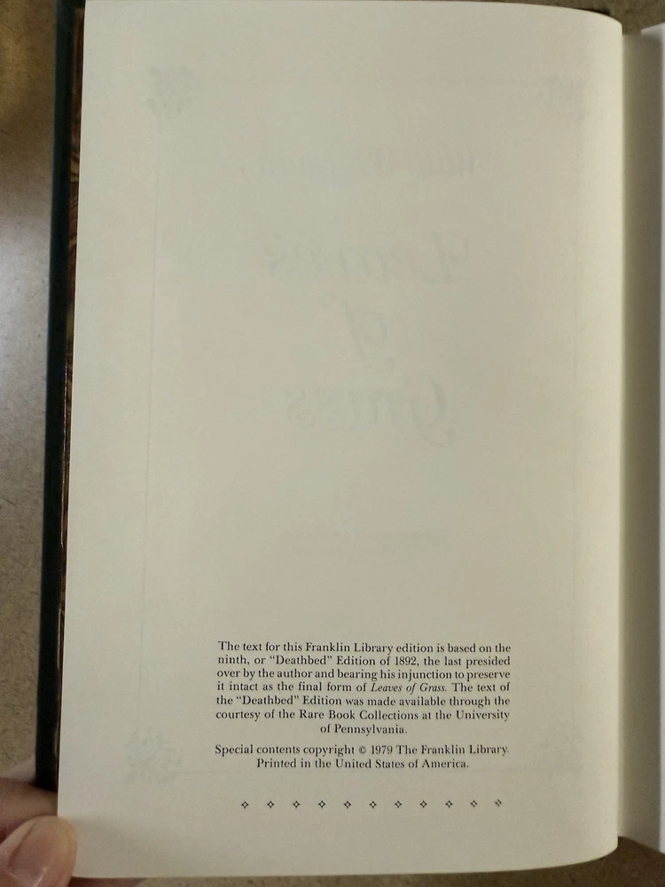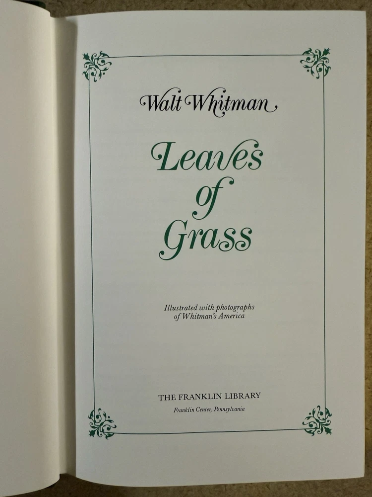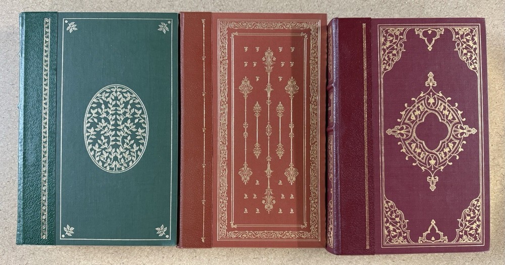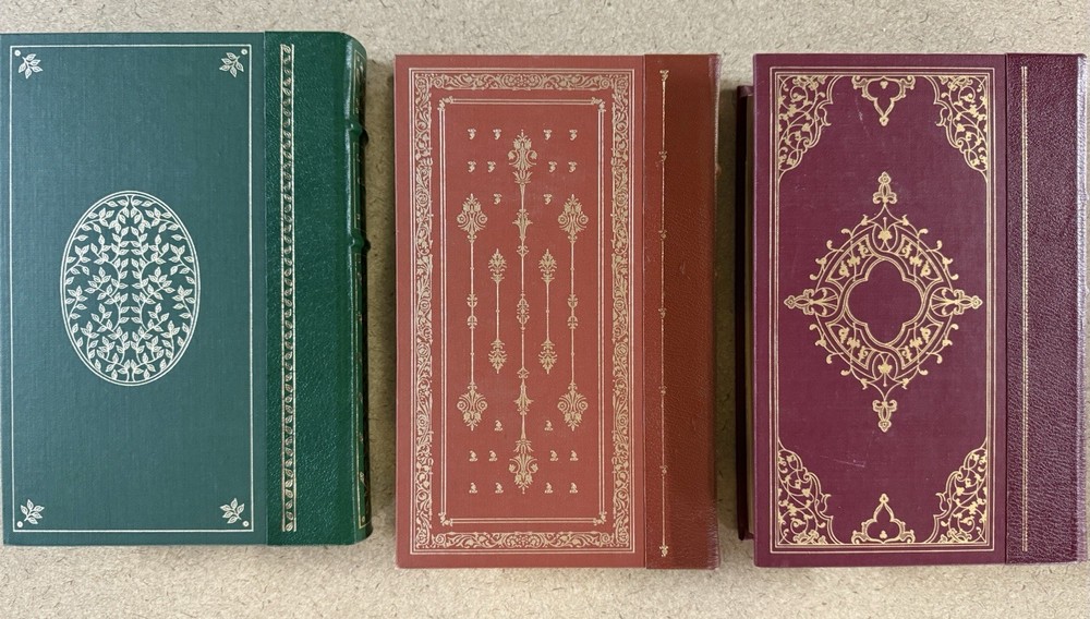 LOT FRANKLIN LIBRARY: Romantic Poets, Leaves of Grass by Walt Whitman, Tales from the Arabian Nights by Sir Richard Burton Lot of 3 Franklin Library Hardcover Books in Like New Condition. Stunning books. None appear to have been read. The only flaw I see is some minor irregularity in the gilding. See below for all features. Approx Size: 6" x 9.5" (they vary slightly). Leaves of Grass by Walt Whitman (1979) - 536 pages Romantic Poets from William Blake to Edgar Allen Poe (1982) - 461 pages Tales from the Arabian Nights by Sir Richard Burton (1980) - 770 pages The Franklin Library, a division of The Franklin Mint, was a publisher of fine collector edition books from the early 1970s until 2000. Known for beautiful leather bindings, Franklin Library books were published in three styles: full leather, leather-like cloth (leatherette), and quarter-bound leather. These 3 books feature: quarter bound in fine genuine leather with 22 karat gold decorations all page edges gilded with 22 karat gold raised spine hubs sewn-in satin ribbon bookmarks high-quality paper decorative FC endpapers sewn pages for strength and durability