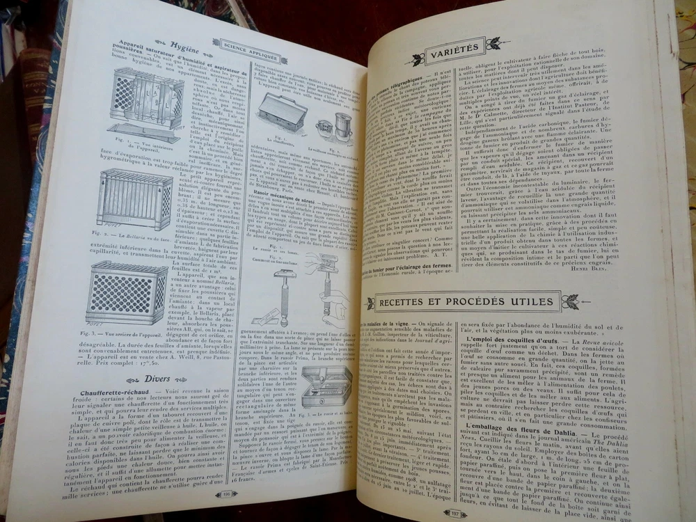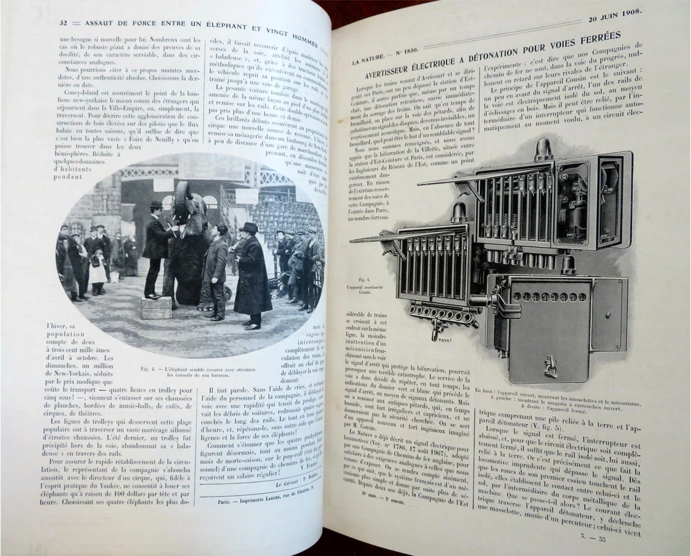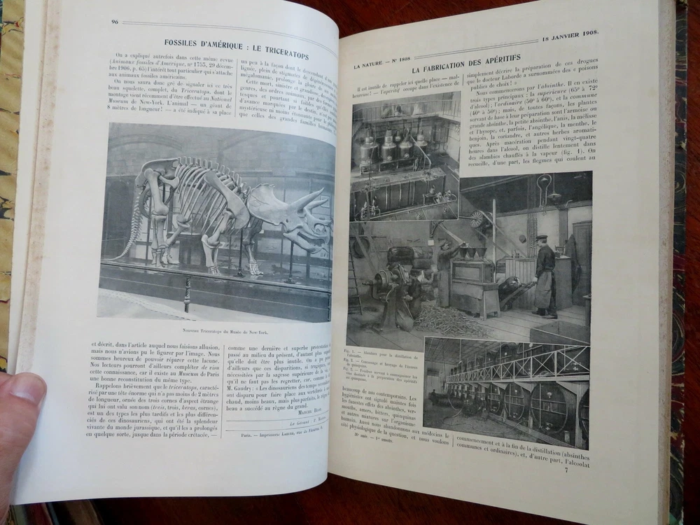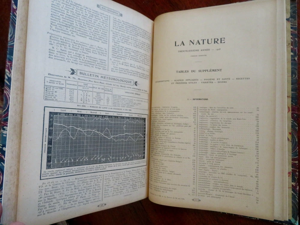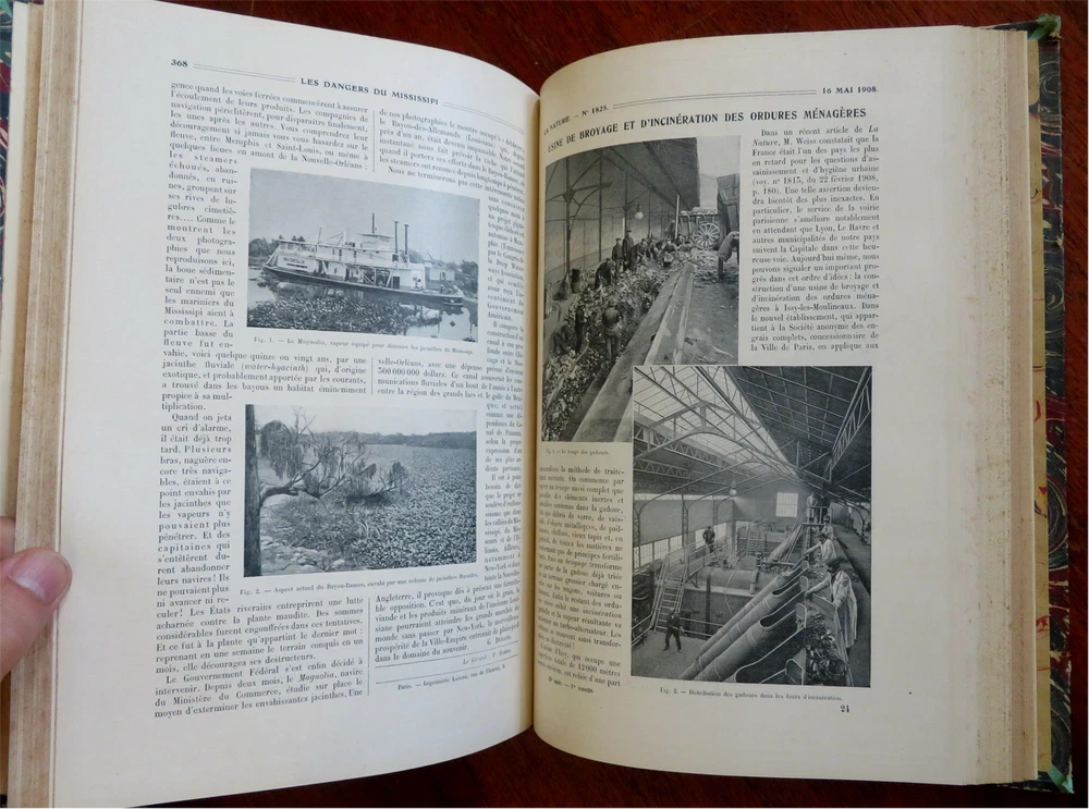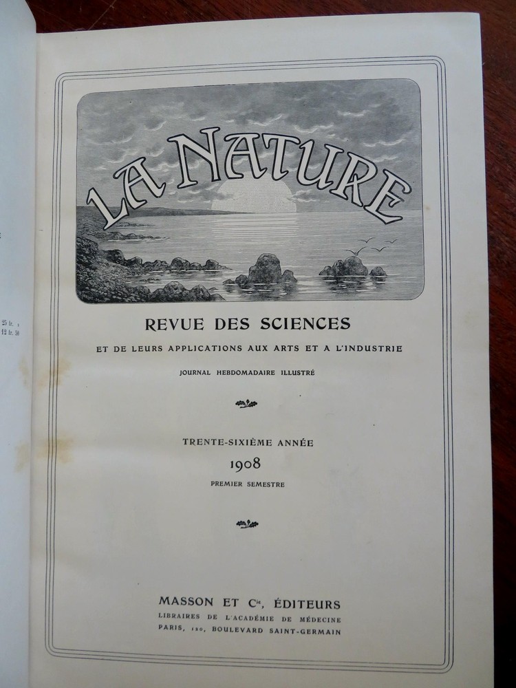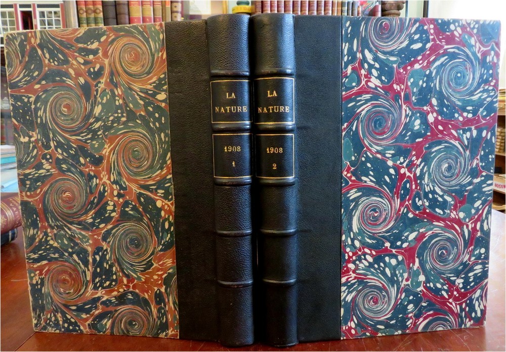 La Nature French Scientific Review Arts 1908 Illustrated rare 2 vol. leather set La Nature French Scientific Review Arts 1908 Illustrated rare 2 vol. leather set (Old Books, 20th Century Books, Leather Books, French Periodicals, Illustrated Books, Sciences, Engineering). Le Nature: Revue des Sciences et de Leurs Application Aux Arts et a L'Industrie, ed. by Henri de Parville. Published 1908, Paris by Masson et Cie. 2 volumes, each c. 425 pages. Text in French. Profusely illustrated throughout with many hundreds of line drawings and photographs. A remarkable monumental compilation of endless inventions and topics across many fields and genres, including but not limited to: medicine & medical sciences, engineering, motorcycles, weapons, urban projects, birds, insects, natural history, nautical, architecture, electricity, ancient art & ruins, chemistry, on and on. Period 1/4 leather bindings, smooth spines, gilt bands, title lettering, & compartment decorations, marbled covers & end papers. Set is physically old and shows some signs of handling and time. Set is not new or in "new" condition. Bindings gently age worn and lightly rubbed, covers are strongly and firmly attached, set remains overall attractive as an object. Text block paper is gently toned, internally still clean, well preserved, tight, sound. Still attractive on the shelf. This scarce set displays a pleasing and unique age patina and is in nice antiquarian condition, any age flaws easy to overlook or forgive. Please review photos for more detail and our best attempt to convey how this wonderful pictorial set survives. Books Measures c. 11 1/2" H x 8" W. [B9877].