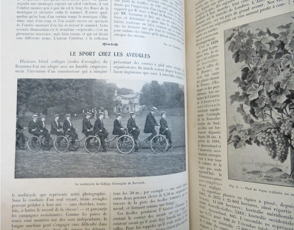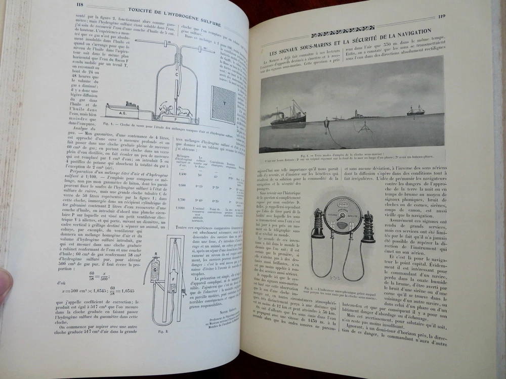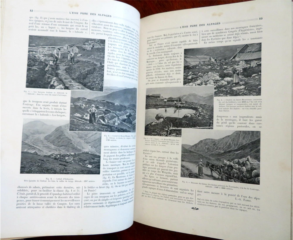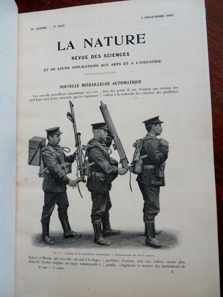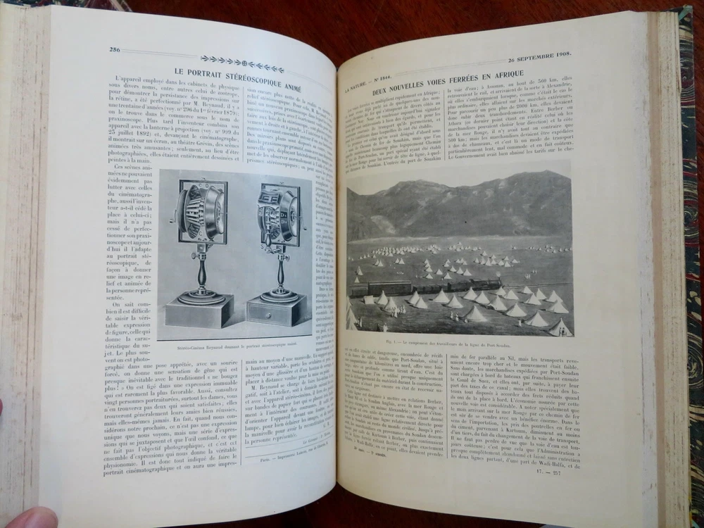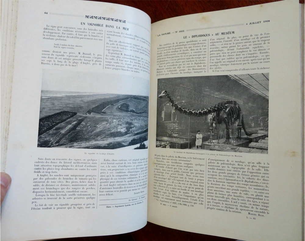 La Nature French Scientific Review Arts 1908 Illustrated rare 2 vol. leather set La Nature French Scientific Review Arts 1908 Illustrated rare 2 vol. leather set (Old Books, 20th Century Books, Leather Books, French Periodicals, Illustrated Books, Sciences, Engineering). Le Nature: Revue des Sciences et de Leurs Application Aux Arts et a L'Industrie, ed. by Henri de Parville. Published 1908, Paris by Masson et Cie. 2 volumes, each c. 425 pages. Text in French. Profusely illustrated throughout with many hundreds of line drawings and photographs. A remarkable monumental compilation of endless inventions and topics across many fields and genres, including but not limited to: medicine & medical sciences, engineering, motorcycles, weapons, urban projects, birds, insects, natural history, nautical, architecture, electricity, ancient art & ruins, chemistry, on and on. Period 1/4 leather bindings, smooth spines, gilt bands, title lettering, & compartment decorations, marbled covers & end papers. Set is physically old and shows some signs of handling and time. Set is not new or in "new" condition. Bindings gently age worn and lightly rubbed, covers are strongly and firmly attached, set remains overall attractive as an object. Text block paper is gently toned, internally still clean, well preserved, tight, sound. Still attractive on the shelf. This scarce set displays a pleasing and unique age patina and is in nice antiquarian condition, any age flaws easy to overlook or forgive. Please review photos for more detail and our best attempt to convey how this wonderful pictorial set survives. Books Measures c. 11 1/2" H x 8" W. [B9877].