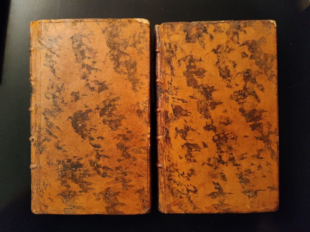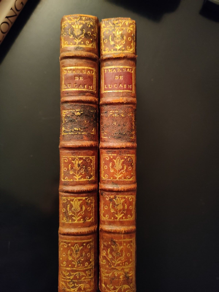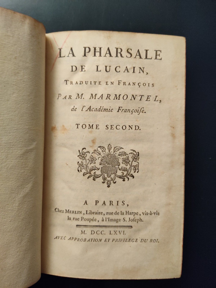 This auction is for a Two-Volume French translation of "La Pharsale de Lucian" by Marcus Annaeus Lucanus. Translated by M. Marmontel. This version published in Paris in 1766. With 10 engraved plates. Contemporary mottled calf, raised bands, morocco spine labels, sections tooled in gilt, all edges professionally stained. Faults listed above, otherwise generally clean pages good binding. Purchased at auction. Feel free to ask any questions. Good luck and thanks for bidding! . You can bid with confidence. I have been an eBay member in good standing since the 1990's, and continue to receive terrific feedback both as a buyer and a seller. I am not a professional dealer; just a regular guy who buys and sells stuff on eBay when I have something to sell or find something to buy. (L9) If you need more photos of an item please just ask.
