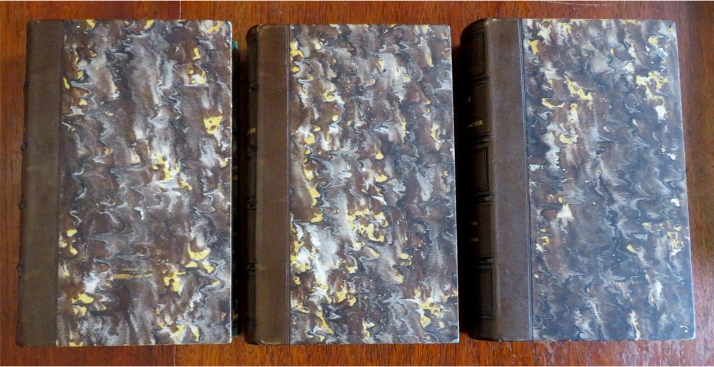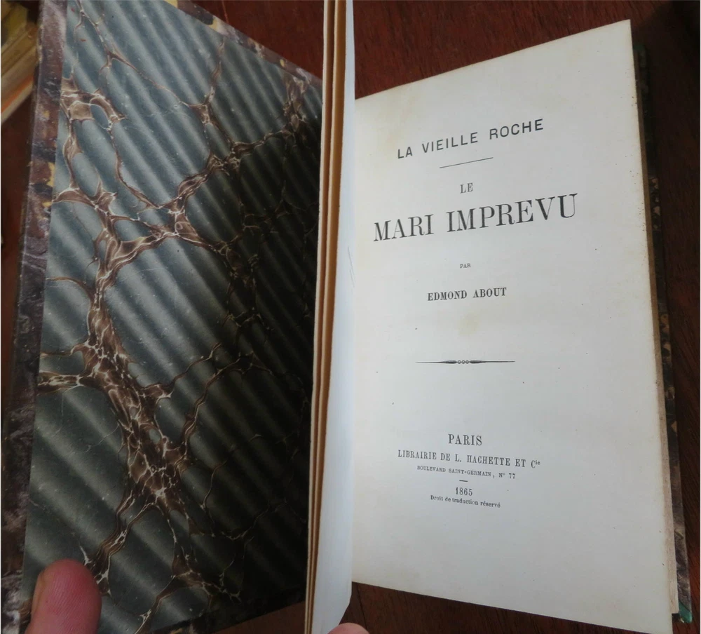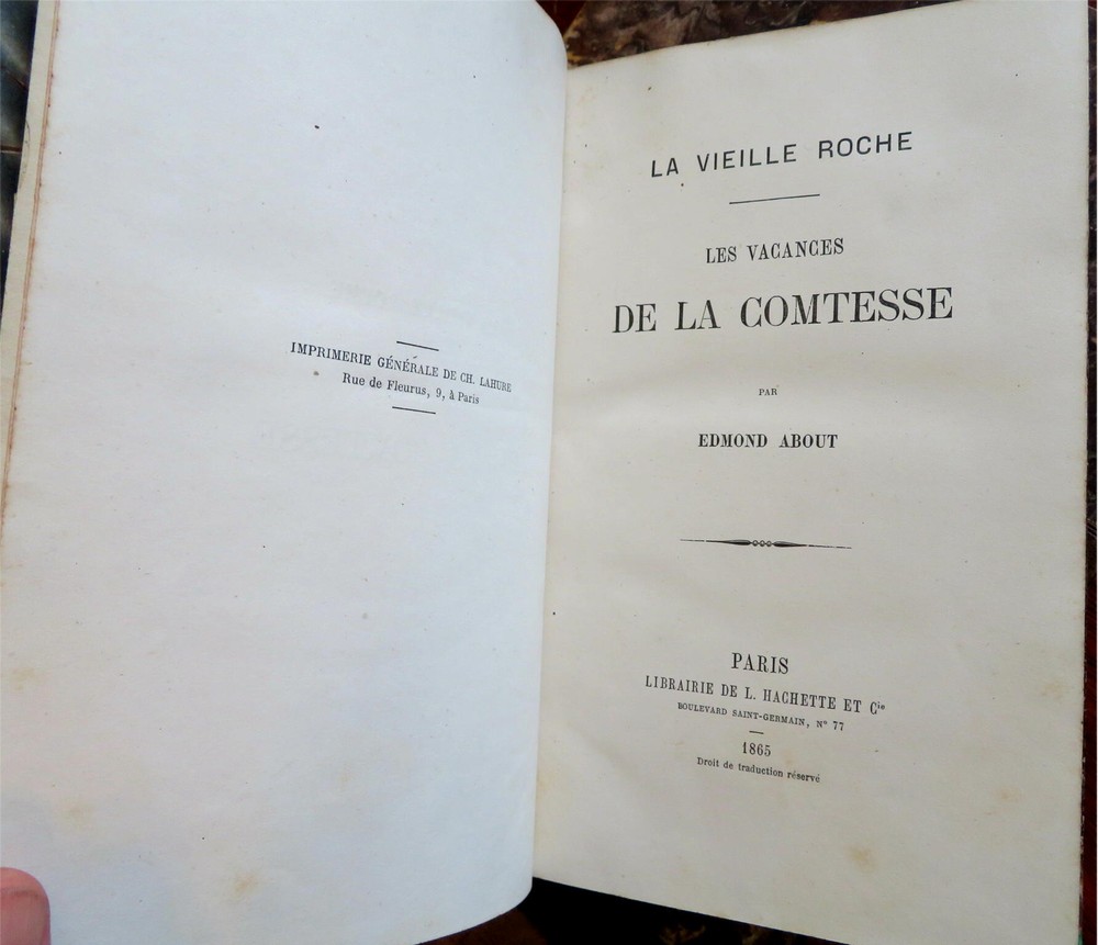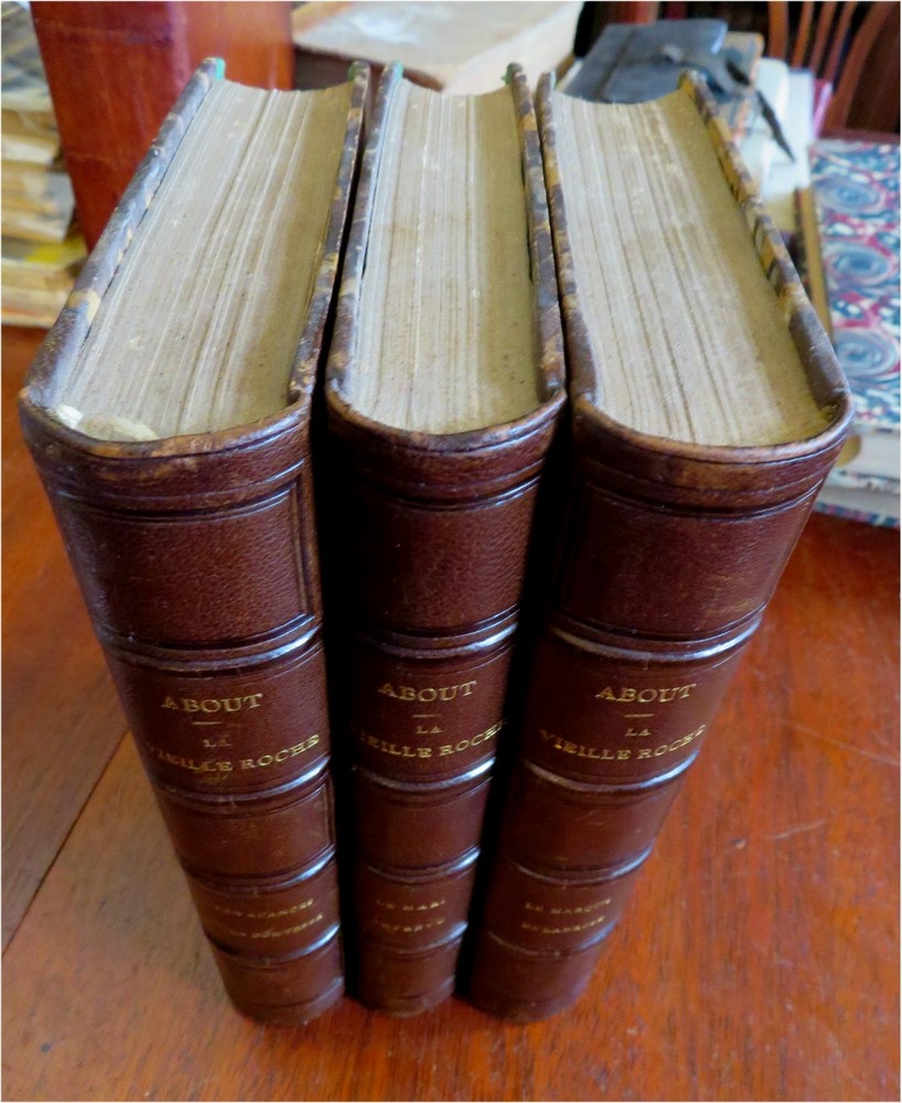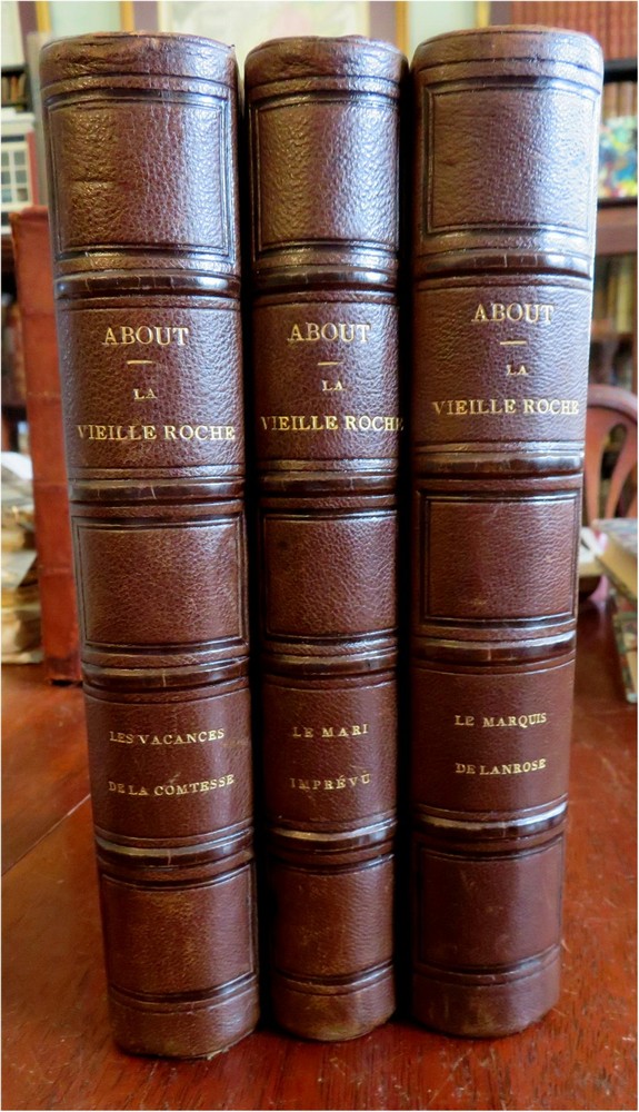 La Vieille Roche Edmond About French Literature 1865 lovely 3 vol. leather set La Vieille Roche Edmond About French Literature 1865 lovely 3 vol. leather set (Old Books, 19th Century Books, French Books, Leather Books, French Literature). La Vieille Roche by Edmond About. Published 1865, Paris by L. Hachette Et Cie. 3 volumes, 500 pages. Text in French. Attractive antiquarian 1/4 leather binding, raised bands, gilt title lettering, embossed ruled compartments, marbled covers & end papers. Set is physically old and shows some signs of handling and time. Bindings gently age worn but still appealing, leather and joints slightly rubbed but still supple, set remains overall very attractive as an object. Text block paper is age toned as typical, scattered light to moderate age spotting/ foxing, internally set remains mostly clean, tight and sound. A set which has been taken care of but may/ does not look like new. Still attractive on the shelf. Set displays a pleasing and unique age patina and is in rather nice antiquarian condition, any age flaws seem easy to overlook or forgive. Please review photos for more detailed attempt to present this nice mid-19th century set as it survives. We often over-describe any flaws that many sellers would not even bother to mention since most people would overlook them as minor and unworthy of comment. Many people tell us the books they receive from us are nicer in person than they appears on the screen. We want you to be clear about what you are buying, so we take numerous photos and try to describe it openly and honestly. Books Measure c. 9" H x 5" W. [B9179].