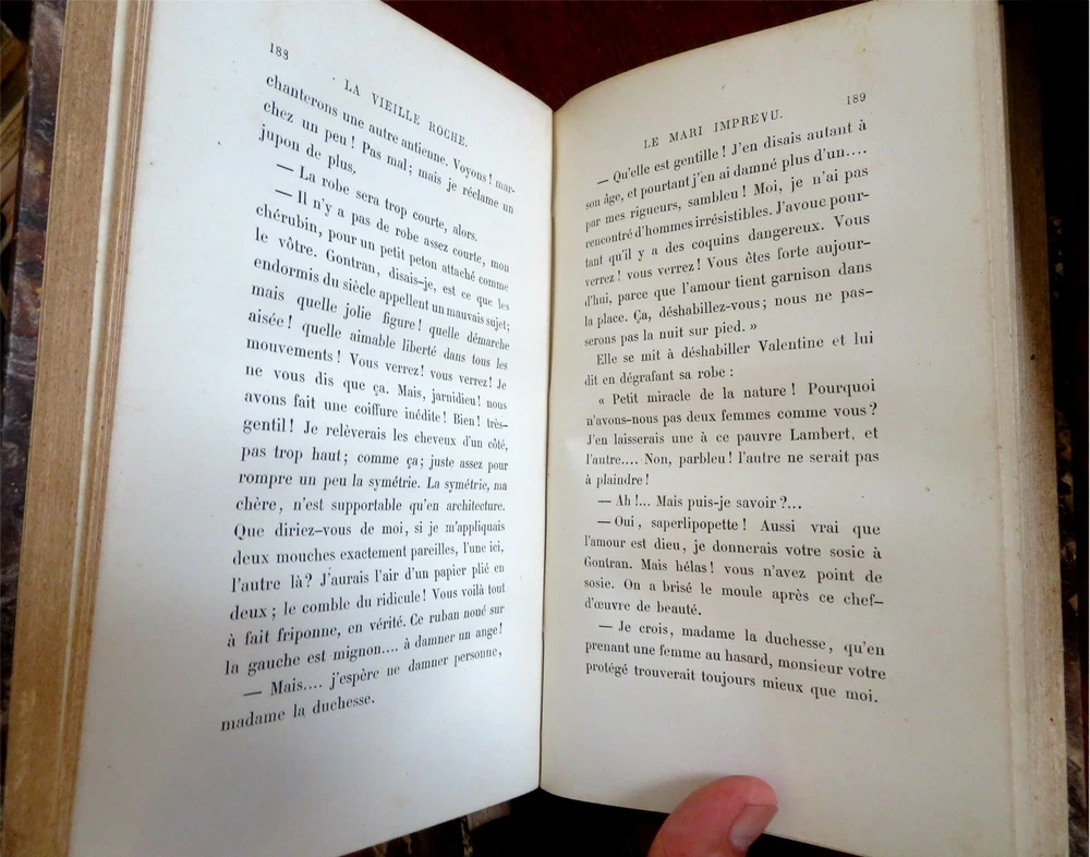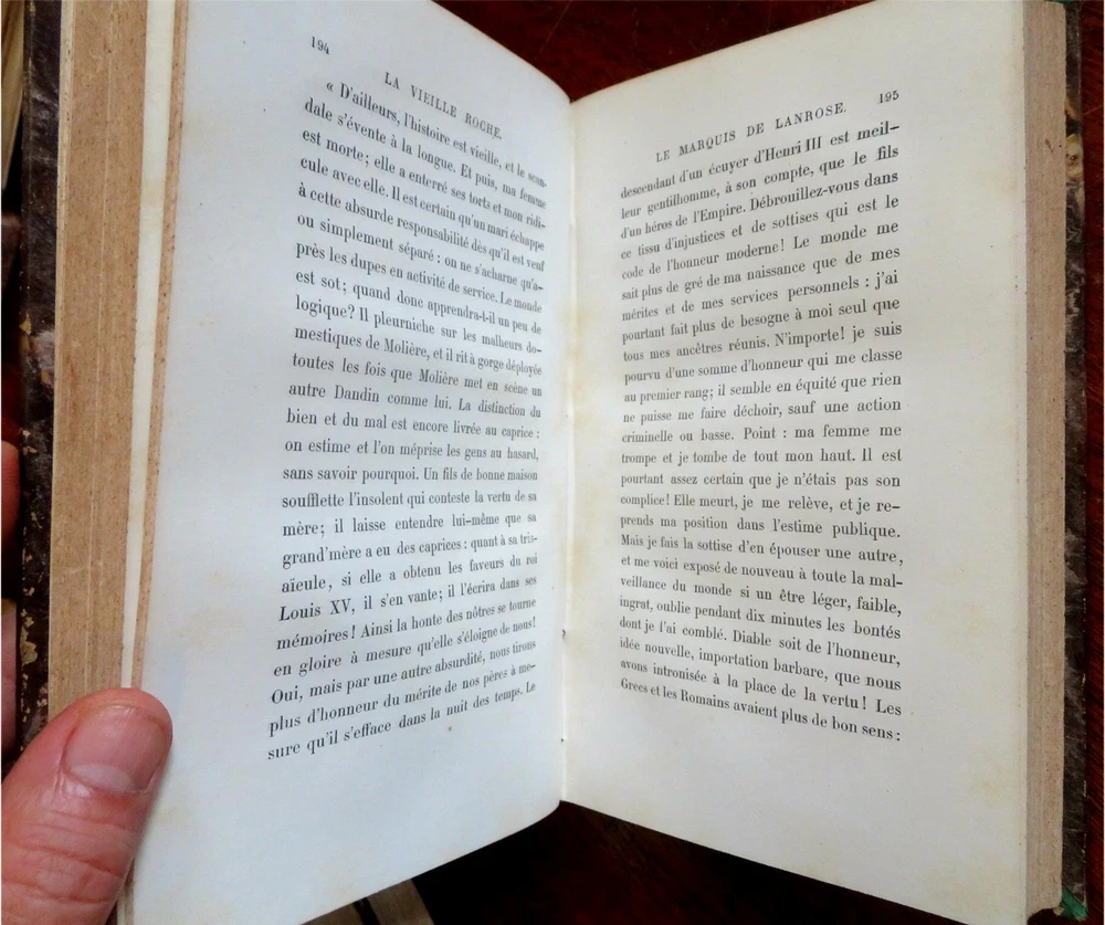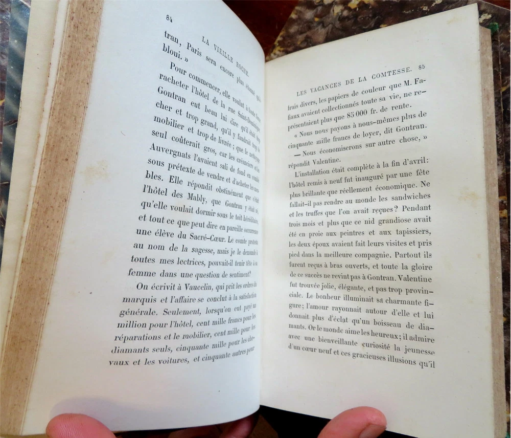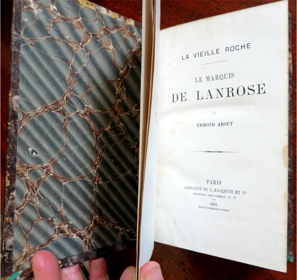 La Vieille Roche Edmond About French Literature 1865 lovely 3 vol. leather set La Vieille Roche Edmond About French Literature 1865 lovely 3 vol. leather set (Old Books, 19th Century Books, French Books, Leather Books, French Literature). La Vieille Roche by Edmond About. Published 1865, Paris by L. Hachette Et Cie. 3 volumes, 500 pages. Text in French. Attractive antiquarian 1/4 leather binding, raised bands, gilt title lettering, embossed ruled compartments, marbled covers & end papers. Set is physically old and shows some signs of handling and time. Bindings gently age worn but still appealing, leather and joints slightly rubbed but still supple, set remains overall very attractive as an object. Text block paper is age toned as typical, scattered light to moderate age spotting/ foxing, internally set remains mostly clean, tight and sound. A set which has been taken care of but may/ does not look like new. Still attractive on the shelf. Set displays a pleasing and unique age patina and is in rather nice antiquarian condition, any age flaws seem easy to overlook or forgive. Please review photos for more detailed attempt to present this nice mid-19th century set as it survives. We often over-describe any flaws that many sellers would not even bother to mention since most people would overlook them as minor and unworthy of comment. Many people tell us the books they receive from us are nicer in person than they appears on the screen. We want you to be clear about what you are buying, so we take numerous photos and try to describe it openly and honestly. Books Measure c. 9" H x 5" W. [B9179].