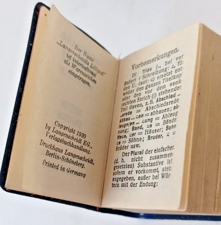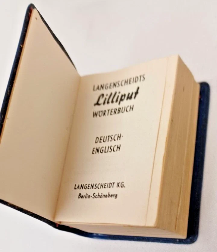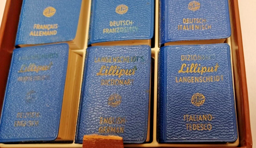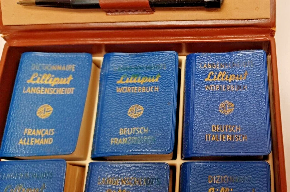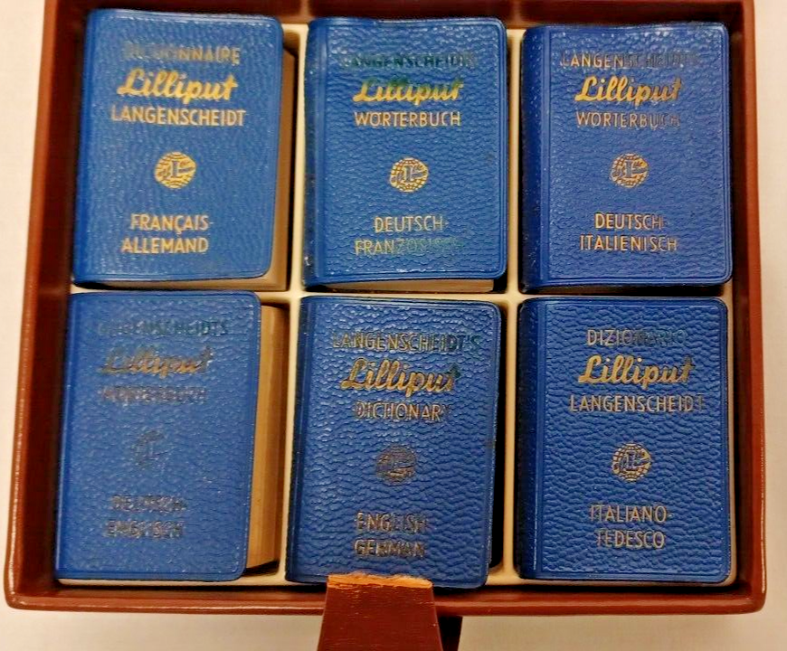 Langenscheidt Lilliput Dictionnaires Miniature Set in Leather Case 1930. Includes the following (6) books: (1) Francais-Allemand. (1) Deutsch-Franzosisch. (1) Deutsch-Italienisch. (1) Deutsch-English. (1) English-German. (1) Italiano-Tedesco. By Langenscheidt, Germany, 1930. Case approx. 5-1/8" x 4-1/2" x 1-1/4". Good condition. Clasp is broken on leather case and case has some edgewear. Deutsch to English book has the cover fastened to book upside down. Some of the blue covers are loose on the books. See pictures attached. DI E-2