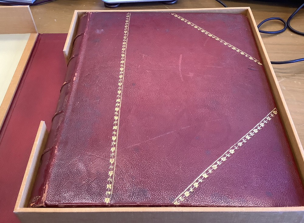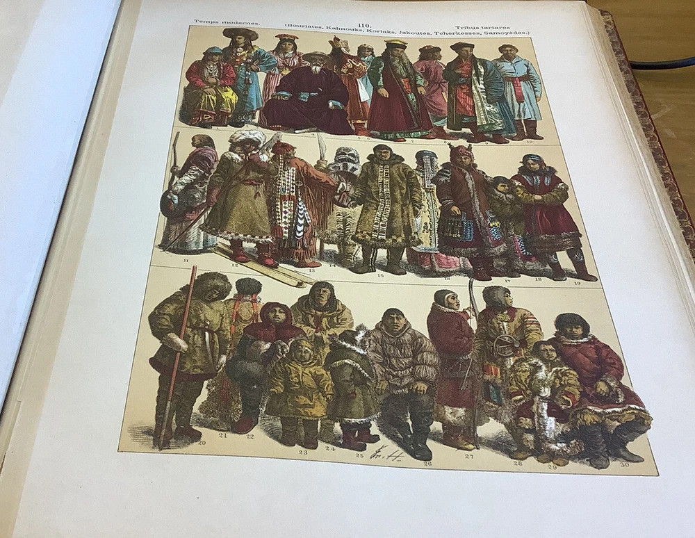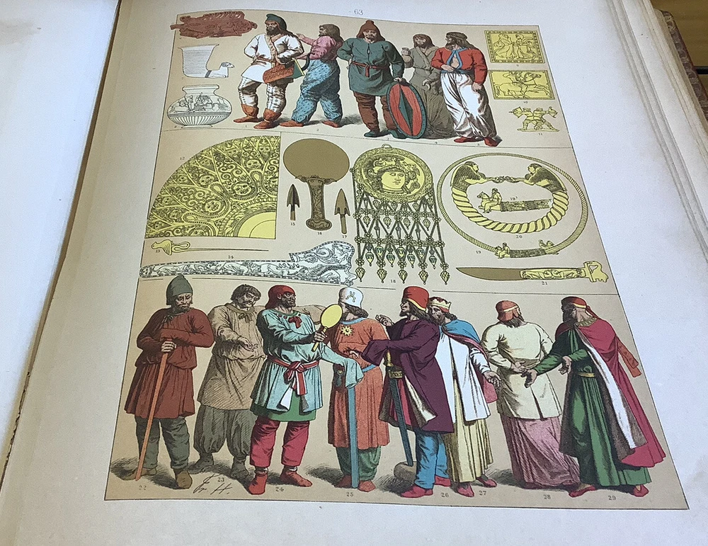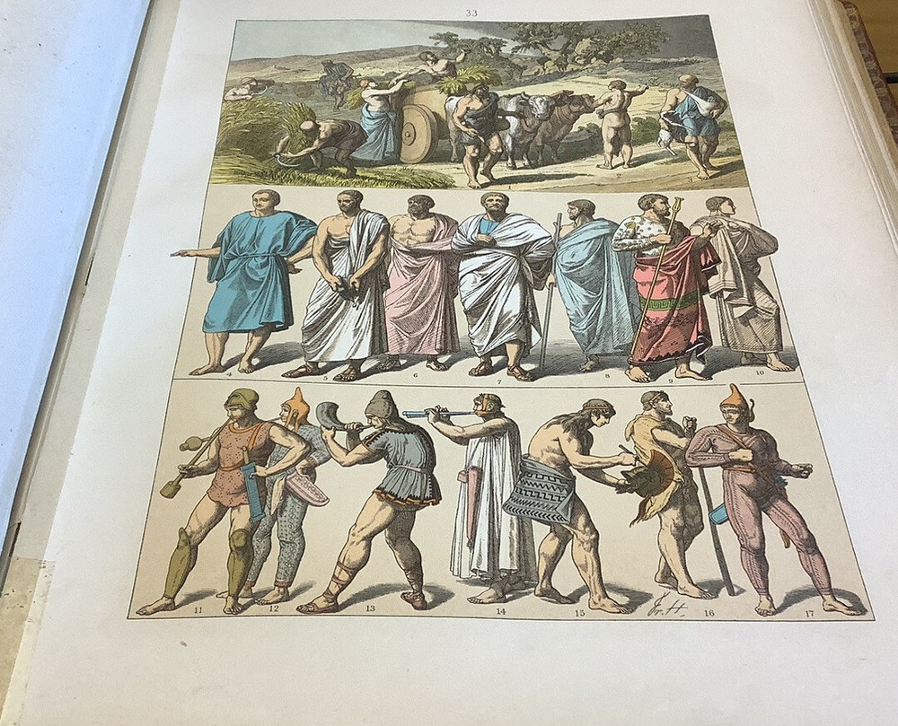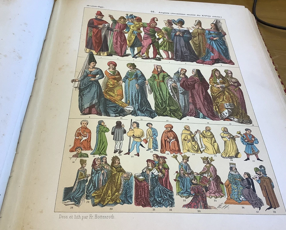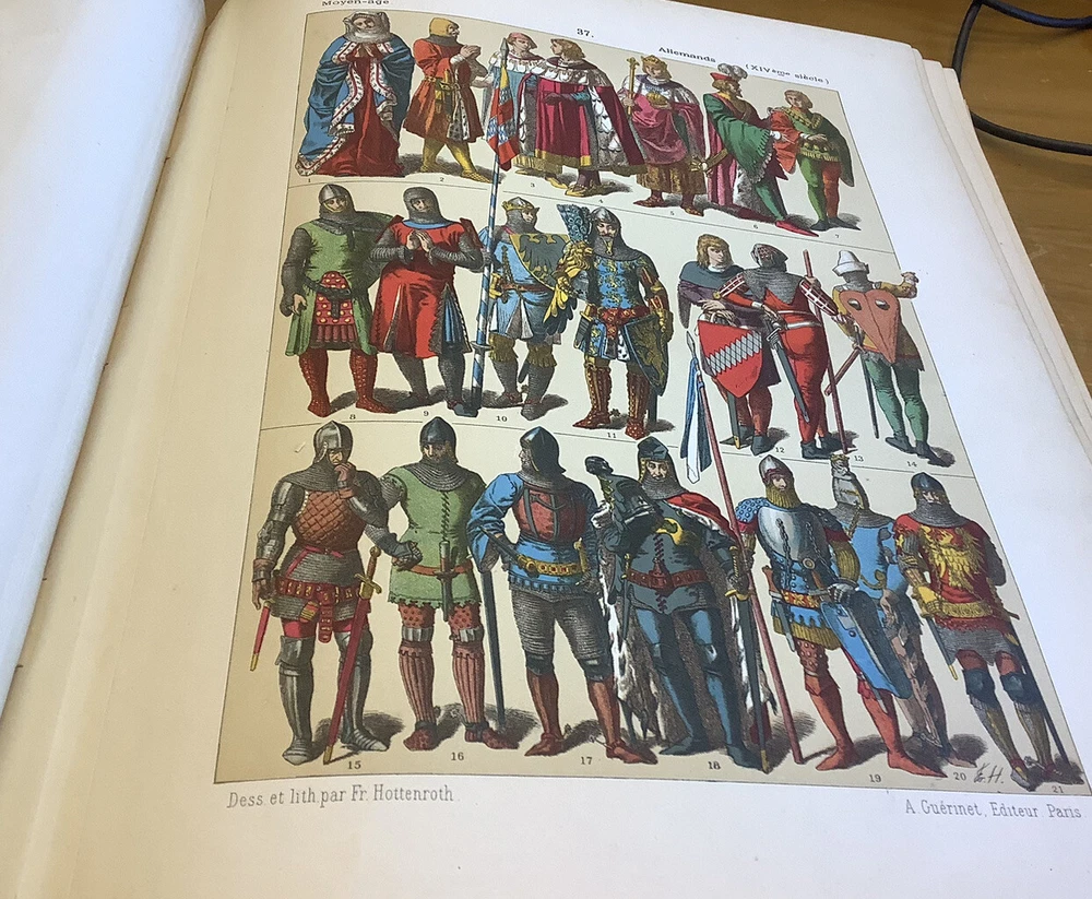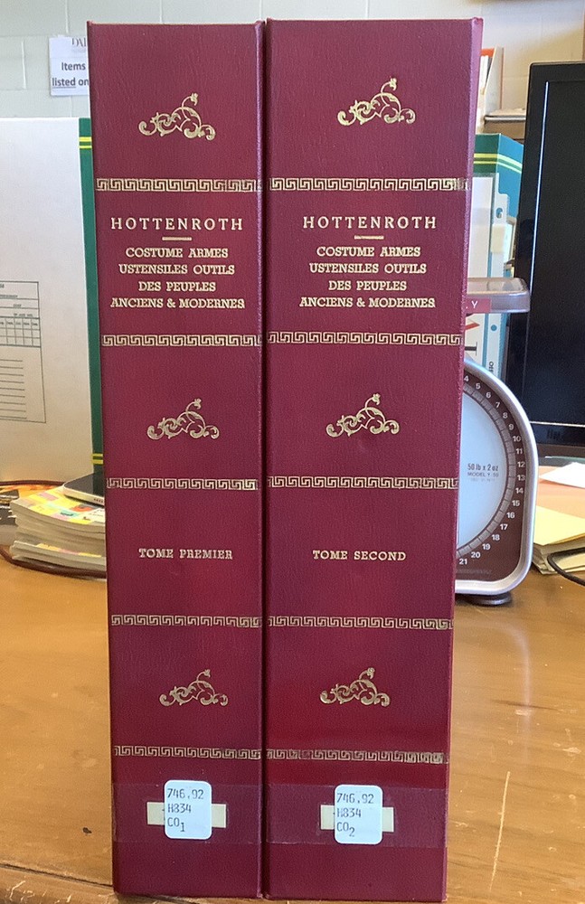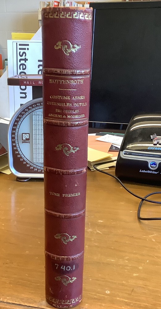 Lovely antique 2 volume set in good condition and preserved with individual heavy duty boxes. The covers are red leather with gold gilded accents. Undated, but probably published around 1890. Color illustrations, light foxing. Full title is Le Costume, Les Armes, Le Bijoux, La Ceramique, Les Utensiles, Outils, Objets Mobiliers. Tome Premier and Tome Second. Feel free to email with questions. I do combine shipping on multiple orders. Have a great day!