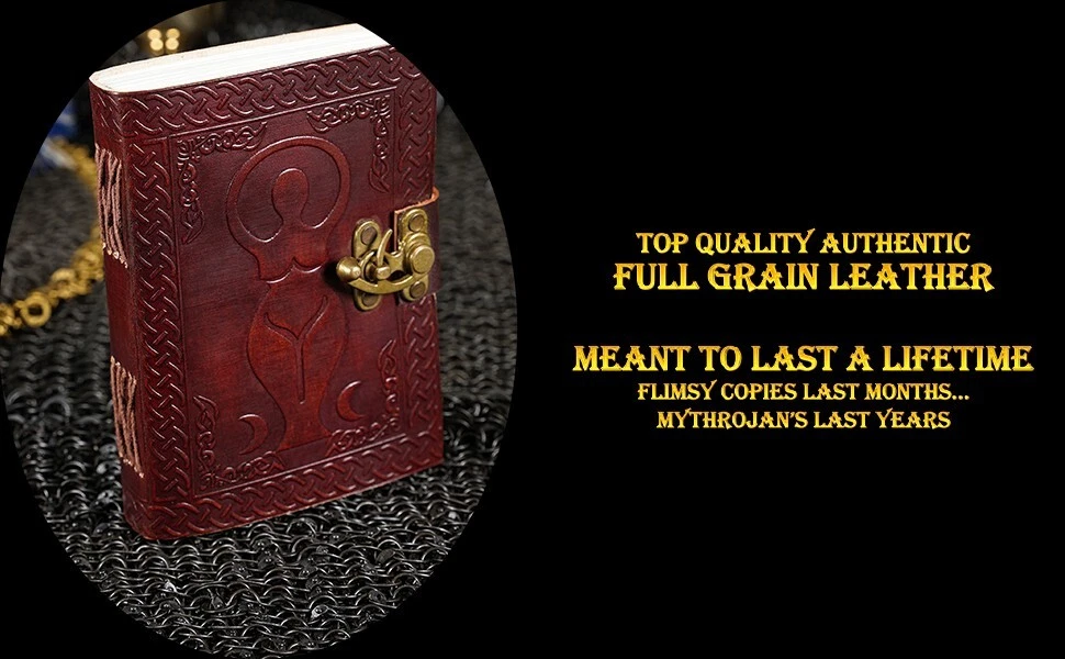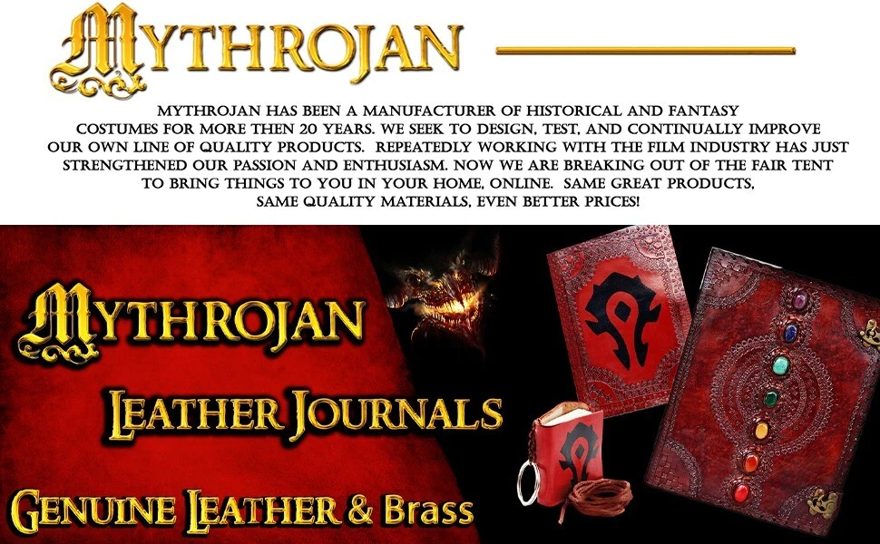 Medieval Leather Journal Brown Diary Paper Notebook with Lockable Book Closure - Pack of 2 ⭐ IDEAL SIZE ♦♦ 7" x 5" Perfect Size for Pocket, Pouch, Or Purse ♦♦ Its compact size makes it easy to carry around or slip into a bag but big enough to express all your creativity! ⭐ 100% HANDCRAFTED FROM THE BEST LEATHER: Reminiscent of medieval manuscript our leather journals are only crafted from the finest, supple split leather and richly embossed to give them their ELEGANT MEDIEVAL LOOK: every single of our leather journals is built-to-last and 100% handmade to ensure both authentic look and unique vintage decorative appeal ♦♦ ⭐ CAPTURE AND SHARE YOUR IDEA BEFORE THEY FLY AWAY: our beautiful leather notebook journal can be used as an appointment book, daily diary, travel journal/notebook/sketchbook for yourself, families and friends… Or easily become the key accessory in your next costume or cosplay! ⭐ Natural And Recycled Materials ♦♦ Compatible with Any Kind Of Ink. ♦♦ Acid free, Chemical free, Archival Quality ♦♦ Handmade Recycled Cotton Blank Paper Compatible With Multiple Mediums ♦♦ Unique high quality embossing. ⭐ LIFETIME GUARANTEE ♦♦ Providing you with high-quality products is what we do, and your FULL SATISFACTION and happiness are of utmost importance to us! All warranty issues are handled directly by Mythrojan. If you receive something that is not up to your expectations, CONTACT US, and we will work with you to resolve the problem. If, over time, a Mythrojan product no longer lives up to your expectations, CONTACT US, and we will work with you to assure SATISFACTION! About Us: Mythrojan has been a manufacturer of historical and fantasy costumes for more than 20 years. We seek to design, test and continually improve our own line of quality products. Repeatedly working with the film industry has just strengthen our passion and enthusiasm. Now we are breaking out of the fair tent to bring things to you in your home, online. Same great products, same quality materials, even better prices! Shipping: Most orders will ship out within 1-2 business days of ordering. Your order will be shipped with Standard Service. Once shipped, orders are generally received within 7 business days. We do not ship on Saturdays, Sundays, or holidays. While we will do all we can to ensure your order is delivered on time. Mythrojan cannot be held responsible for conditions beyond our control such as severe weather, service interruptions, etc. Return Policy: Returns Policy is 30 Days Free Returns based on the original purchase date.