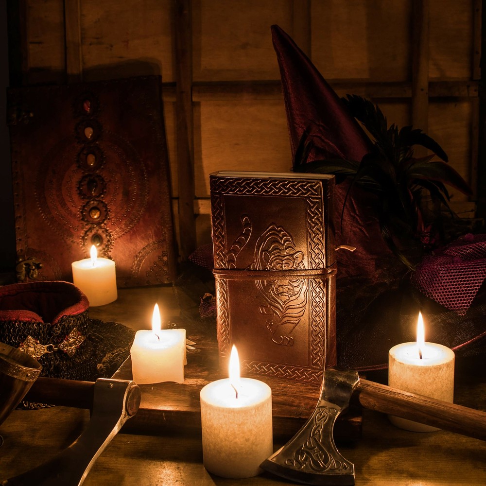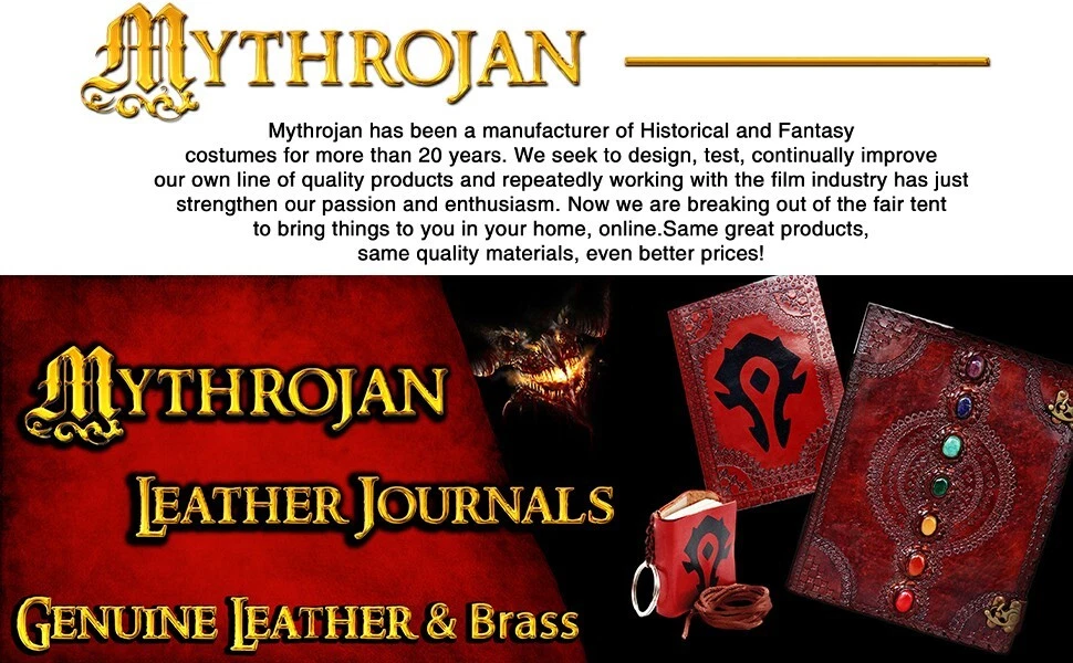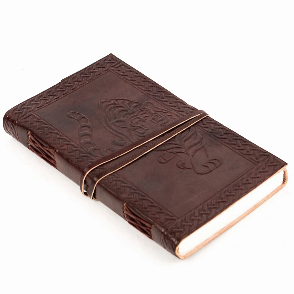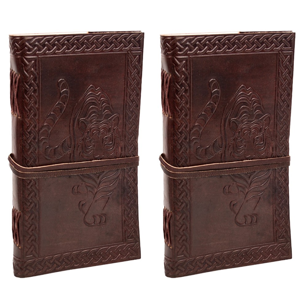 Leather Journal Notebook Brown Tiger Cover Embossed with Leather Cord Closure - Pack of 2 ⭐ IDEAL SIZE ♦♦ 9" x 5" Perfect Size for Pocket, Pouch, Or Purse ♦♦ Its compact size makes it easy to carry around or slip into a bag but big enough to express all your creativity! ⭐ 100% HANDCRAFTED FROM THE BEST LEATHER: Reminiscent of medieval manuscript our leather journals are only crafted from the finest, supple split leather and richly embossed to give them their ELEGANT MEDIEVAL LOOK: every single of our leather journals is built-to-last and 100% handmade to ensure both authentic look and unique vintage decorative appeal ♦♦ ⭐ CAPTURE AND SHARE YOUR IDEA BEFORE THEY FLY AWAY: our beautiful leather notebook journal can be used as an appointment book, daily diary, travel journal/notebook/sketchbook for yourself, families and friends… Or easily become the key accessory in your next costume or cosplay! ⭐ Natural And Recycled Materials ♦♦ Compatible with Any Kind Of Ink. ♦♦ Acid free, Chemical free, Archival Quality ♦♦ Handmade Recycled Cotton Blank Paper Compatible With Multiple Mediums ♦♦ Unique high quality embossing. ⭐ LIFETIME GUARANTEE ♦♦ Providing you with high-quality products is what we do, and your FULL SATISFACTION and happiness are of utmost importance to us! All warranty issues are handled directly by Mythrojan. If you receive something that is not up to your expectations, CONTACT US, and we will work with you to resolve the problem. If, over time, a Mythrojan product no longer lives up to your expectations, CONTACT US, and we will work with you to assure SATISFACTION! About Us: Mythrojan has been a manufacturer of historical and fantasy costumes for more than 20 years. We seek to design, test and continually improve our own line of quality products. Repeatedly working with the film industry has just strengthen our passion and enthusiasm. Now we are breaking out of the fair tent to bring things to you in your home, online. Same great products, same quality materials, even better prices! Shipping: Most orders will ship out within 1-2 business days of ordering. Your order will be shipped with Standard Service. Once shipped, orders are generally received within 7 business days. We do not ship on Saturdays, Sundays, or holidays. While we will do all we can to ensure your order is delivered on time. Mythrojan cannot be held responsible for conditions beyond our control such as severe weather, service interruptions, etc. Return Policy: Returns Policy is 30 Days Free Returns based on the original purchase date.