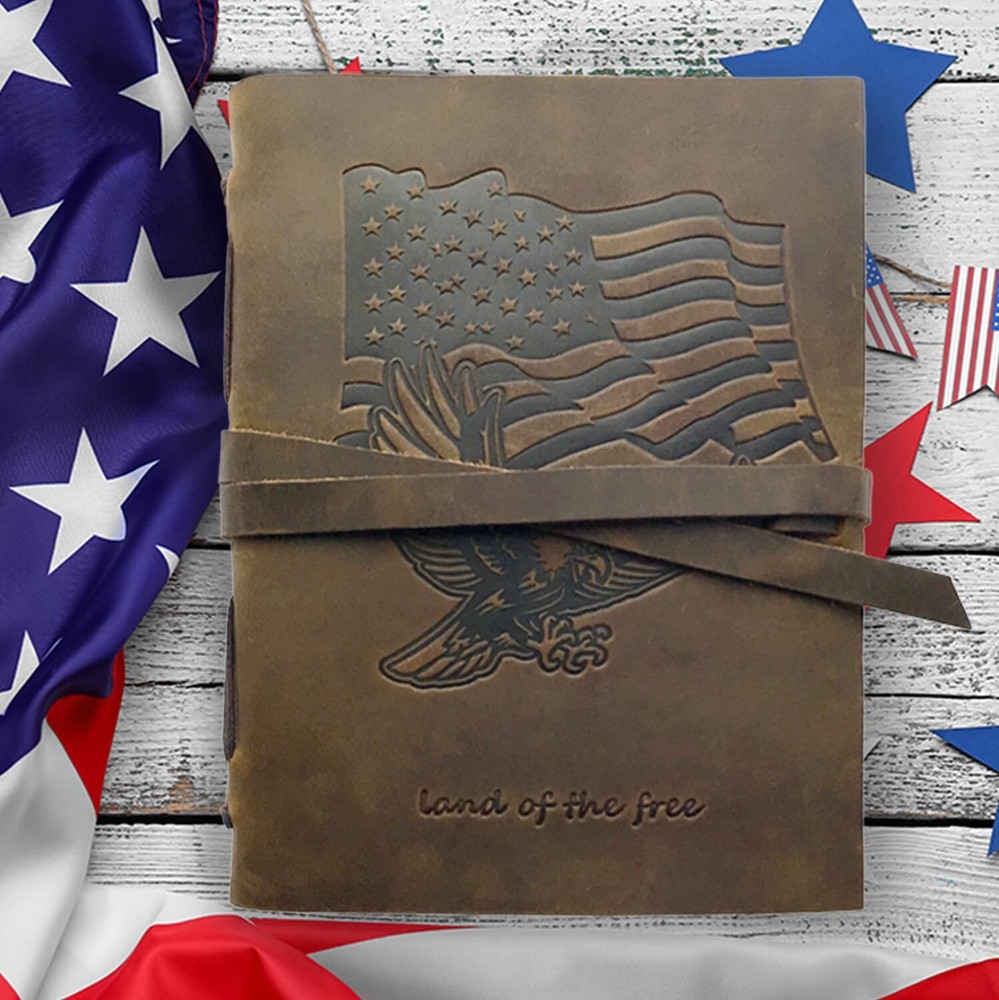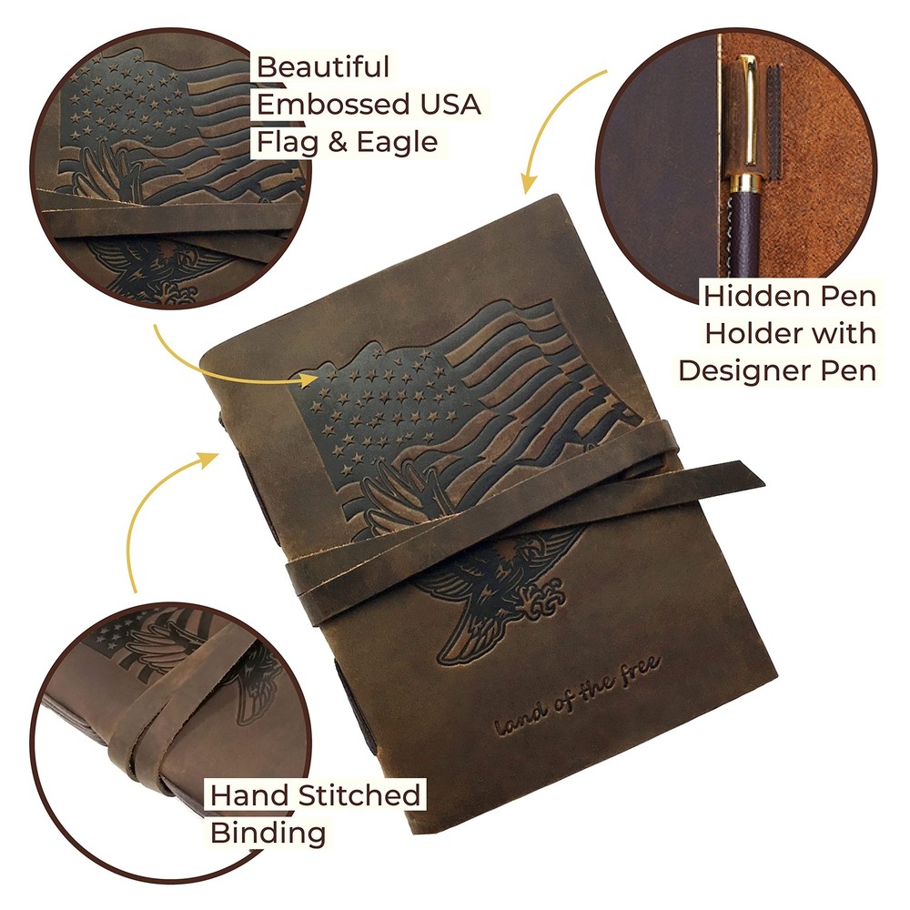 Leather Bound Journal for Men and Women, Handmade Patriotic Gift Set with USA Flag and Eagle Embossed Journal and Stylish Pen, Vintage Notebook, Sketchbook, Planner and Diary A5 (300 Pages) (7x5") Description Features: UNIQUE GIFT SET: Handmade leather journal with beautiful USA flag and Eagle embossed front soft cover with matching bookmark, designer pen and hidden pen holder. Presented in an eco-friendly recycled box. A timeless gift for that patriotic someone who loves to write. PREMIUM LEATHER: Crafted with delicate yet super tough buffalo leather, including a long strap that secures the journal firmly. Our genuine leather is thicker than competitors and offers lifetime durability with lasting softness. RUSTIC DESIGN: Achieves a unique and distressed look when scratched and features decorative stitching for added charm. Coated with special natural oils that make handling a joy. Plus, it has a wonderful authentic leather smell that inspires you to write daily. QUALITY CREAM PAPER: 300 premium unlined multipurpose sheets for notes, daily plans, sketches, inspiring ideas, memories and more. Zero bleed through with fountain pens. Not refillable. PERFECT SIZE: Designed with a choice of two sizes - 7x5" or 8x6" to suit a wide range of writing styles. We also offer many other sizes and styles of journals, including refillable journals. There's something for everyone! Product Details: Brand: Sovereign-Gear Color: Brown Theme: Book Sheet Size: A5 Pages: 300 Cover Material: Leather Style: USA Flag Ruling Type: Plain Special Feature: Soft cover Number of Items: 1 Manufacturer: Sovereign-Gear Brand: Sovereign-Gear Item Weight: 1.18 pounds Product Dimensions: 6.69 x 1.97 x 8.46 inches Color: Brown Cover Material: Leather Material Type: Leather Number of Items: 1 Size: 7" x 5" Ruling: Plain Sheet Size: A5 Manufacturer Part Number: SG-US_Flag-Journal-8x6 Date First Available: December 19, 2021 Handling We will ship all orders within 3 business day of payment. Delivery We Do Not Ship Outside of the Continental US. Return Policy All items qualify for returns within 30 days of receipt. Buyer is responsible for return shipping on any item that is not damaged. Feedback We take our reputation seriously, we buy and sell online, so we understand the value of trust. If you are unsatisfied with your order, please contact us and we will work with you to resolve it to your satisfaction.